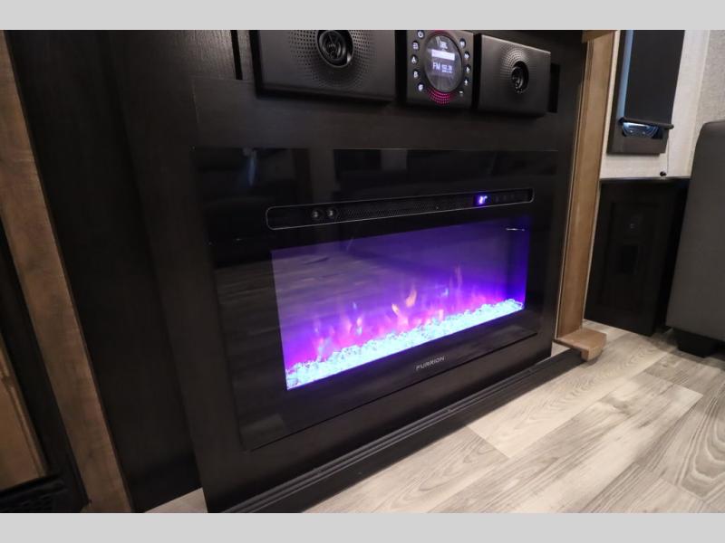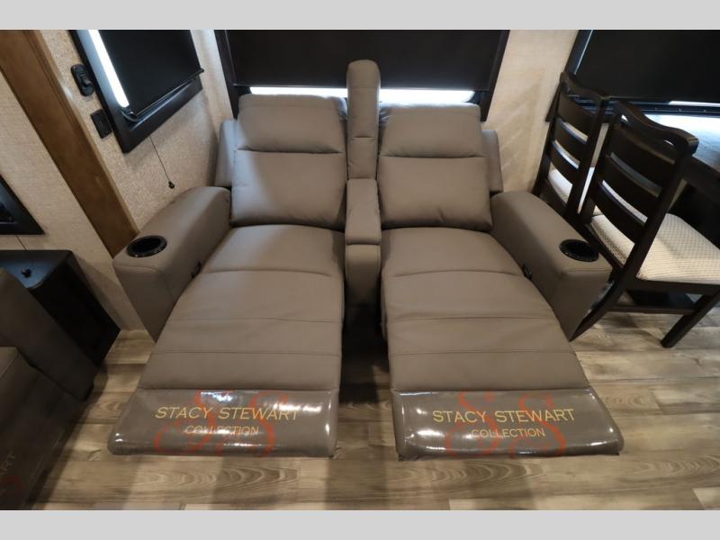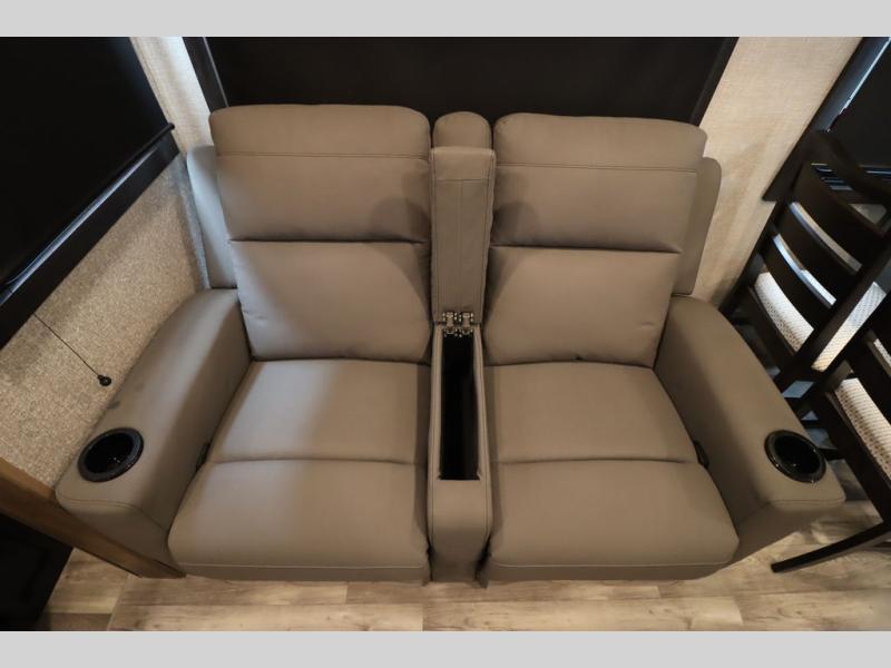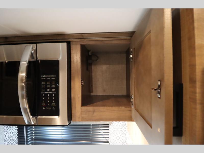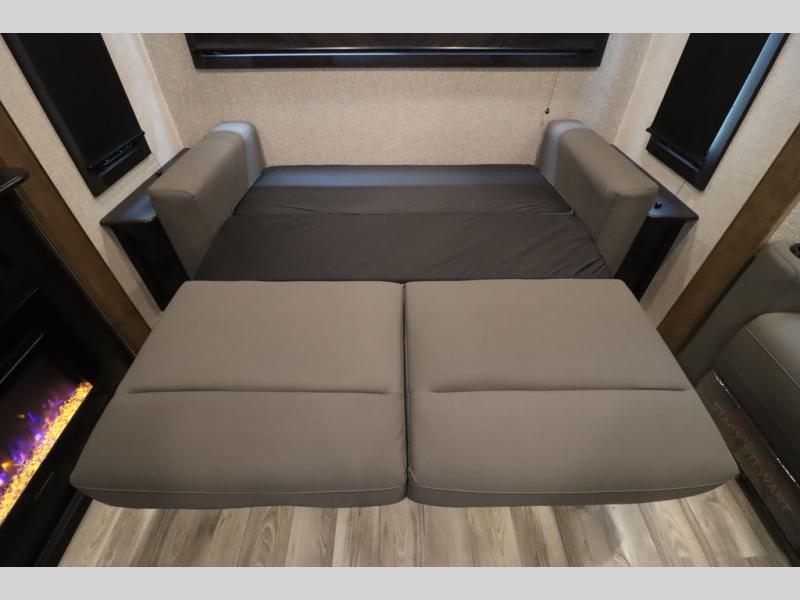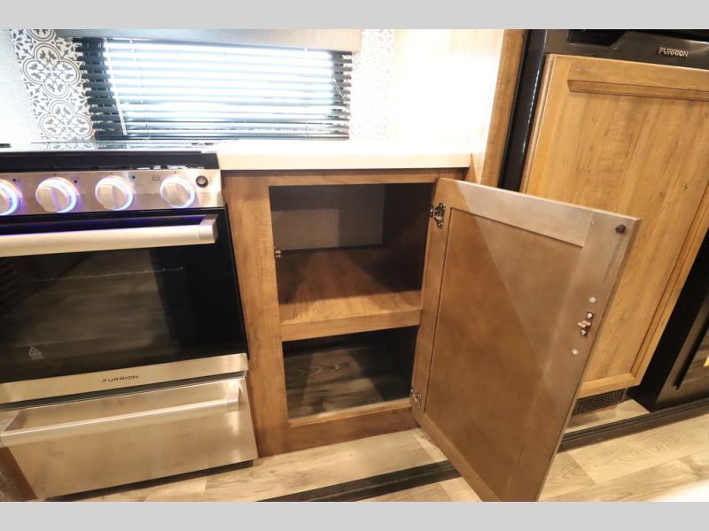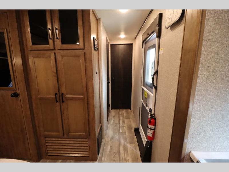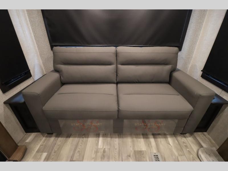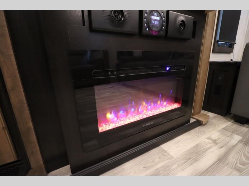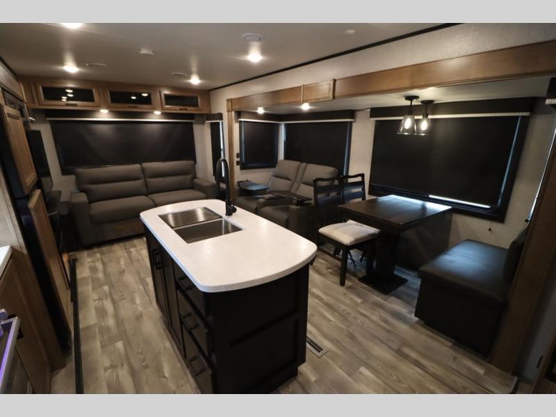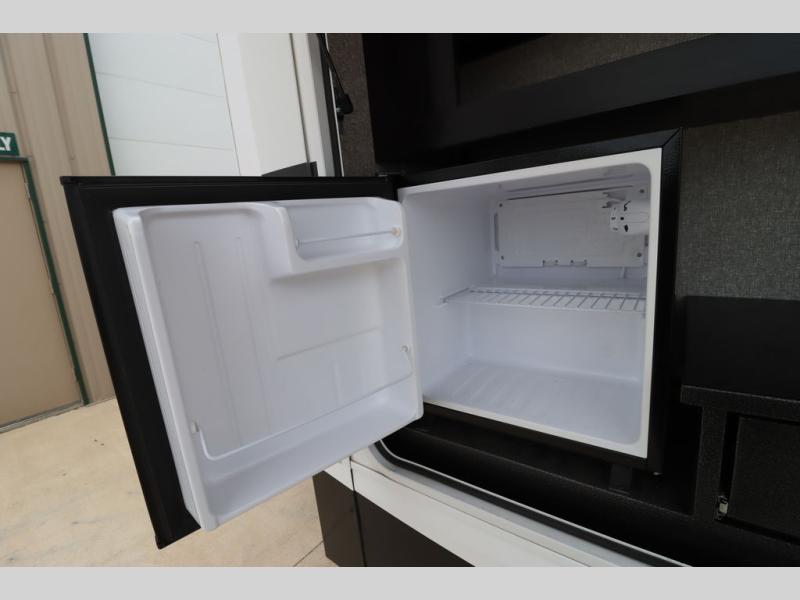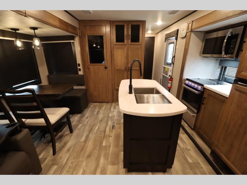 This travel trailer is perfect for two people who love to go on adventures! Start each morning feeling recharged after sleeping on the queen bed in the front private bedroom, and there is a wardrobe/linen closet with washer/dryer prep if you plan to add a washer and dryer. The coat closet/pantry serves a dual purpose and there is an additional pantry next to it for the rest of your canned goods. The chef can choose to either cook indoors with the three burner stainless steel range and kitchen island or at the outside kitchen with a refrigerator to keep their beverage cold and overhead cabinets for their cooking essentials. Relax each evening in the rear living area with the tri-fold sofa and the theater seating across from an entertainment center with a fireplace!