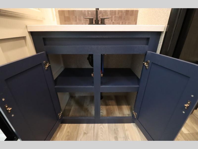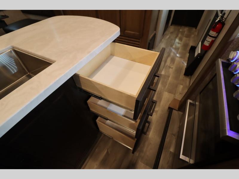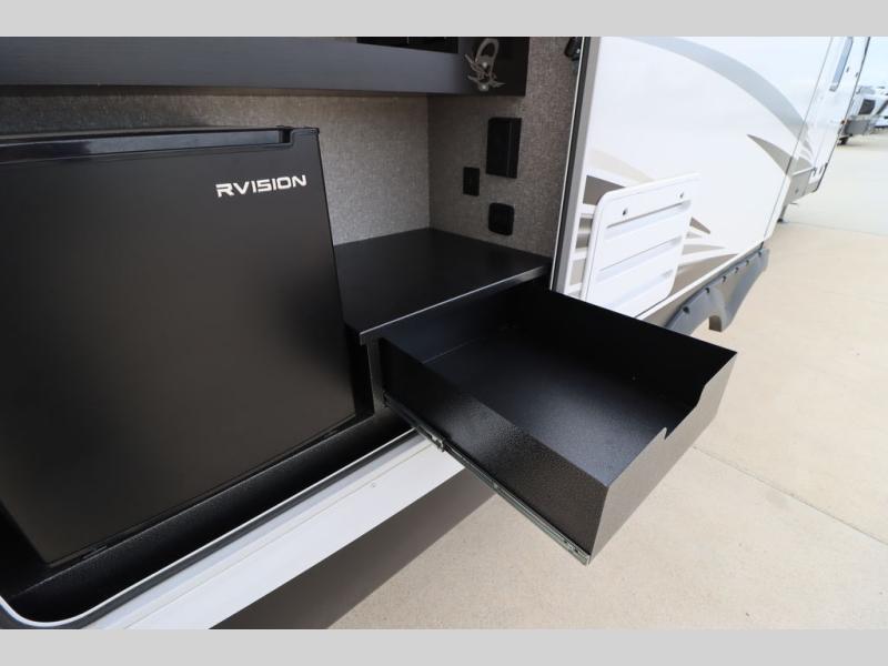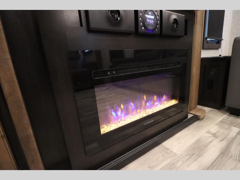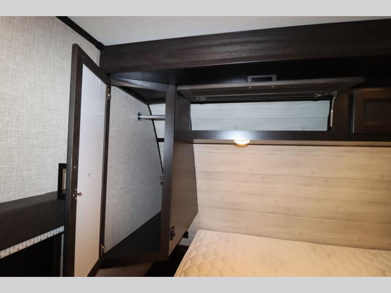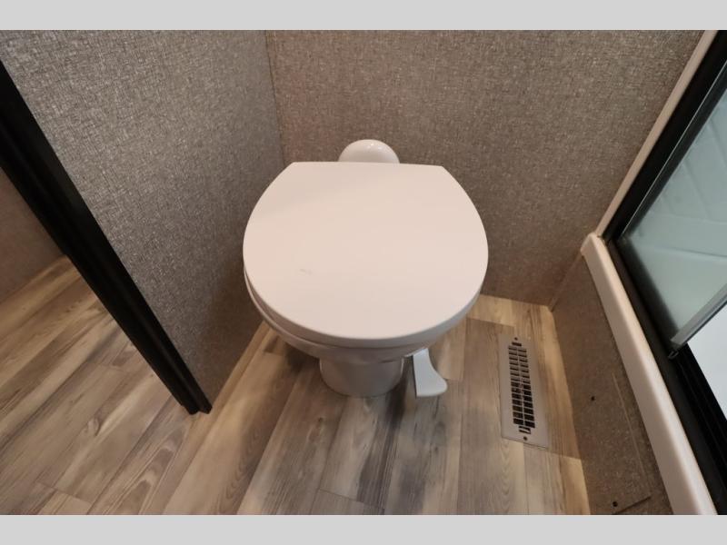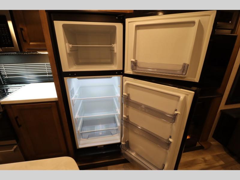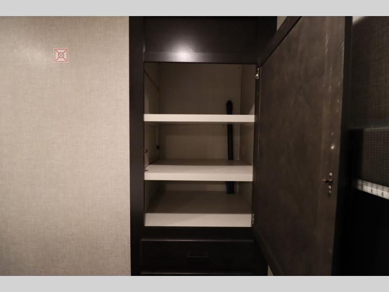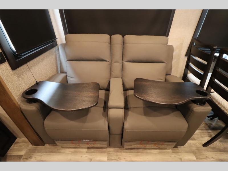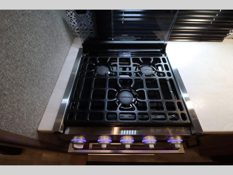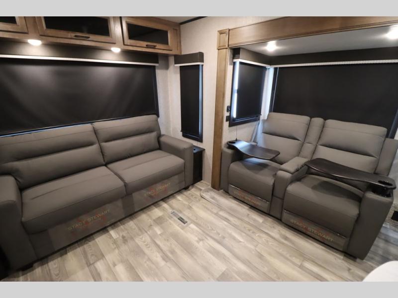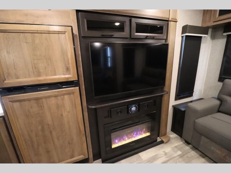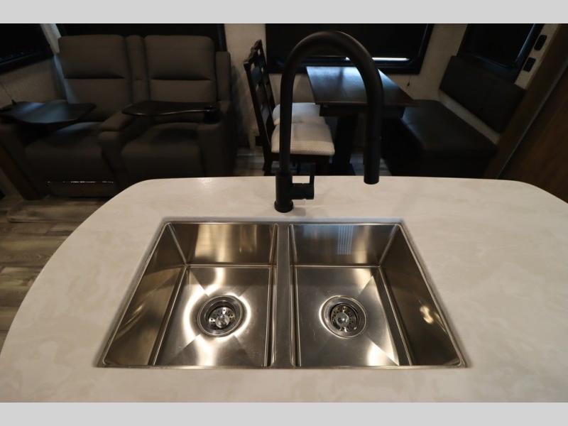 This travel trailer is perfect for two people who love to go on adventures! Start each morning feeling recharged after sleeping on the queen bed in the front private bedroom, and there is a wardrobe/linen closet with washer/dryer prep if you plan to add a washer and dryer. The coat closet/pantry serves a dual purpose and there is an additional pantry next to it for the rest of your canned goods. The chef can choose to either cook indoors with the three burner stainless steel range and kitchen island or at the outside kitchen with a refrigerator to keep their beverage cold and overhead cabinets for their cooking essentials. Relax each evening in the rear living area with the tri-fold sofa and the theater seating across from an entertainment center with a fireplace!