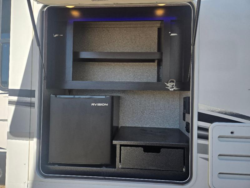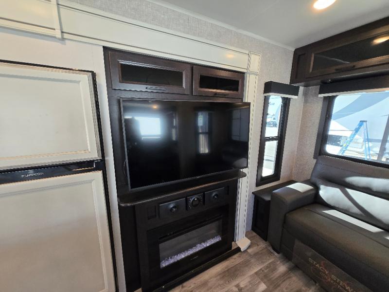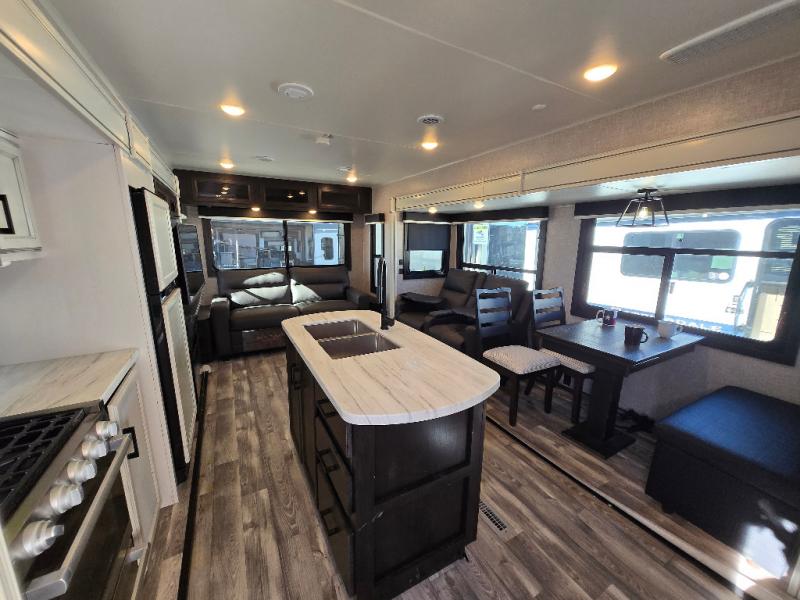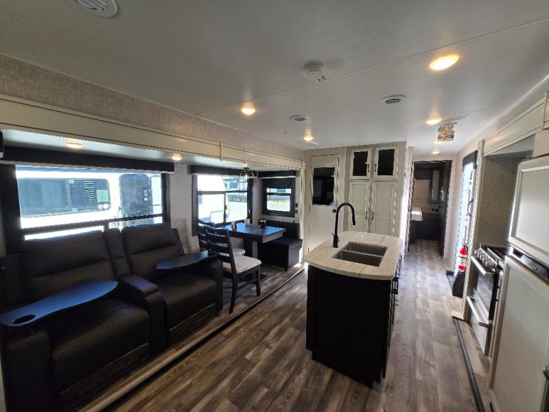 This travel trailer is perfect for two people who love to go on adventures! Start each morning feeling recharged after sleeping on the queen bed in the front private bedroom, and there is a wardrobe/linen closet with washer/dryer prep if you plan to add a washer and dryer. The coat closet/pantry serves a dual purpose and there is an additional pantry next to it for the rest of your canned goods. The chef can choose to either cook indoors with the three burner stainless steel range and kitchen island or at the outside kitchen with a refrigerator to keep their beverage cold and overhead cabinets for their cooking essentials. Relax each evening in the rear living area with the tri-fold sofa and the theater seating across from an entertainment center with a fireplace!