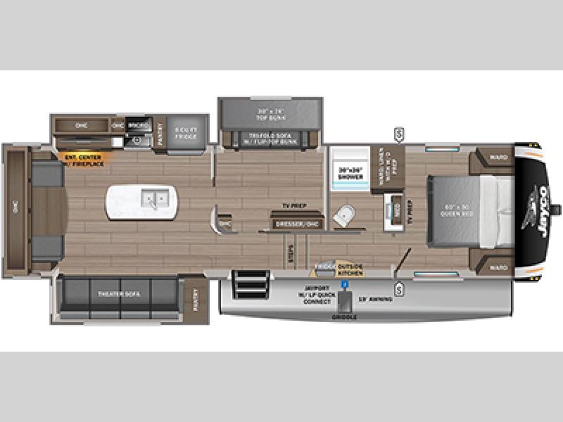 With a front bedroom and a middle bunkhouse, everyone will have a comfortable place to sleep! The front private bedroom has a queen bed with wardrobes on either side and a wardrobe/linen closet, and the dual entry bunkhouse has a 30" x 74" flip-top bunk above a tri-fold sofa and a dresser with overhead cabinets for storage. The kitchen island will make meal prepping easier and you can even cook your meals at the outside kitchen. Grab a snack from one of the two pantries then relax on the theater sofa while watching a movie with the entertainment center which also has a fireplace. The rear U-shaped dinette is great for not only enjoying meals and playing card games, but also for transforming into an extra sleeping space so more can tag along!