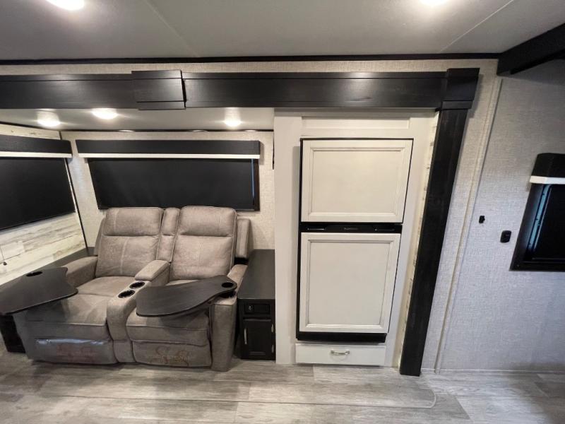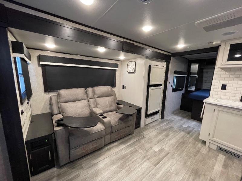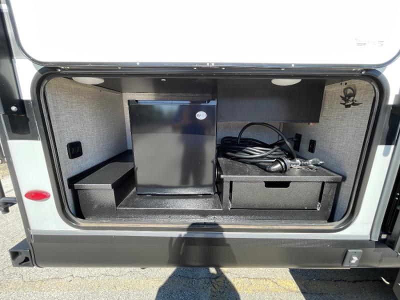 Whether you are a couple or a larger group, this trailer offers a spacious main living and kitchen area as well as rear bathroom for privacy. You will also find linen storage and ample counter space for toiletries. The space savings door even gives you more floor space in both the bathroom and the main area. The single slide holds the U-shaped dinette and refrigerator for even more floor space, the L-shaped kitchen area allows the cook their own space to make meals, and the walk-in pantry is perfect for extra goodies on those longer camping trips. The front bedroom provides privacy as well with its own space saving door, and you can sleep like a queen at night. You can choose a few options if you like such as theater seats in place of the dinette, the Solar Power package, 120V heated tanks pads, and/or an 6 cu. ft. gas/electric refrigerator.