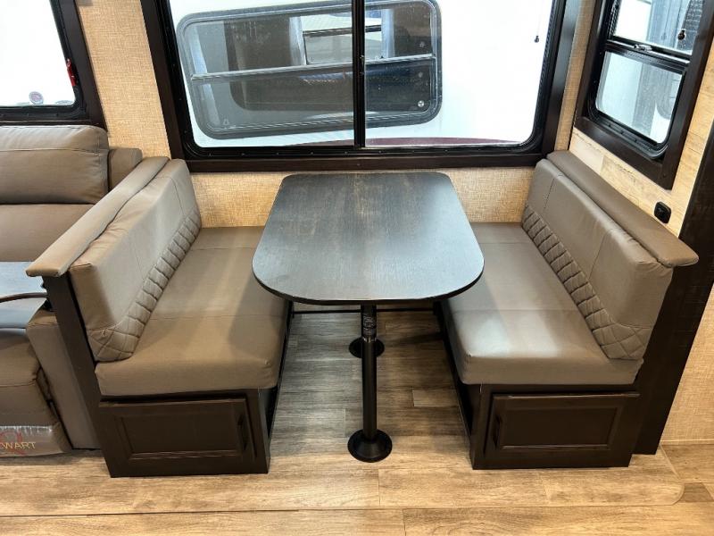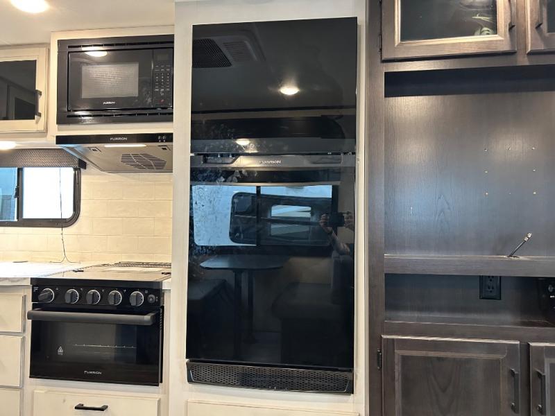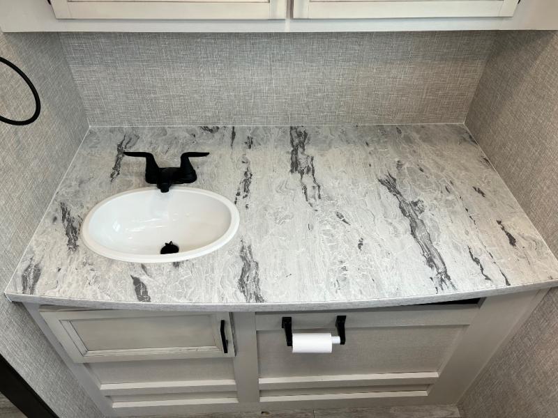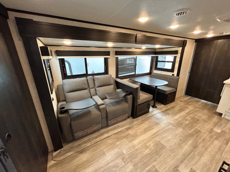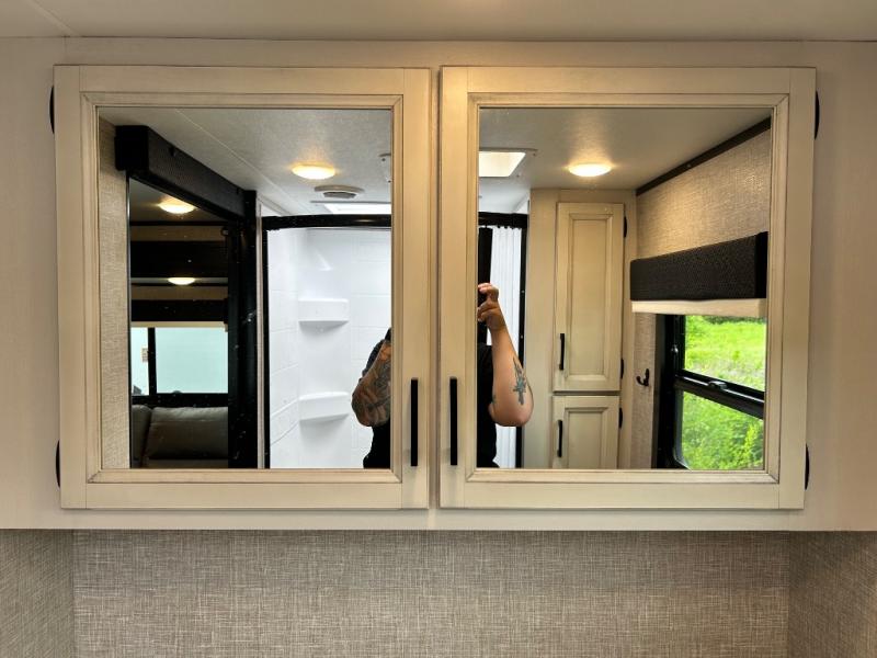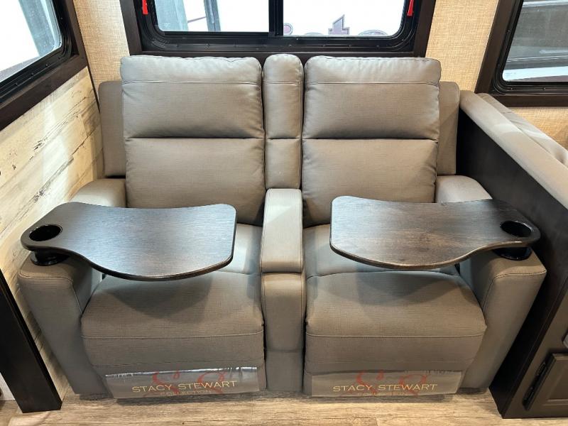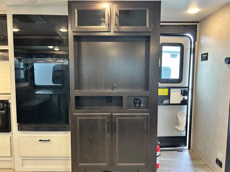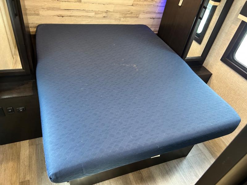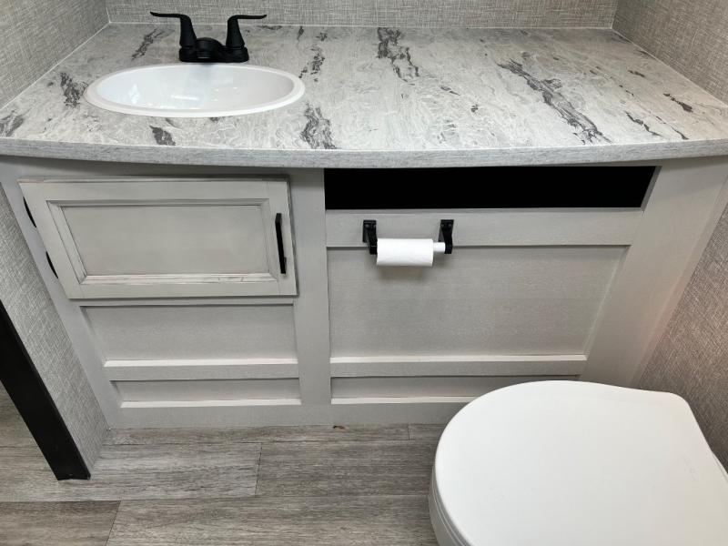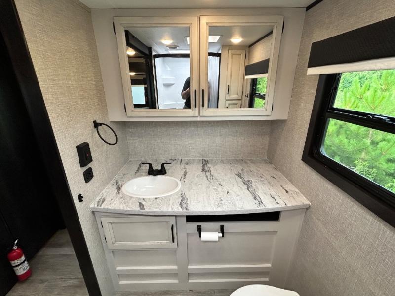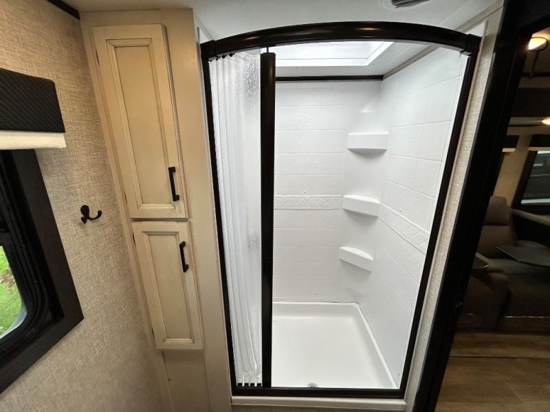 Looking for convenience and privacy in your next RV? Well this full rear bathroom has lots of room for you to move around as you get ready each morning in privacy! The front private bedroom has a walk-around 60" x 75" queen bed with wardrobes on either side to keep your clothes looking their best. You can enjoy home cooked meals while at the campsite thanks to the three burner cooktop and 8 cu. ft. refrigerator, plus there is a walk-in pantry to store all of your favorite snacks. The jackknife sofa and booth dinette within the slide out offer comfortable places to relax, yet you can switch the jackknife sofa out for the optional tri-fold sofa or the optional theater seating. You can even cook breakfast outdoors using the outside kitchen and stay protected from the elements by the 19' power awning!