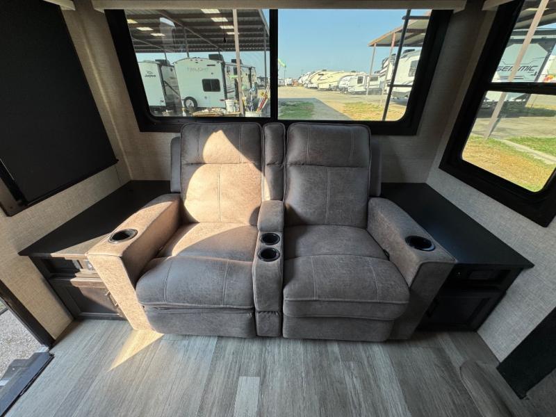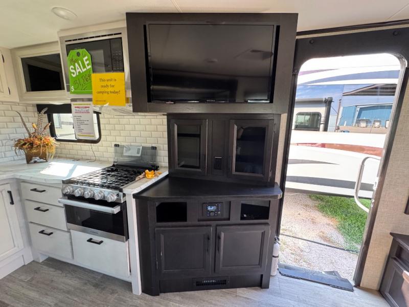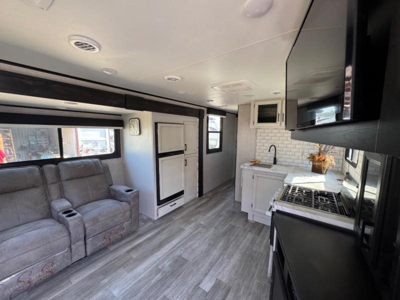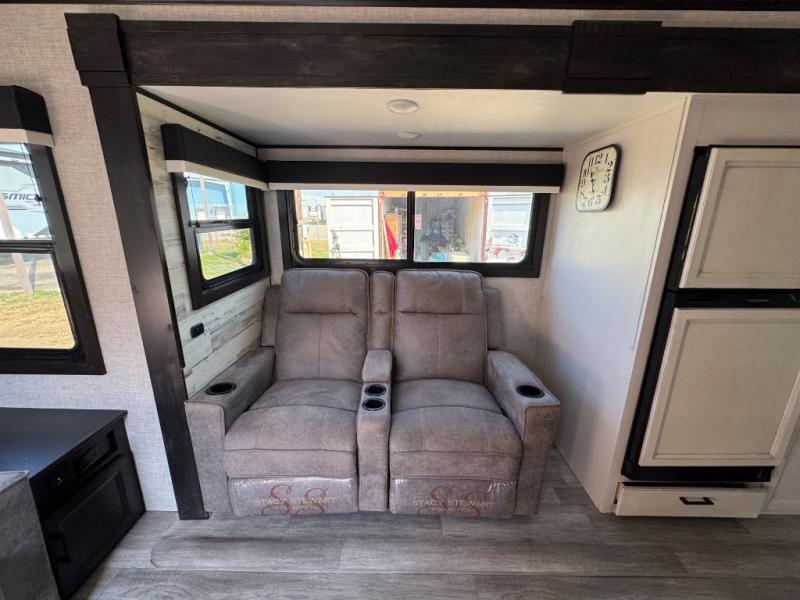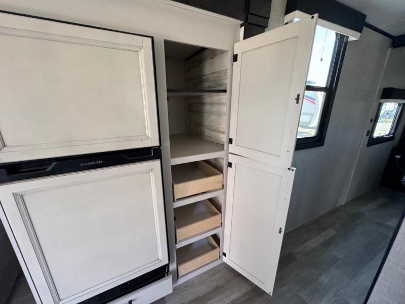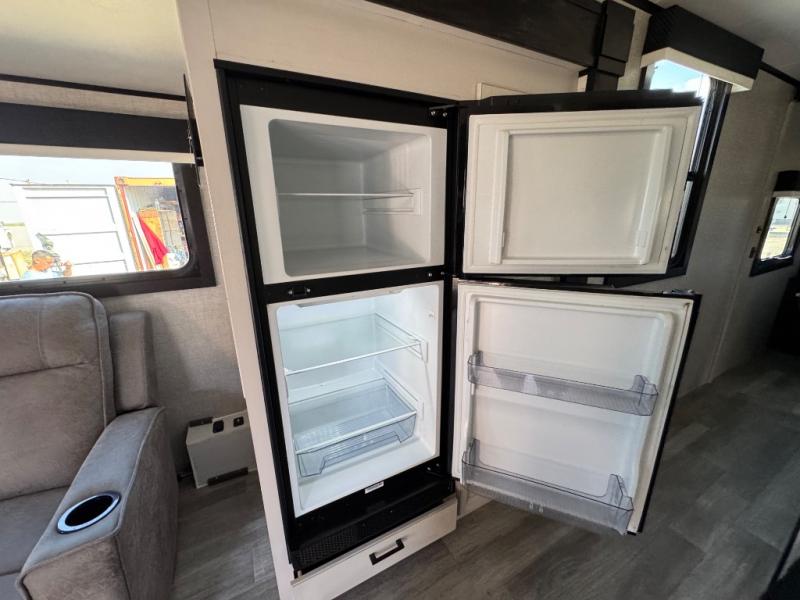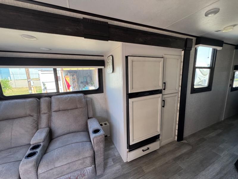 You will experience a smooth flow of traffic in and out of this travel trailer with dual entry doors! The front private bedroom has one of these entrances and a 60" x 75" queen bed with wardrobes on either side to keep your clothes looking nice. The full bathroom has a shower for you to freshen up in each morning and a linen closet to keep your towels close. You will appreciate all of the countertop space to prepare your meal and cook it on the three burner cooktop then enjoy it at the booth dinette. If there happen to be any leftovers then you can store them inside the 8 cu. ft. refrigerator. The rear theater seating comes with lights and trays to set your bowl of popcorn or you can choose to switch it out for the optional tri-fold sofa so an extra guest could stay the night.