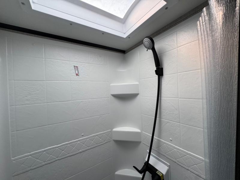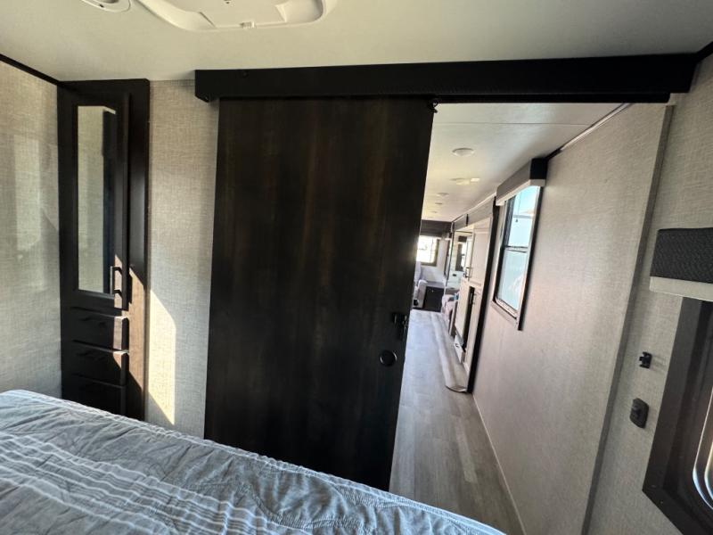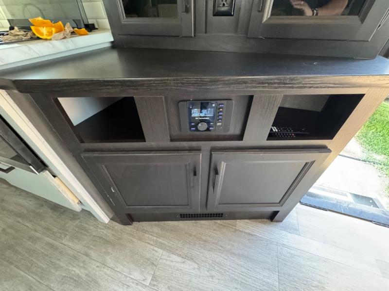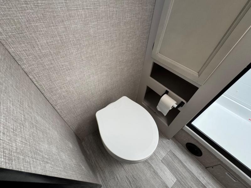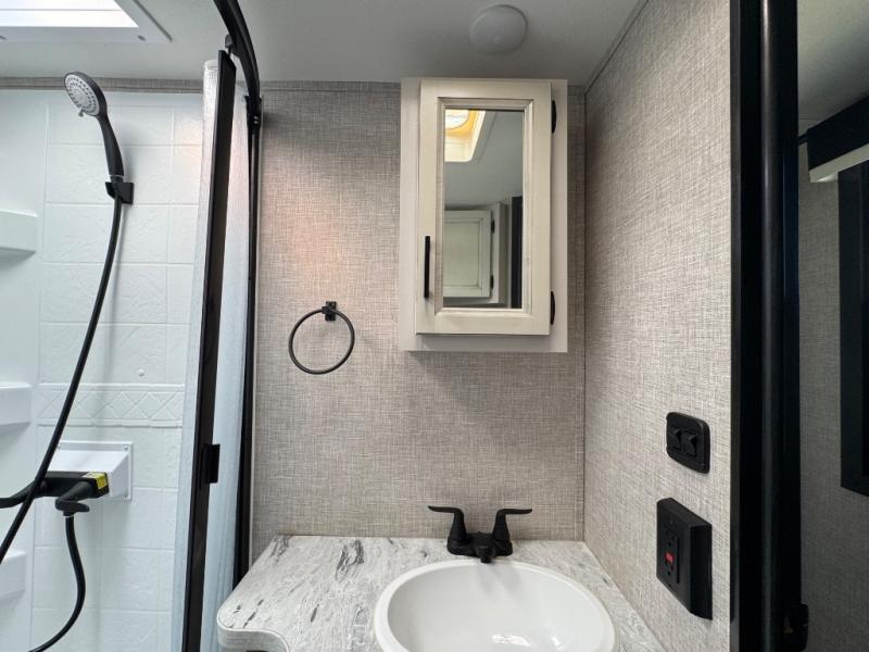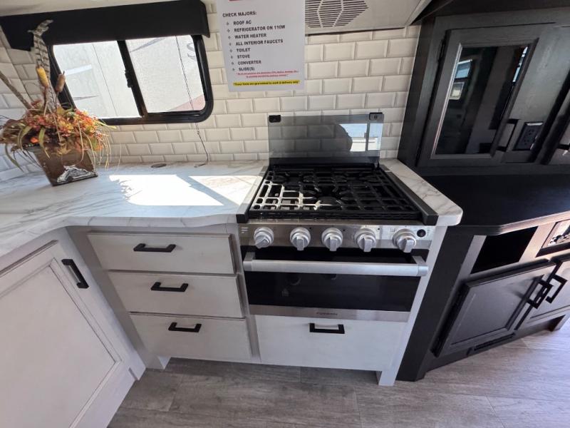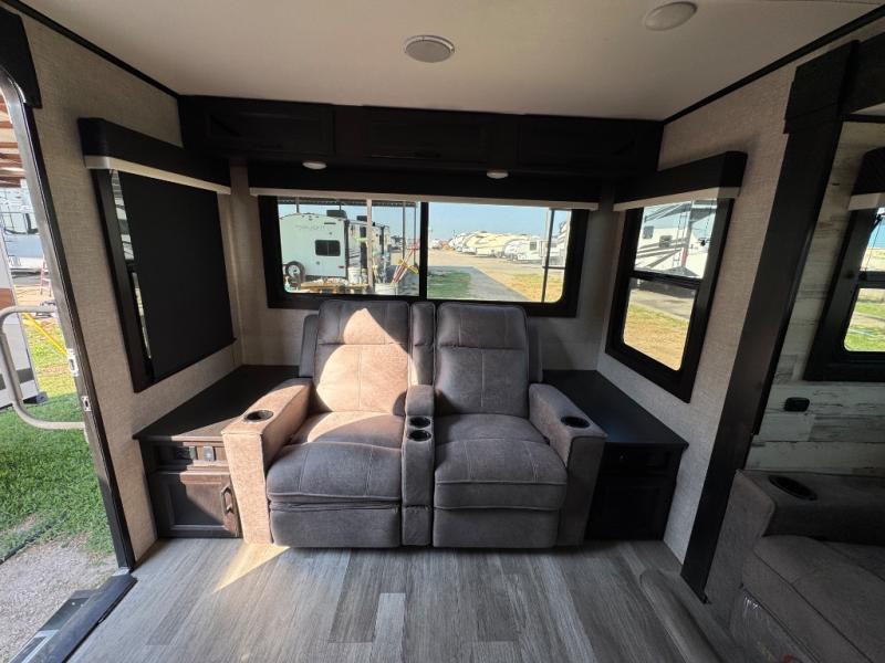 You will experience a smooth flow of traffic in and out of this travel trailer with dual entry doors! The front private bedroom has one of these entrances and a 60" x 75" queen bed with wardrobes on either side to keep your clothes looking nice. The full bathroom has a shower for you to freshen up in each morning and a linen closet to keep your towels close. You will appreciate all of the countertop space to prepare your meal and cook it on the three burner cooktop then enjoy it at the booth dinette. If there happen to be any leftovers then you can store them inside the 8 cu. ft. refrigerator. The rear theater seating comes with lights and trays to set your bowl of popcorn or you can choose to switch it out for the optional tri-fold sofa so an extra guest could stay the night.