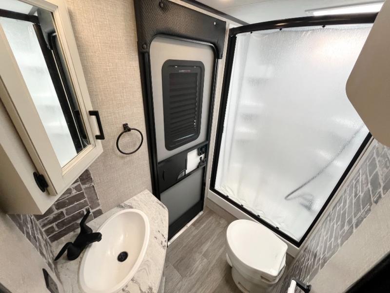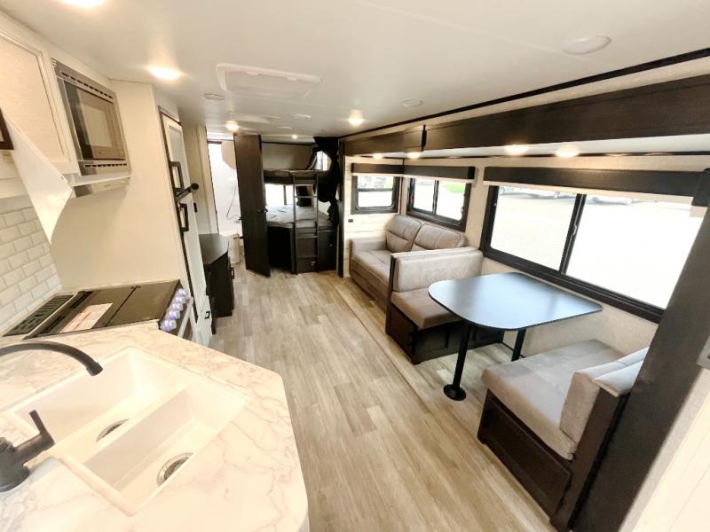 Get out and experience new campgrounds with this spacious trailer that offers a slide out jack knife sofa and booth dinette giving you dining, relaxing and sleeping space as well as more interior floor space to move from the front to the back. The dual entries are a great feature as well when you have eight campers on your trip. And having the second exterior entry/exit to the full bathroom is convenient for all. The cook will love the choice of making meals inside with full amenities or on the outside kitchen when relaxing under the 21' power awning with LED lights. And the front bedroom gives you a queen bed, dual wardrobes and windows for great views when inside. You might like to choose a few options such as theater seating or a tri-fold sofa in place of the jack knife sofa, the 120V heated tank pads for those cooler camping trips, and/or the Solar Power package if you want to camp off-grid.