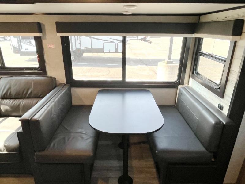 Get out and experience new campgrounds with this spacious trailer that offers a slide out jack knife sofa and booth dinette giving you dining, relaxing and sleeping space as well as more interior floor space to move from the front to the back. The dual entries are a great feature as well when you have eight campers on your trip. And having the second exterior entry/exit to the full bathroom is convenient for all. The cook will love the choice of making meals inside with full amenities or on the outside kitchen when relaxing under the 21' power awning with LED lights. And the front bedroom gives you a queen bed, dual wardrobes and windows for great views when inside. You might like to choose a few options such as theater seating or a tri-fold sofa in place of the jack knife sofa, the 120V heated tank pads for those cooler camping trips, and/or the Solar Power package if you want to camp off-grid.