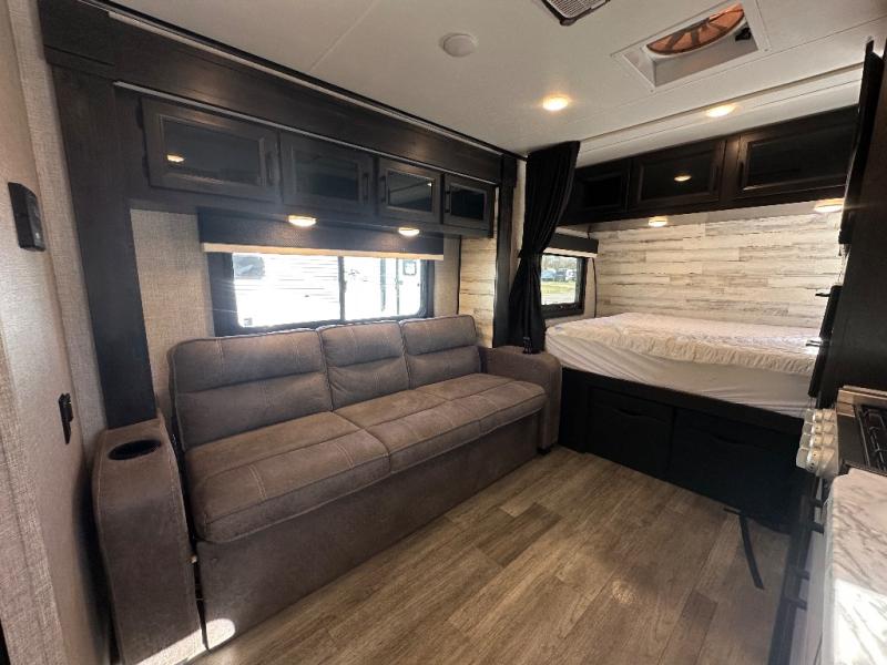 Weekends at the lake are made comfortable in this single slide out travel trailer. You will enjoy your own 54" x 80" front bed so you don't have to sleep on the floor, plus there is a jack-knife sofa if you have an overnight guest. The full bath features a radius shower with a skylight, plus plenty of storage space for your medicines and toiletries. This model includes a microwave oven and a three burner cooktop to prepare meals each day, and an 8 cu. ft. 12V refrigerator for perishables. You will also find an exterior refrigerator for cold drinks, plus a Jayport system with an LP quick connect.