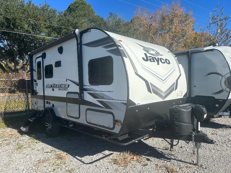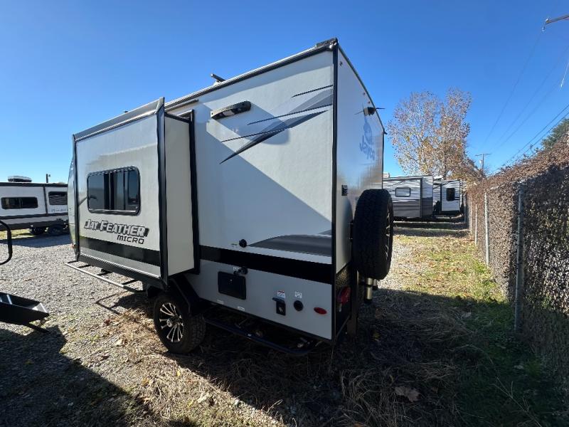 The Jay Feather Micro travel trailers by Jayco are for those looking for lightweight camping, while not sacrificing comfort and convenience. The modern retro graphics package is sure to be eye-catching, and the newly designed interiors will have you feeling right at home. Each model features an American-made frame with an integrated A-frame, Goodyear off-road tires, plus a new Rock Solid stabilizer system for a more stable camping experience. Some of the interior comforts you will enjoy are the residential vinyl flooring with cold crack resistance, screwed and glued cabinetry, and LED lighting. Adventure is waiting for you with a Jay Feather Micro travel trailer. Choose your favorite floorplan today!