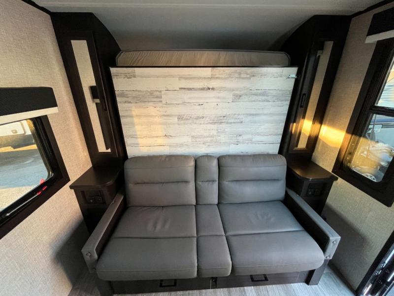 This versatile travel trailer is the perfect couple's trailer with space for an overnight guest on the booth dinette. The front sofa will provide space to relax during the day, and you can fold down the Murphy bed when you're ready to sleep. Whip up some eggs on the three burner cooktop in the morning, or use the microwave oven for instant oatmeal. You'll find a flip-up kitchen counter that will come in handy when cutting fresh fruit, and there is an 8 cu. ft. 12V refrigerator for your perishables. This model also includes a spacious full rear bath with a tub/shower, a medicine cabinet, plus a large linen closet for clean towels.