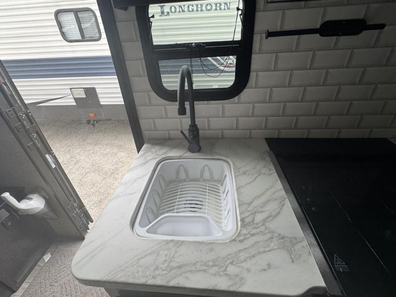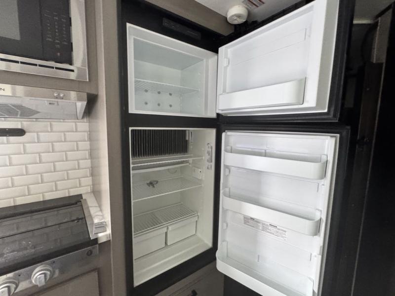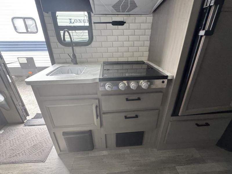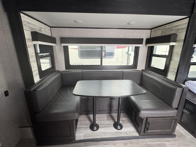 Pack up the family and head to your local state park in this cozy travel trailer for eight. The little ones will love the double-size bunks, and the full bath is close by for convenience. There is a Murphy bed up front that you can fold up each morning to relax on the sofa. If you have any other guests, they can sleep on the U-shaped dinette within the slide out. This model includes a three burner cooktop and a microwave oven, plus an outside kitchen to give the chef a choice where to cook. The 15' power awning will provide shade while the meal is being made, and there is exterior storage for your camp chairs.