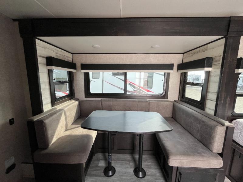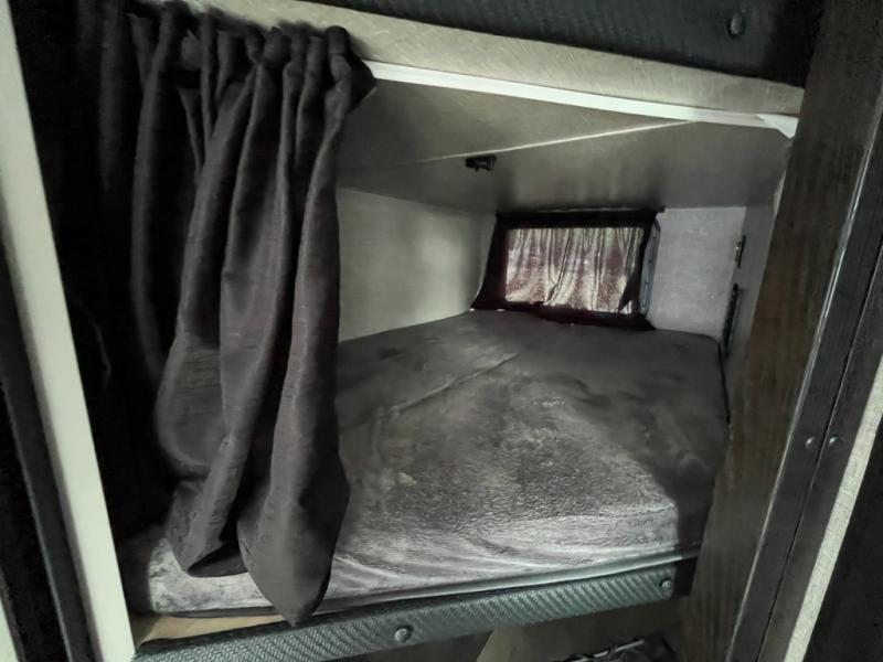 Pack up the family and head to your local state park in this cozy travel trailer for eight. The little ones will love the double-size bunks, and the full bath is close by for convenience. There is a Murphy bed up front that you can fold up each morning to relax on the sofa. If you have any other guests, they can sleep on the U-shaped dinette within the slide out. This model includes a three burner cooktop and a microwave oven, plus an outside kitchen to give the chef a choice where to cook. The 15' power awning will provide shade while the meal is being made, and there is exterior storage for your camp chairs.