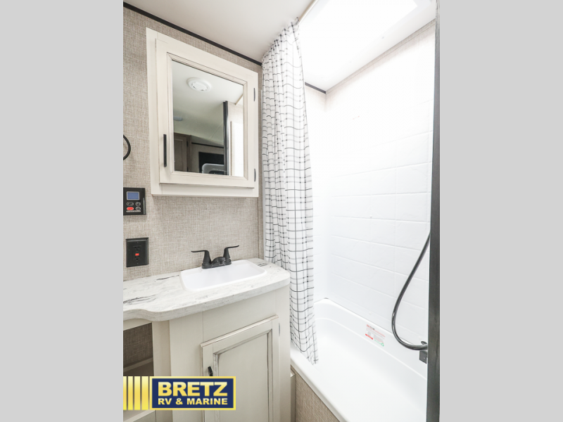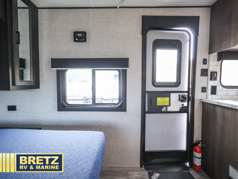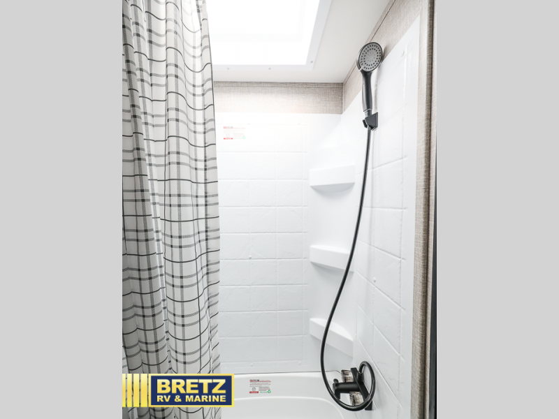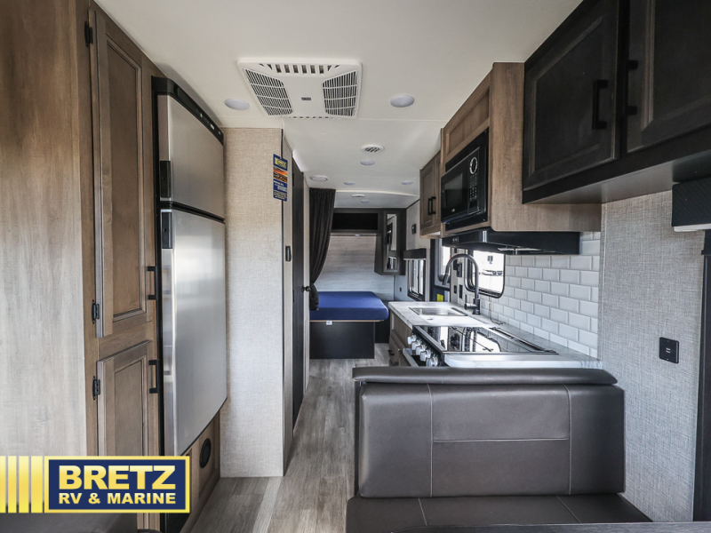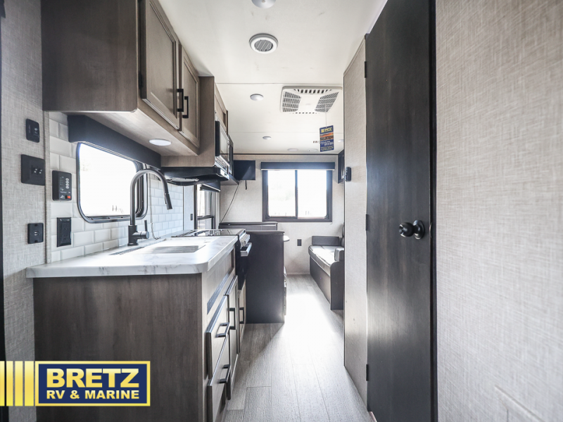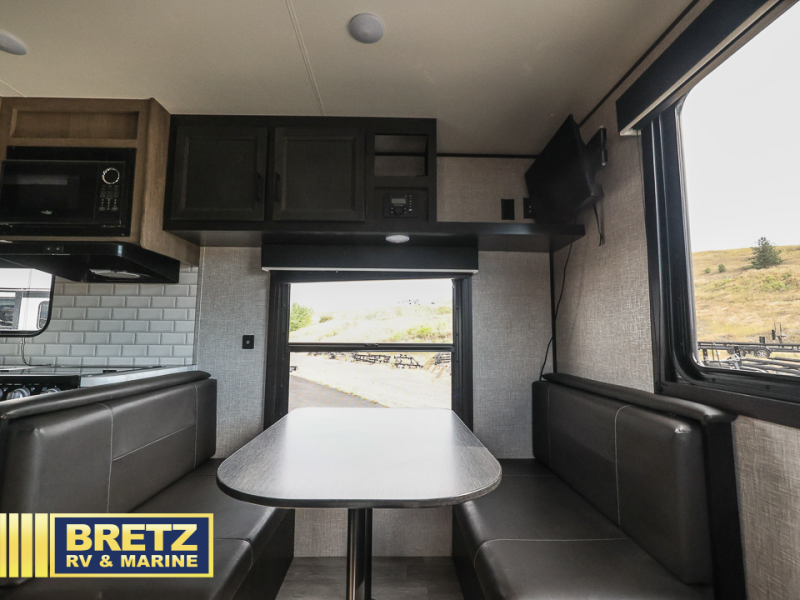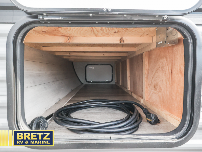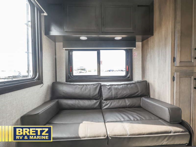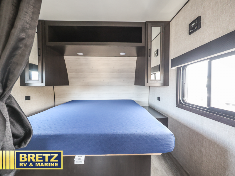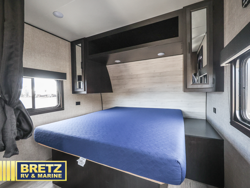 Looking for a couples trailer or a manageable RV that will sleep four when you utilize the furniture as sleeping space? Look no further to find a queen bed up front for two, and the jack-knife sofa plus the booth dinette provide sleeping space for two more. The cook will enjoy making meals with everything nearby to keep everyone fed, plus the refrigerator and pantry offer food storage. Everyone can get cleaned up in the full bathroom either in the morning or before bedtime, and the bathroom will come in handy during those night time trips. The outside offers a 16' power awning to relax under as you plan your activities, and there is storage for camping games, charcoal and such along the exterior.