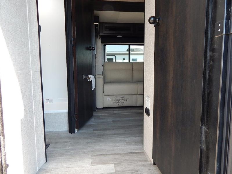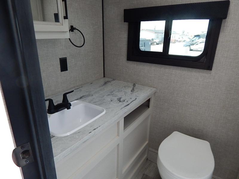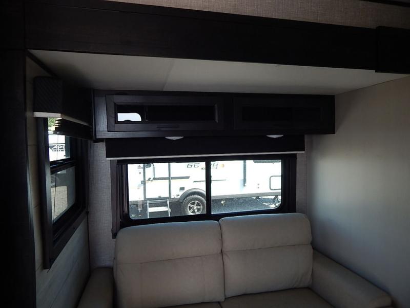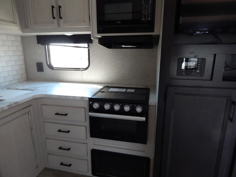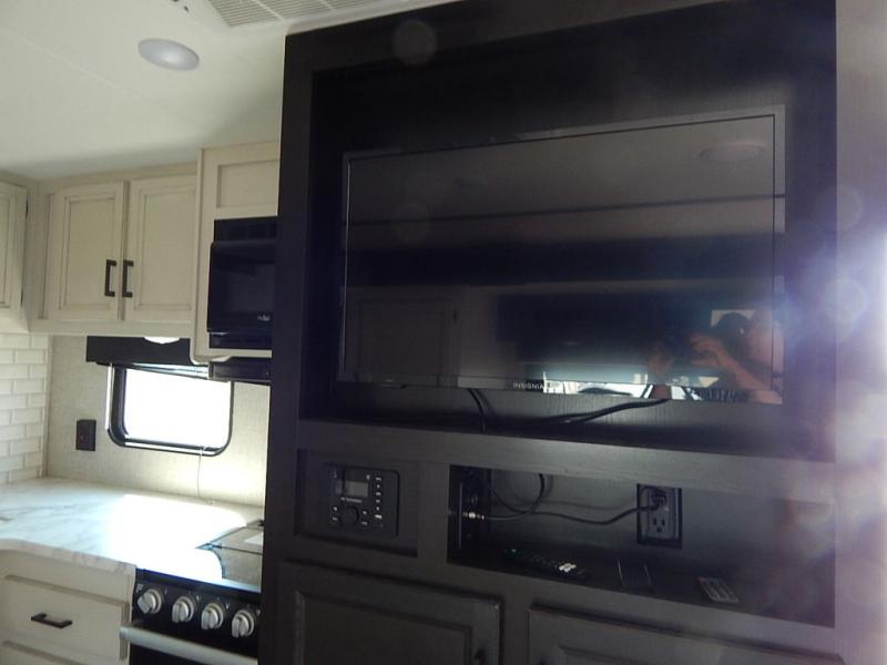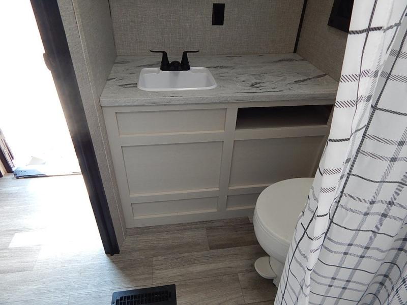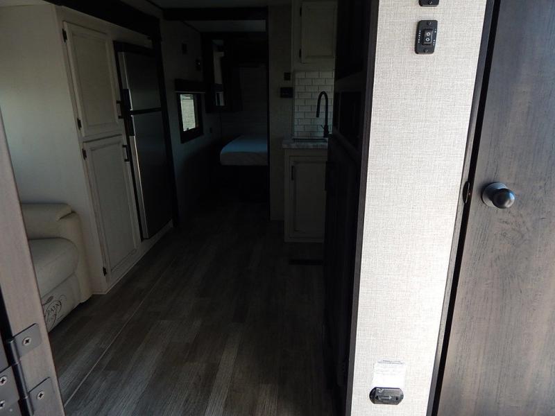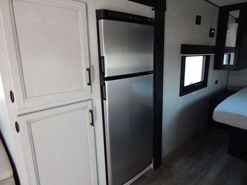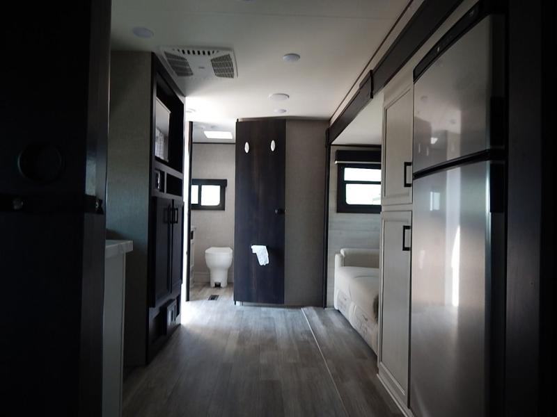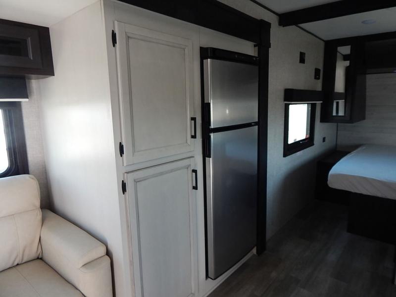 You will feel right at home in this travel trailer! It features a front private bedroom with a 60" x 75" queen bed that has wardrobes on either side and a shelf above to set your books. The kitchen has everything you will need to prepare a delicious home cooked meal including a large pantry to store your favorite snacks. The theater seats are directly across from the entertainment center and can also be switched out for an optional tri-fold sofa. The full rear bathroom has an abundance of room for you to walk around as you get ready each morning. You can grab a jacket from the walk-in closet on those crisp mornings and head to the outside fridge for a cold beverage in between outdoor games!