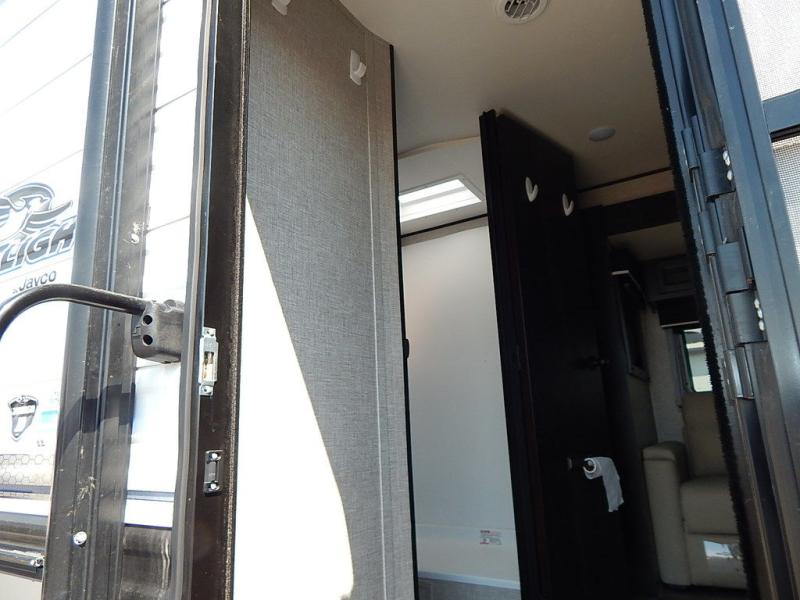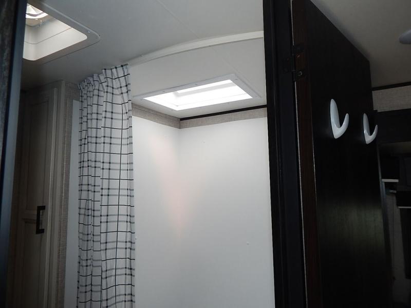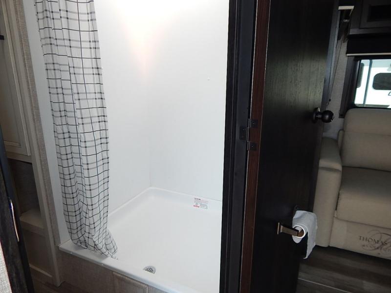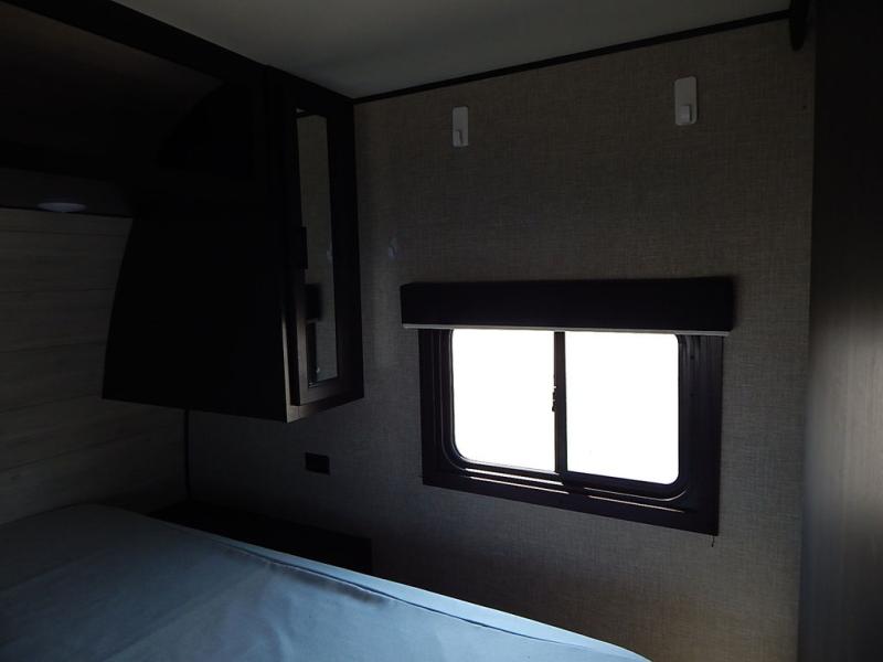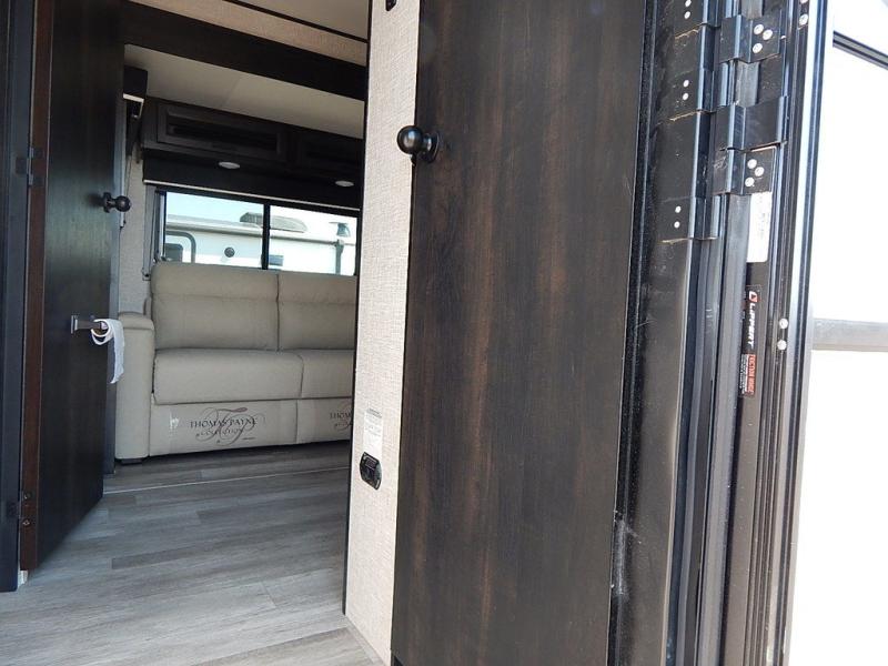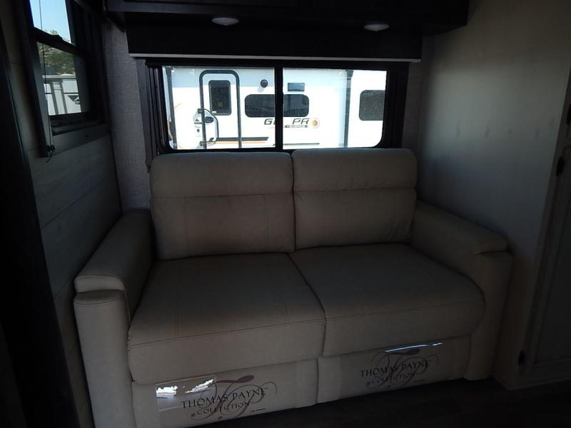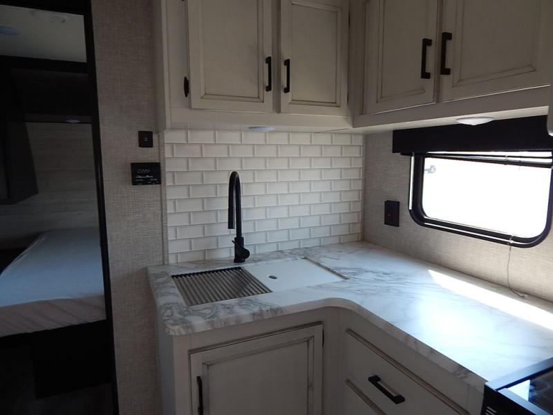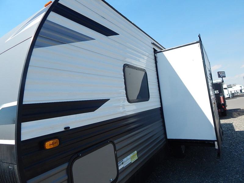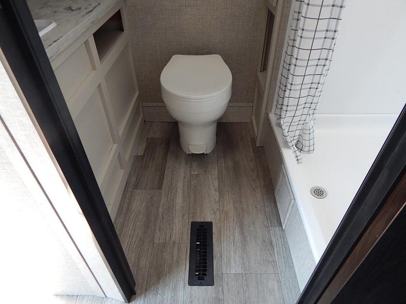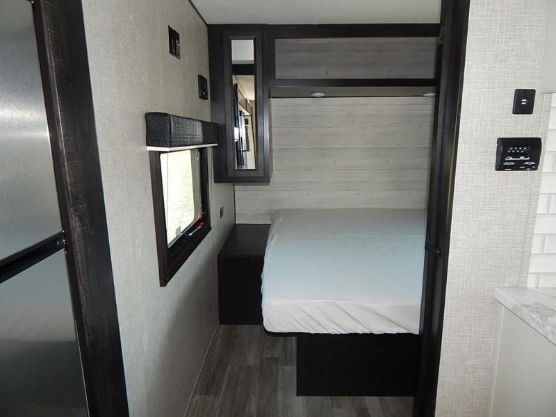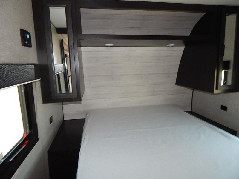 You will feel right at home in this travel trailer! It features a front private bedroom with a 60" x 75" queen bed that has wardrobes on either side and a shelf above to set your books. The kitchen has everything you will need to prepare a delicious home cooked meal including a large pantry to store your favorite snacks. The theater seats are directly across from the entertainment center and can also be switched out for an optional tri-fold sofa. The full rear bathroom has an abundance of room for you to walk around as you get ready each morning. You can grab a jacket from the walk-in closet on those crisp mornings and head to the outside fridge for a cold beverage in between outdoor games!