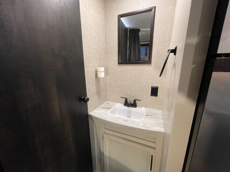 This easy to setup trailer offers a semi-private bedroom up front with a queen bed, semi-private double size bunks in the rear thanks to the curtains, and a private toilet and tub/shower room. The bathroom sink is just outside the door allowing two people to get ready for bed at once. The galley kitchen offers full amenities, and two can dine at the booth dinette and some can relax on the jack-knife sofa. Both furnishings offer extra sleeping space. And you might like to add the Chil N' Stor option which adds a fridge and counter space along the exterior to serve meals outside and store extra beverages.