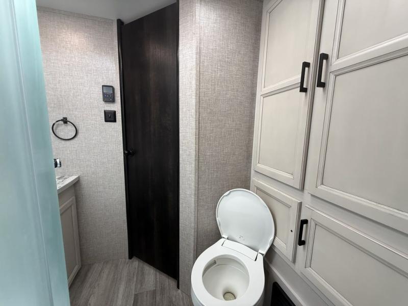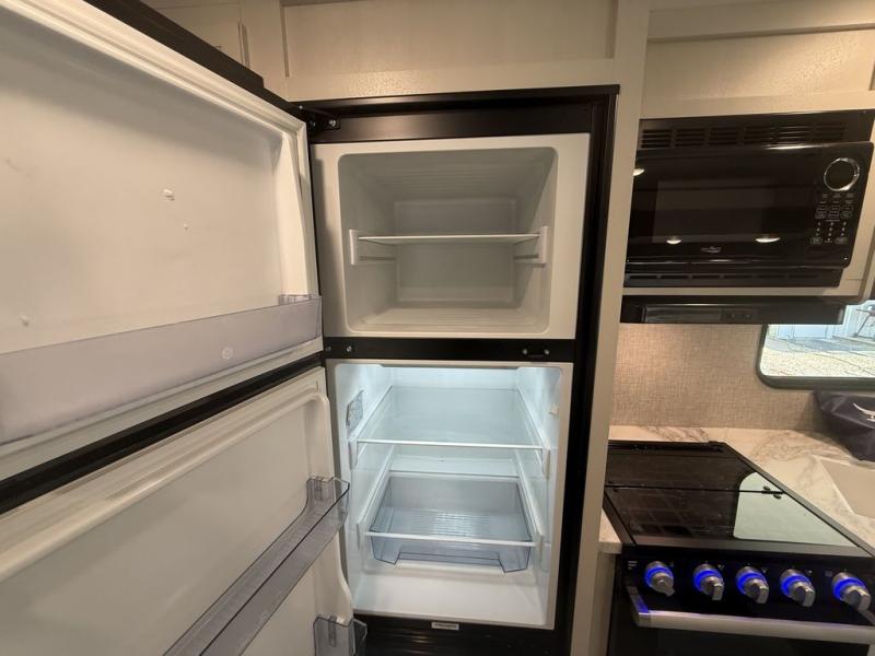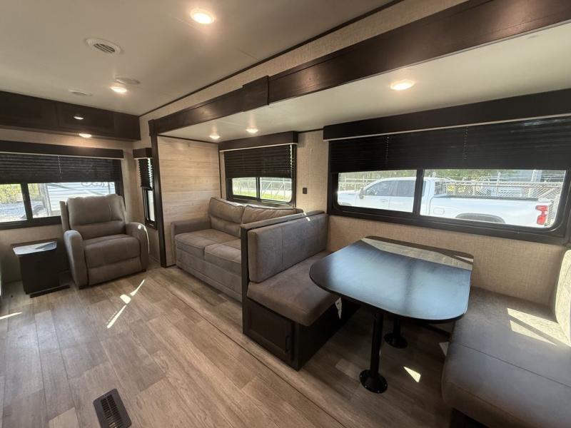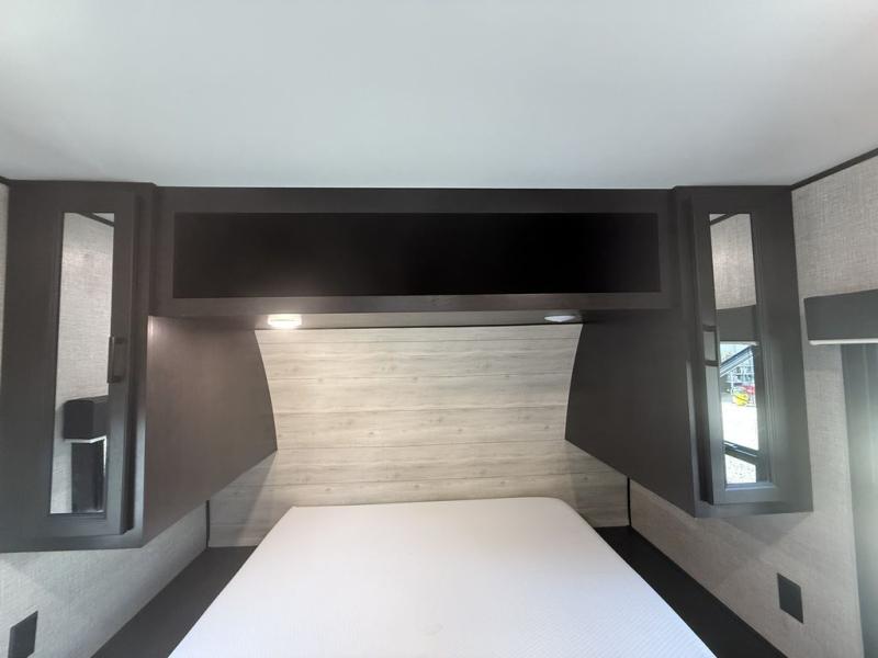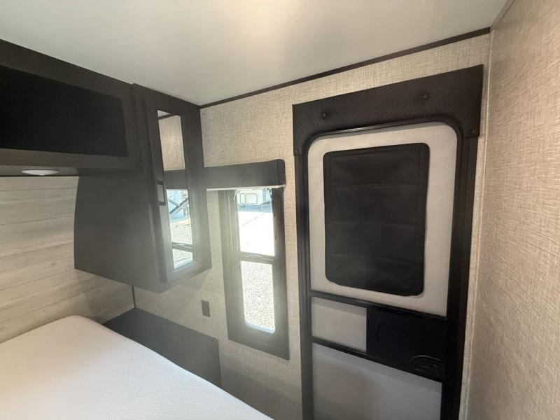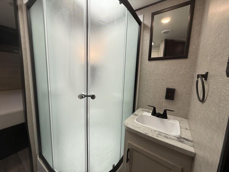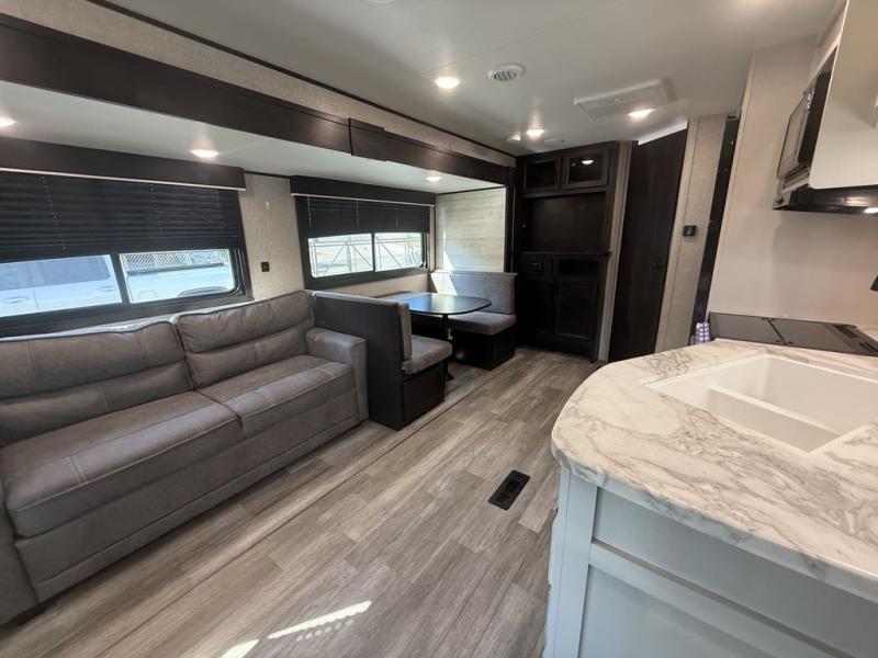 When you want to travel and see new places, this trailer gives you the flexibility to sleep two to four, plus offers a full walk-through bathroom with access from the main area and the front private bedroom. You will also appreciate having a second entry/exit door in the bedroom, a walk-around queen bed, plus dual wardrobes giving you your own side of the bed. The bathroom also has a radius shower and linen storage. The kitchen includes full amenities to make your own meals, and a pantry to keep your dry goods and snacks. You will love the rear swivel rockers with table in between to place your drinks, and the jack-knife sofa plus booth dinette offer more seating, sleeping space, and extra floor space since they are within a slide.