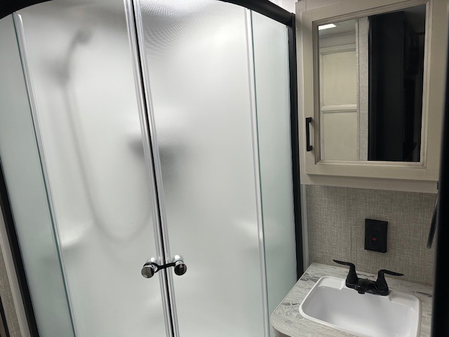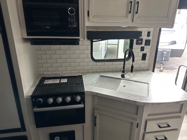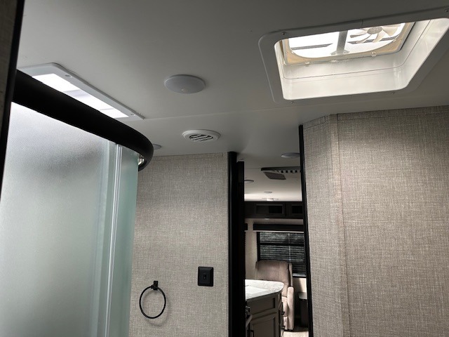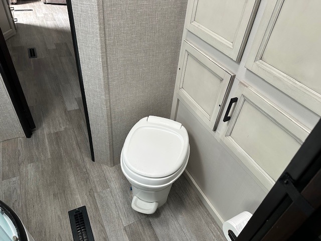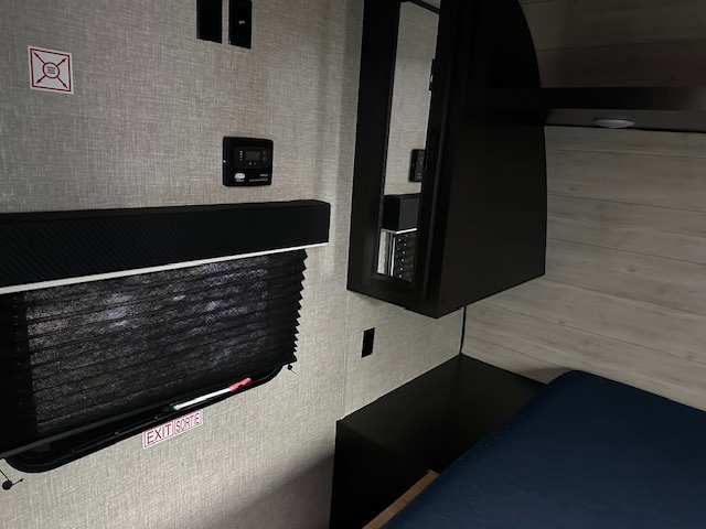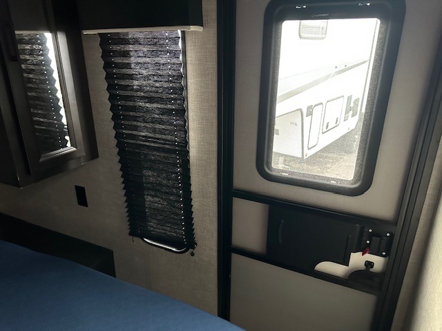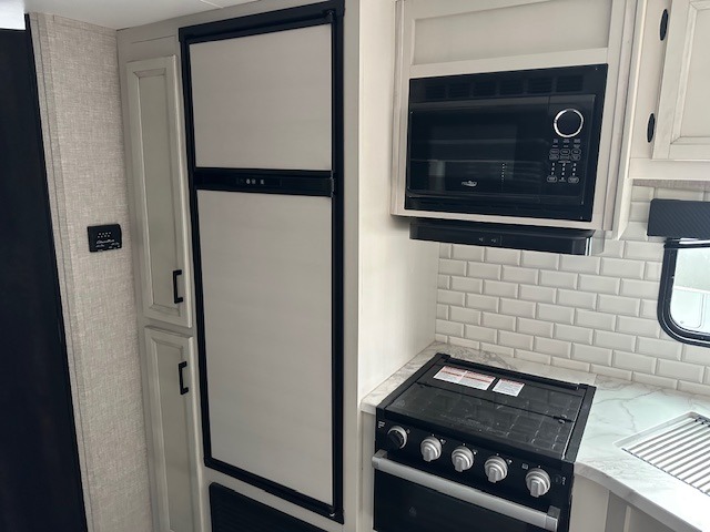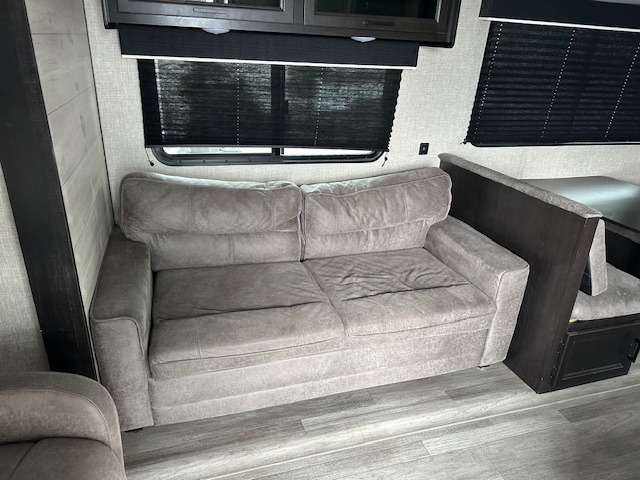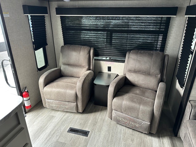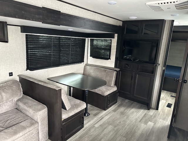 When you want to travel and see new places, this trailer gives you the flexibility to sleep two to four, plus offers a full walk-through bathroom with access from the main area and the front private bedroom. You will also appreciate having a second entry/exit door in the bedroom, a walk-around queen bed, plus dual wardrobes giving you your own side of the bed. The bathroom also has a radius shower and linen storage. The kitchen includes full amenities to make your own meals, and a pantry to keep your dry goods and snacks. You will love the rear swivel rockers with table in between to place your drinks, and the jack-knife sofa plus booth dinette offer more seating, sleeping space, and extra floor space since they are within a slide.