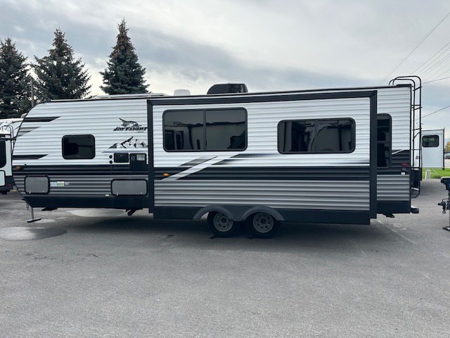 These Jayco Jay Flight travel trailers have been a family favorite for years with their lasting power and superior construction. An integrated A-frame and magnum truss roof system holds them together. When you tow one of these units you're towing the entire unit and not just the frame. With dark tinted windows, you have more privacy and safety. The vinyl flooring throughout will be easy to clean and maintain too. Come find your favorite model today!