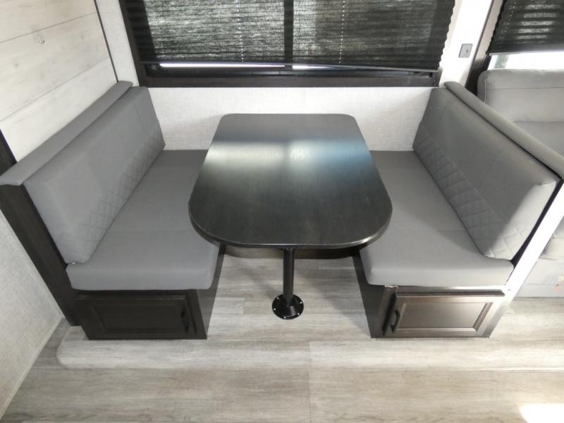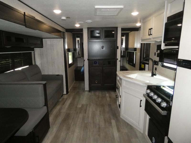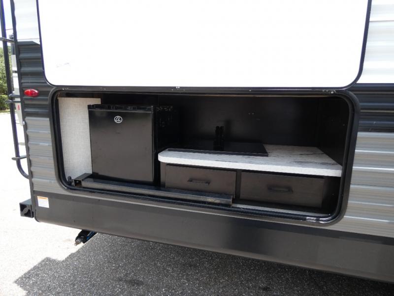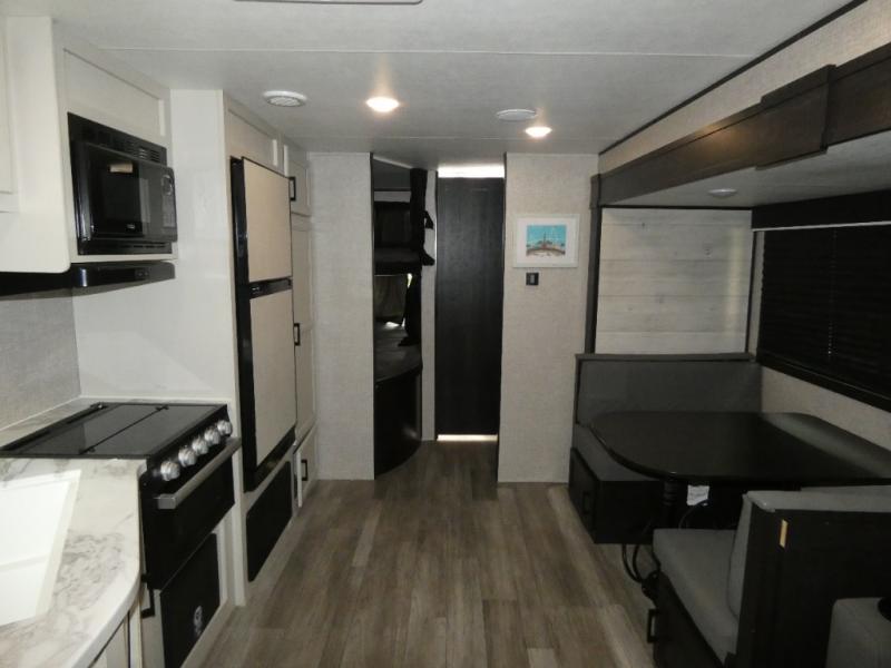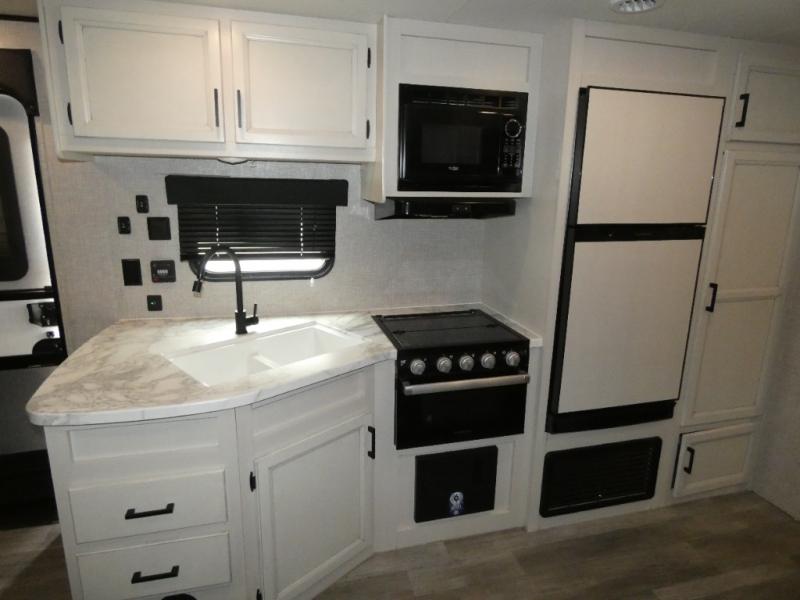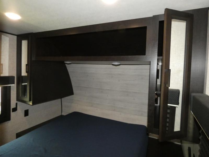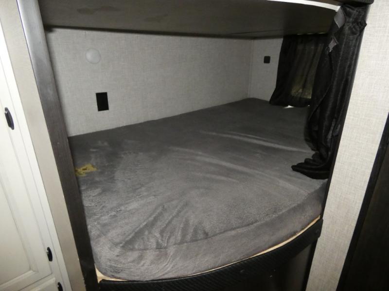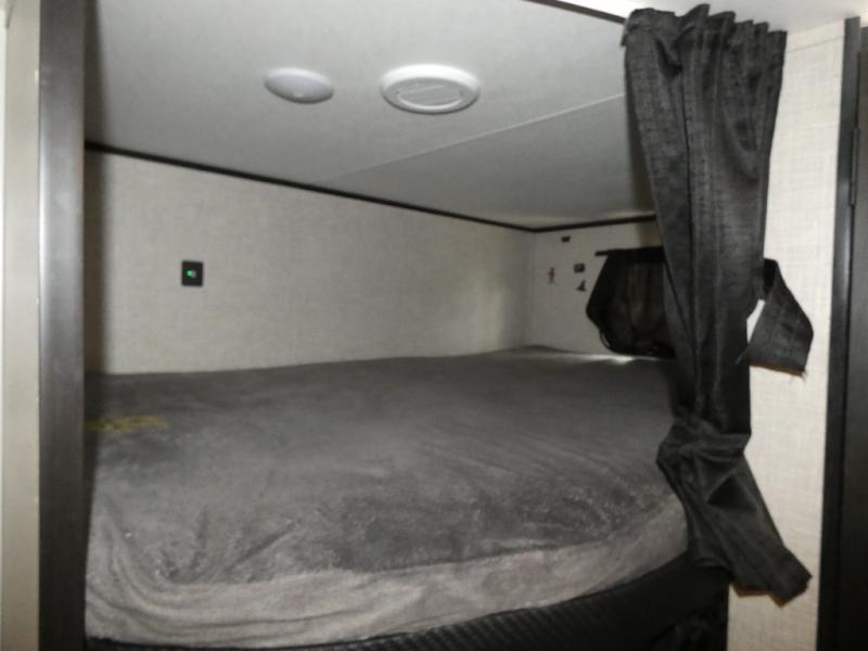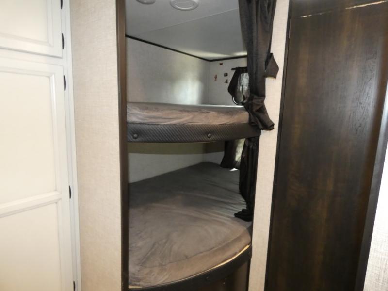 A larger family or group of friends can enjoy camping together in this trailer thanks to the booth dinette and jack-knife sofa slide providing more interior floor space and a place for two or maybe more to sleep at night. And the double size bunks are a fun place to sleep when you need four more spots, plus the privacy curtain will come in handy. The private toilet and tub/shower will keep everyone refreshed and the bathroom sink is just outside the door allowing two people to get ready at one time. The front bedroom offers the owners privacy and there is dual access, two wardrobes and a queen bed to enjoy. The cook will find full amenities indoor, plus there is an outside fridge to have cold beverages outside.