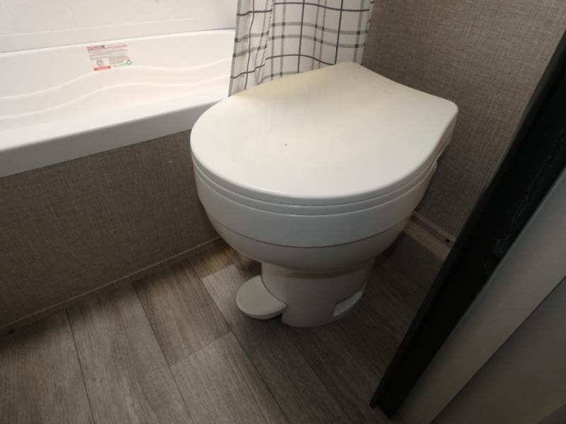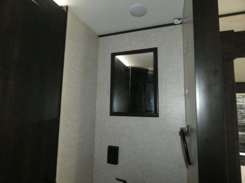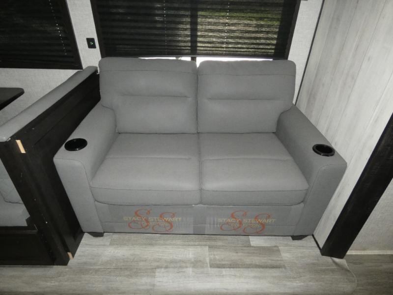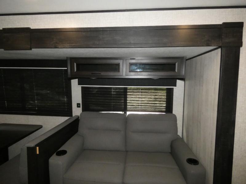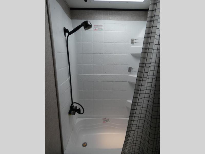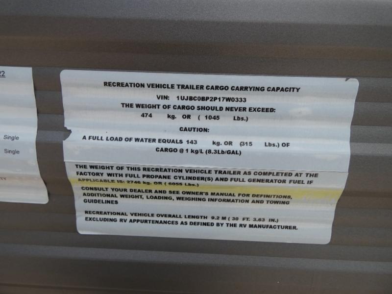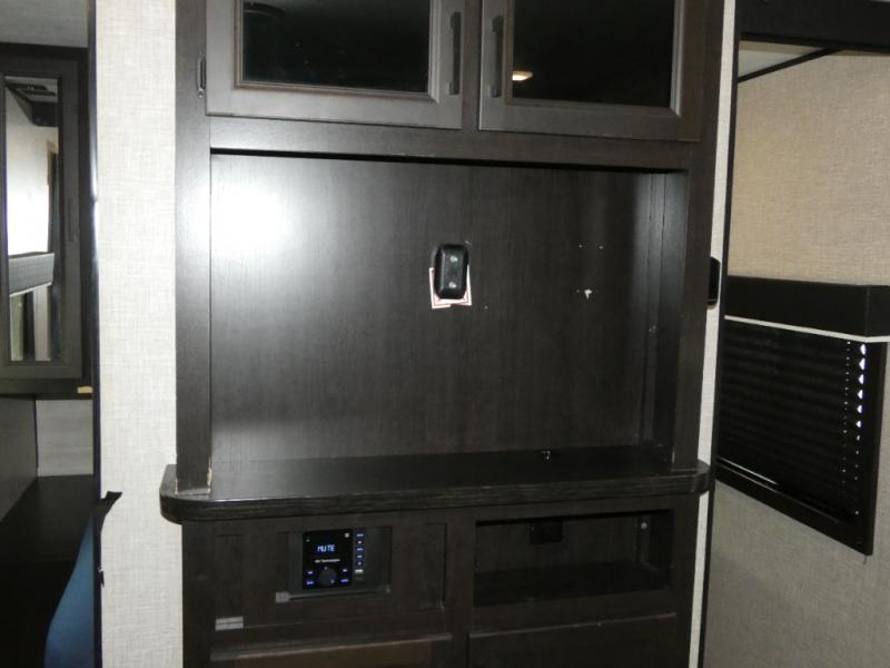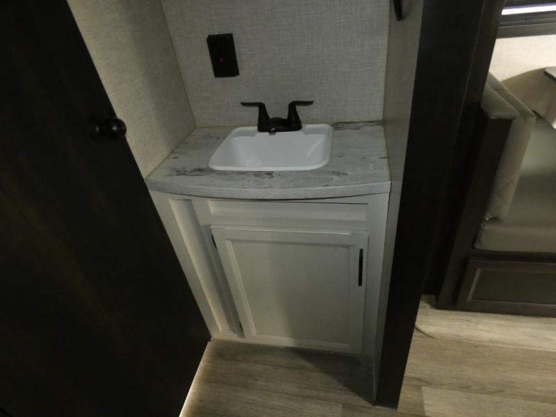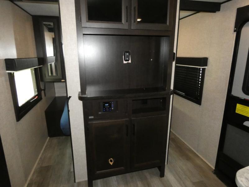 A larger family or group of friends can enjoy camping together in this trailer thanks to the booth dinette and jack-knife sofa slide providing more interior floor space and a place for two or maybe more to sleep at night. And the double size bunks are a fun place to sleep when you need four more spots, plus the privacy curtain will come in handy. The private toilet and tub/shower will keep everyone refreshed and the bathroom sink is just outside the door allowing two people to get ready at one time. The front bedroom offers the owners privacy and there is dual access, two wardrobes and a queen bed to enjoy. The cook will find full amenities indoor, plus there is an outside fridge to have cold beverages outside.