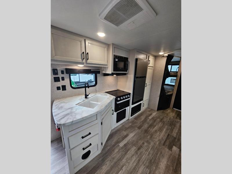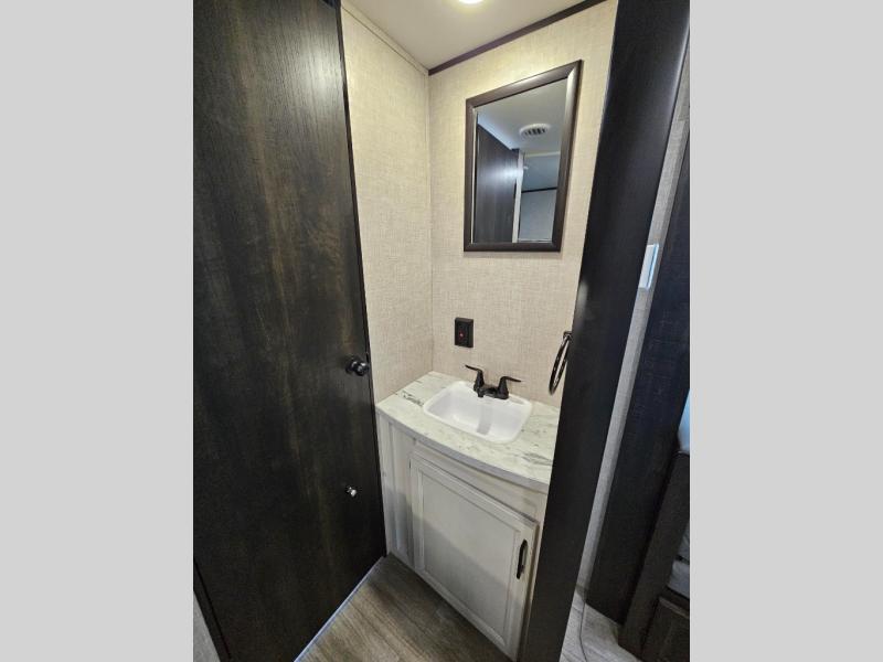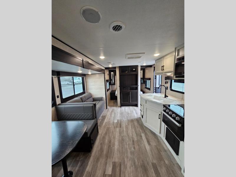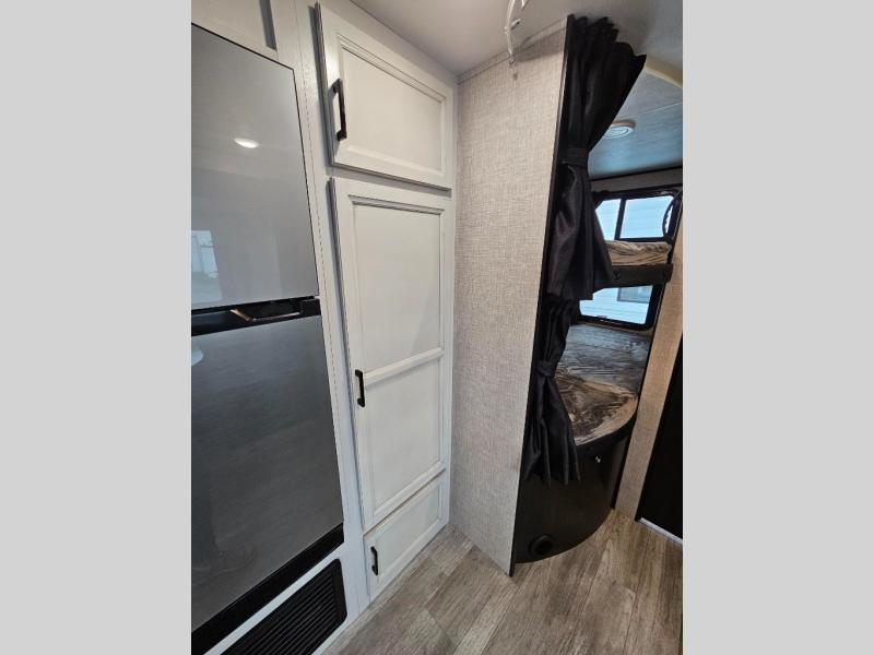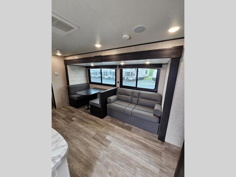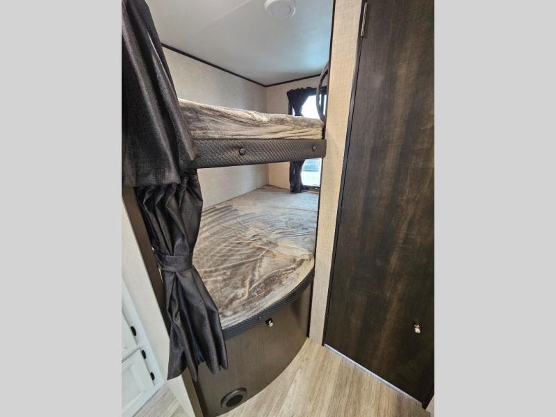 A larger family or group of friends can enjoy camping together in this trailer thanks to the booth dinette and jack-knife sofa slide providing more interior floor space and a place for two or maybe more to sleep at night. And the double size bunks are a fun place to sleep when you need four more spots, plus the privacy curtain will come in handy. The private toilet and tub/shower will keep everyone refreshed and the bathroom sink is just outside the door allowing two people to get ready at one time. The front bedroom offers the owners privacy and there is dual access, two wardrobes and a queen bed to enjoy. The cook will find full amenities indoor, plus there is an outside fridge to have cold beverages outside.