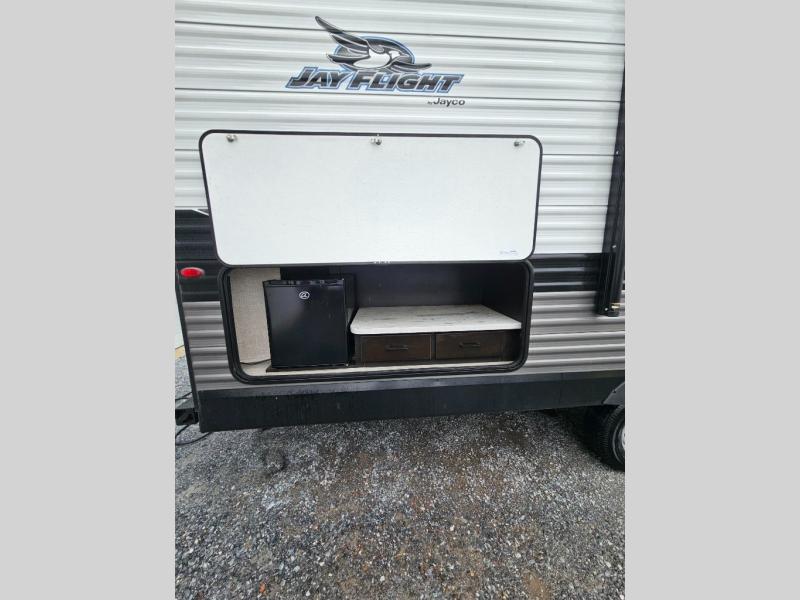 These Jayco Jay Flight travel trailers have been a family favorite for years with their lasting power and superior construction. An integrated A-frame and magnum truss roof system holds them together. When you tow one of these units you're towing the entire unit and not just the frame. With dark tinted windows, you have more privacy and safety. The vinyl flooring throughout will be easy to clean and maintain too. Come find your favorite model today!