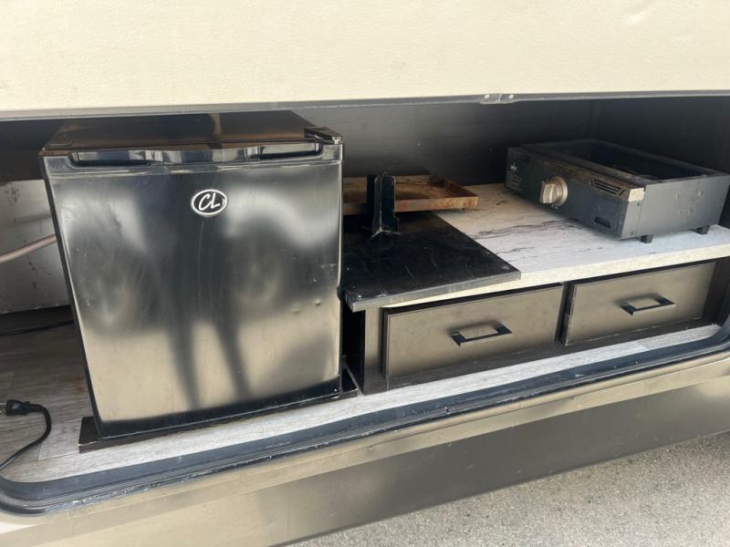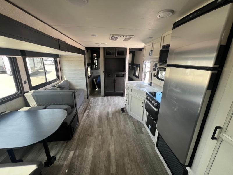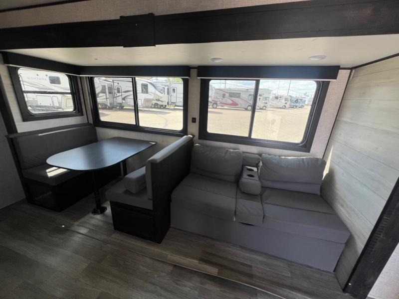 A larger family or group of friends can enjoy camping together in this trailer thanks to the booth dinette and jack-knife sofa slide providing more interior floor space and a place for two or maybe more to sleep at night. And the double size bunks are a fun place to sleep when you need four more spots, plus the privacy curtain will come in handy. The private toilet and tub/shower will keep everyone refreshed and the bathroom sink is just outside the door allowing two people to get ready at one time. The front bedroom offers the owners privacy and there is dual access, two wardrobes and a queen bed to enjoy. The cook will find full amenities indoor, plus there is an outside fridge to have cold beverages outside.