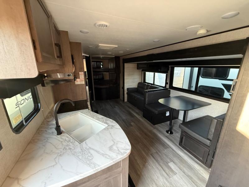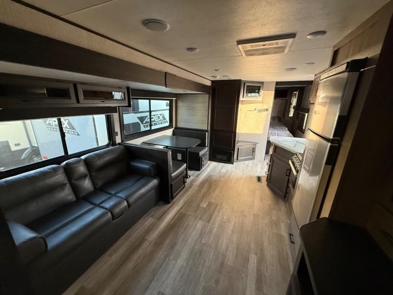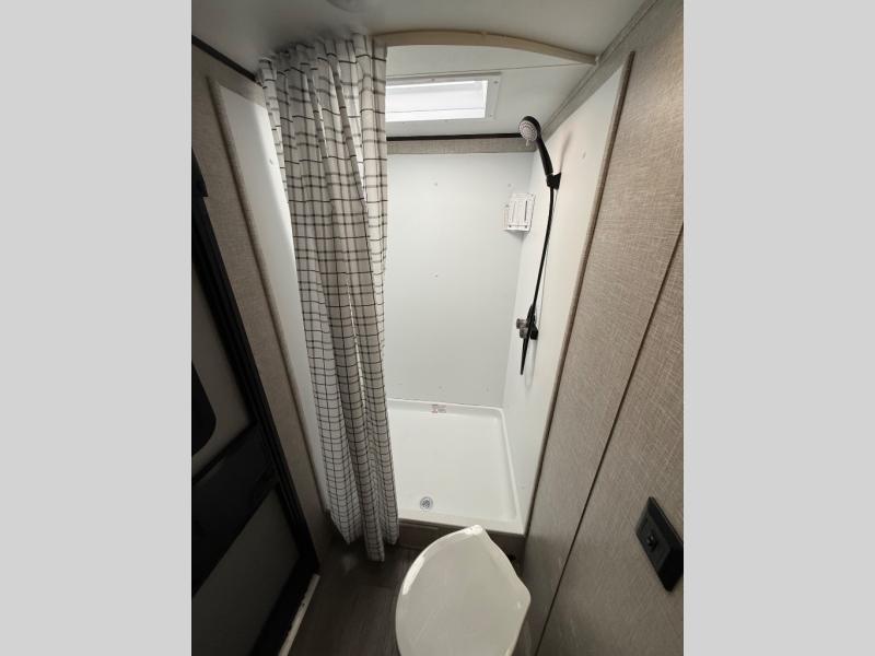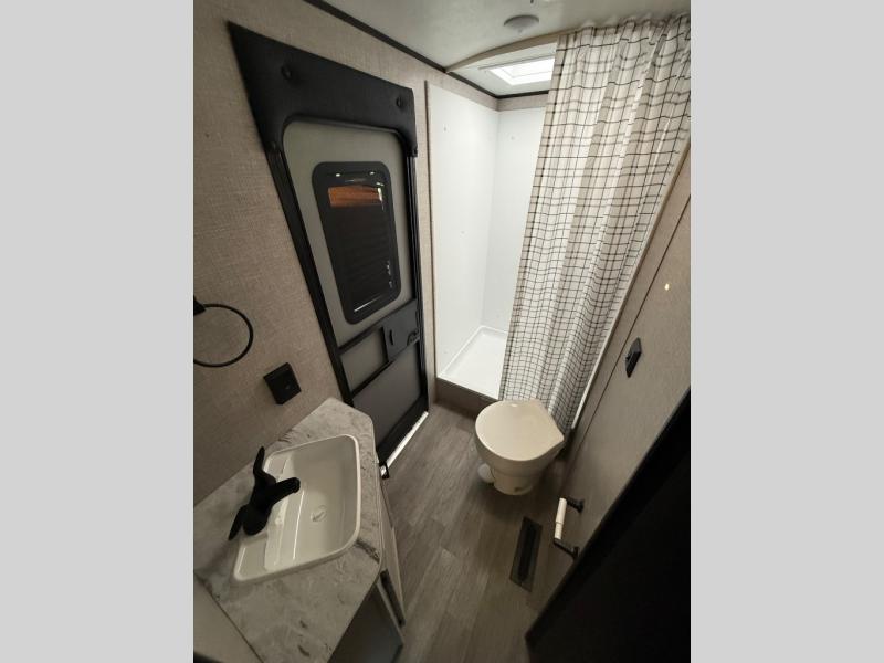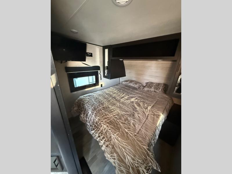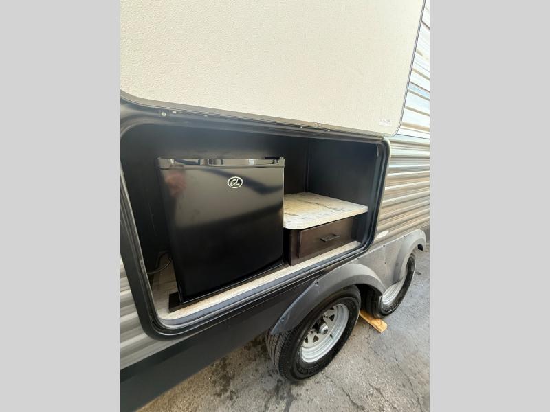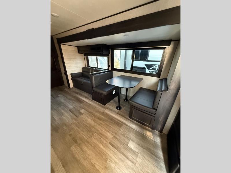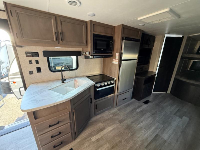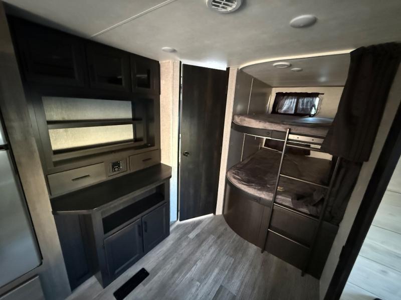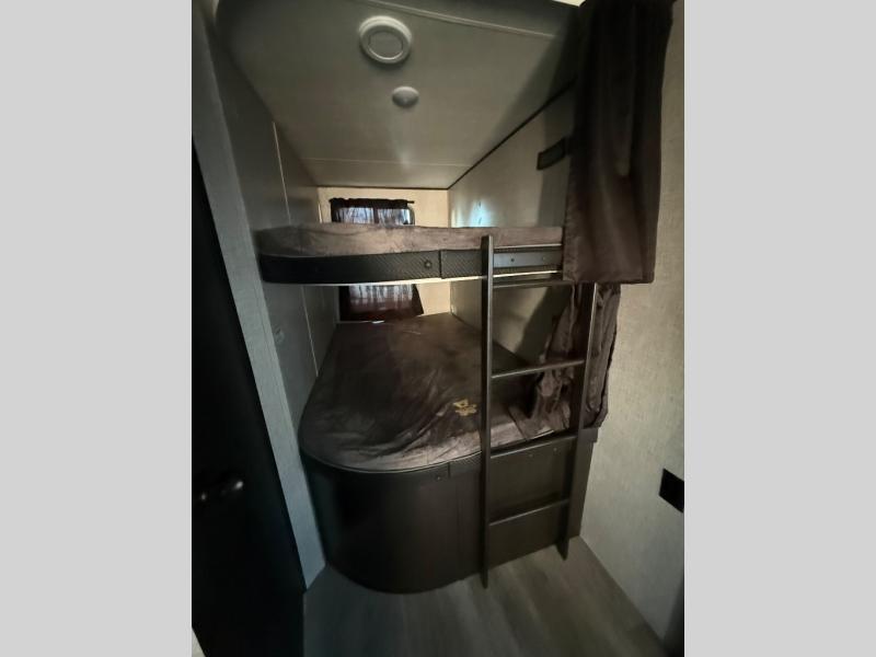 The whole family can get together in this travel trailer! You can sleep on the queen bed in the front private bedroom and the kids can sleep on the 48" x 80" bunk beds with a ladder. The dual entry rear corner bathroom is easy to access even from the outside with one of the dual entry doors to the unit. With a booth dinette and jackknife sofa slide, you will have more walking around space. There is even a bench with storage to keep your shoes out of the way. You also have an outside refrigerator to enjoy a cold beverage without having to go back inside!