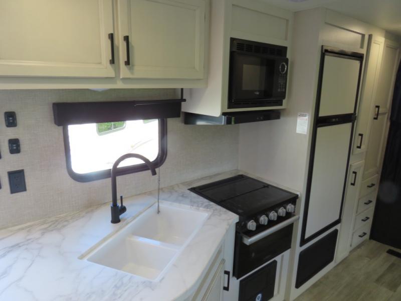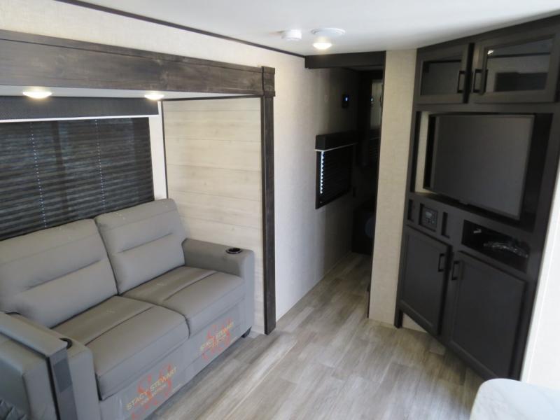 There is much to love about this travel trailer! Starting with the front private bedroom which has a 60" x 75" queen bed with wardrobes on either side and a closet to hang your clothes up. Just outside the bedroom is an entertainment center with a Smart LED TV to watch your favorite movies while you relax on either the jackknife sofa or the U-shaped dinette slide. Freshen up each morning in the rear corner bathroom and then head outside to relax underneath the 20' power awning while you enjoy a cold beverage stored in the outside fridge!
