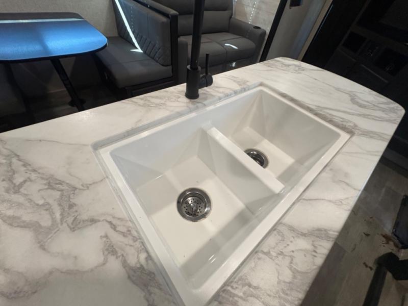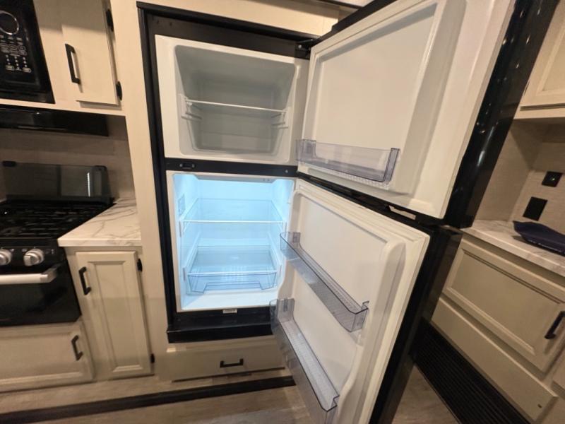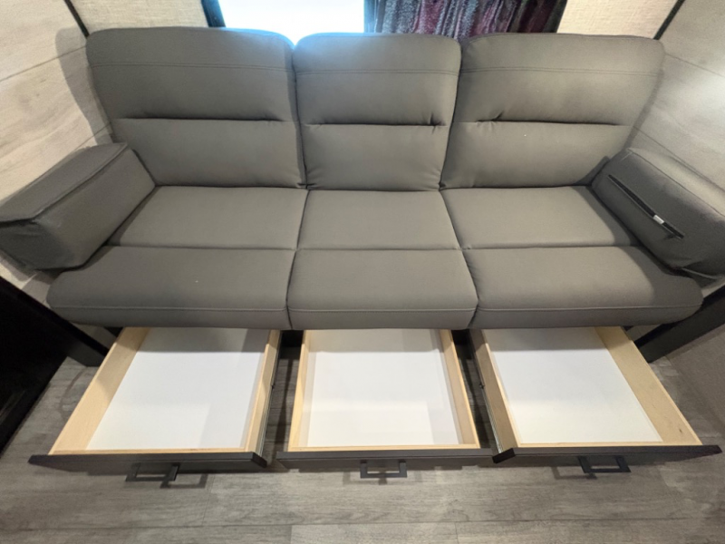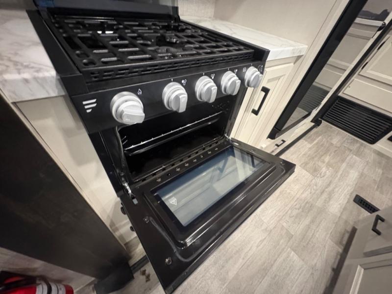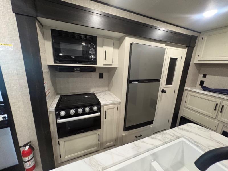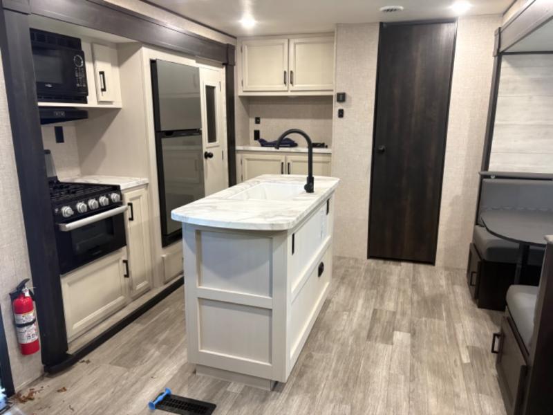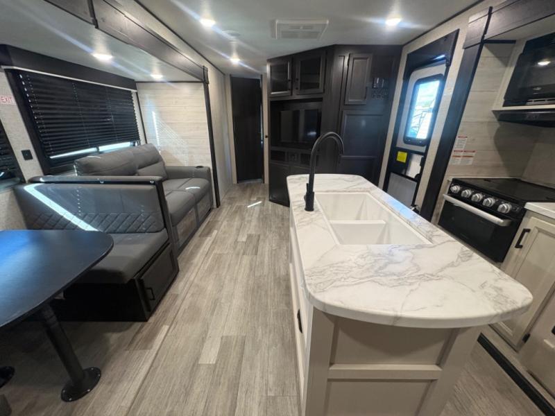 Room to relax and entertain: The living area offers slide-outs to expand your space, a full kitchen with three-burner cooktop, and even an outdoor kitchen option to keep your camping fun outdoors.