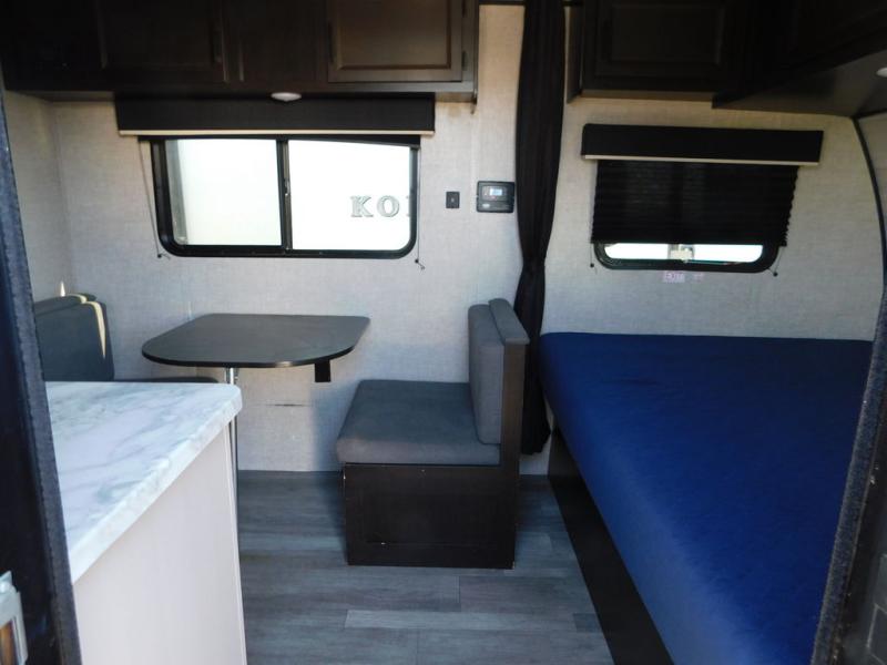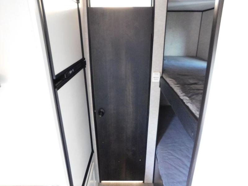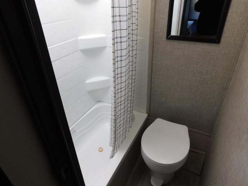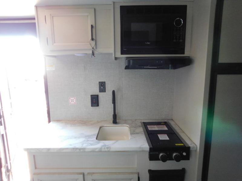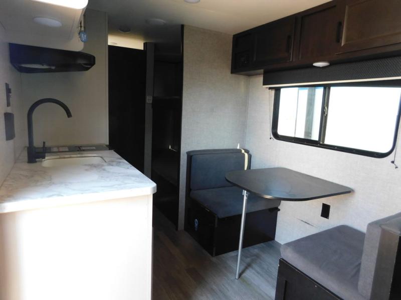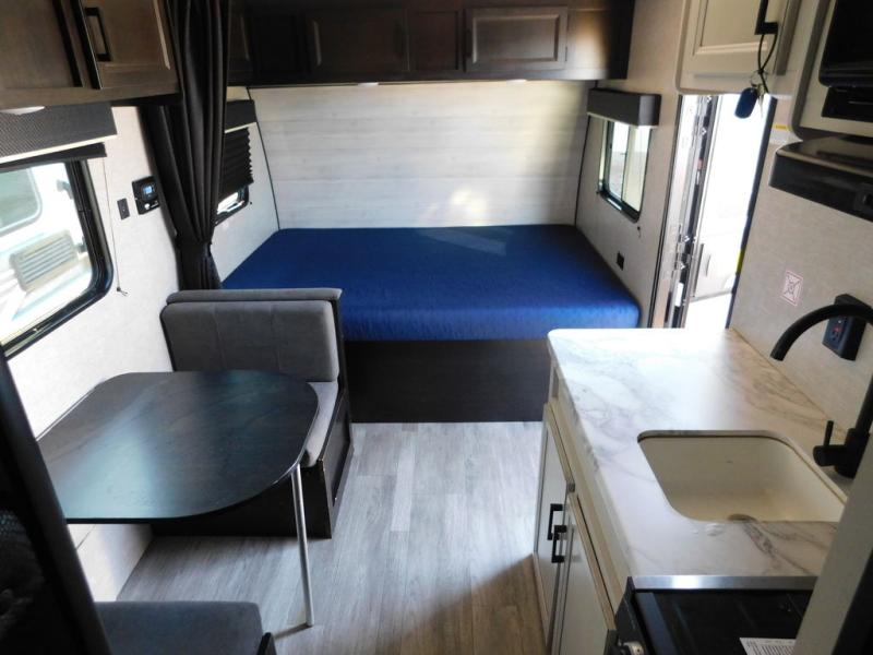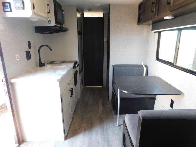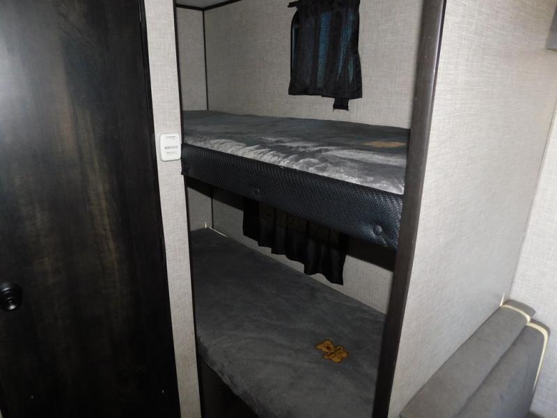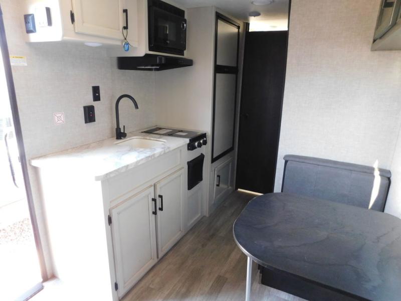 This Jay Flight SLX travel trailer offers you a queen-size bed for sleeping at night, and there is even a privacy curtain that you can draw to separate the bed from the rest of the trailer too. The 29" x 75" bunk beds are another sleeping location, and you can even create a bed for one more person by transforming the booth dinette. Overhead cabinets will help you keep your belongings organized, and the kitchen has a two-burner range, 6-cubic foot refrigerator, residential-style countertops, microwave oven, and a high-rise faucet at the sink to help you prepare meals.