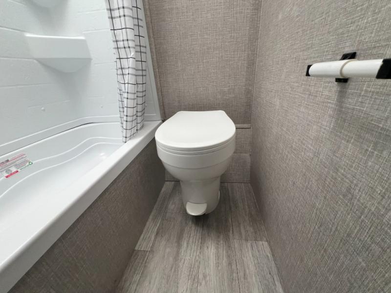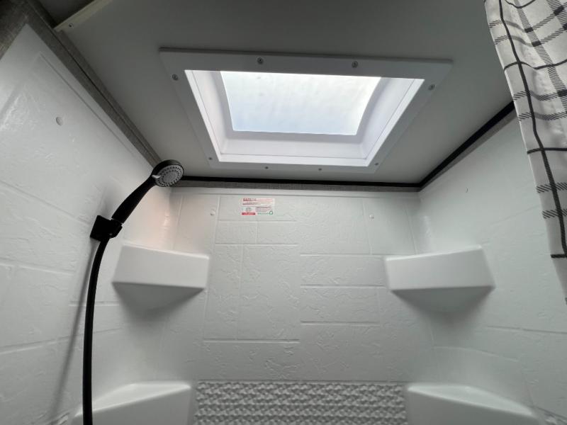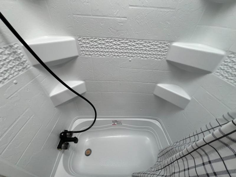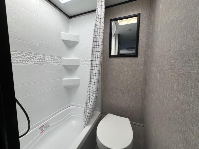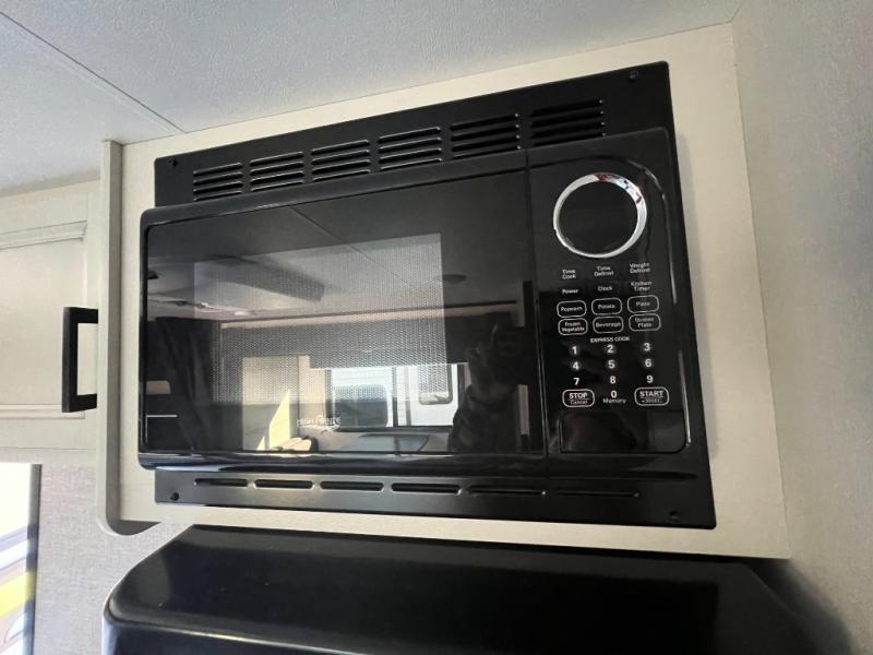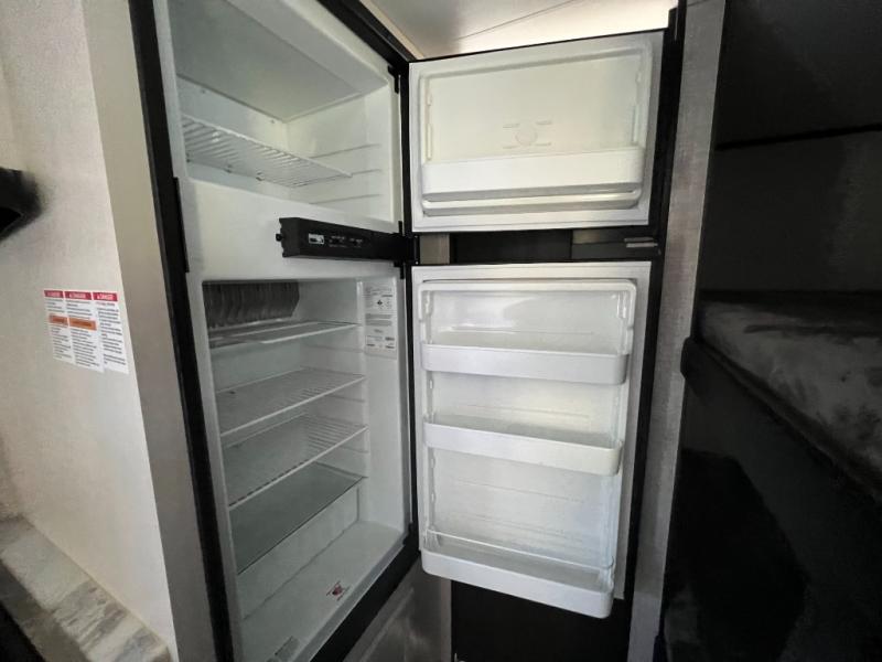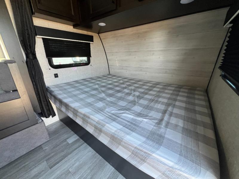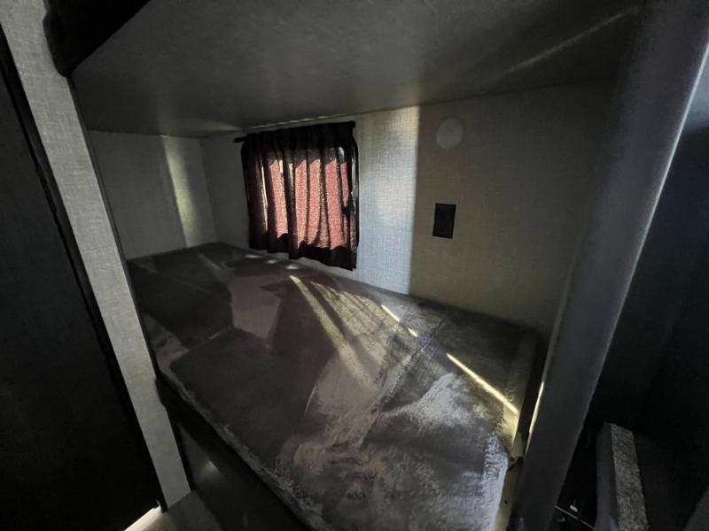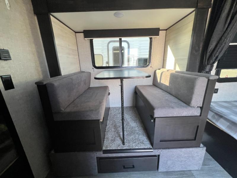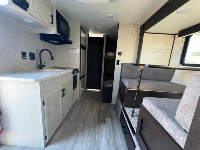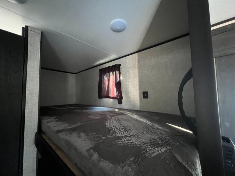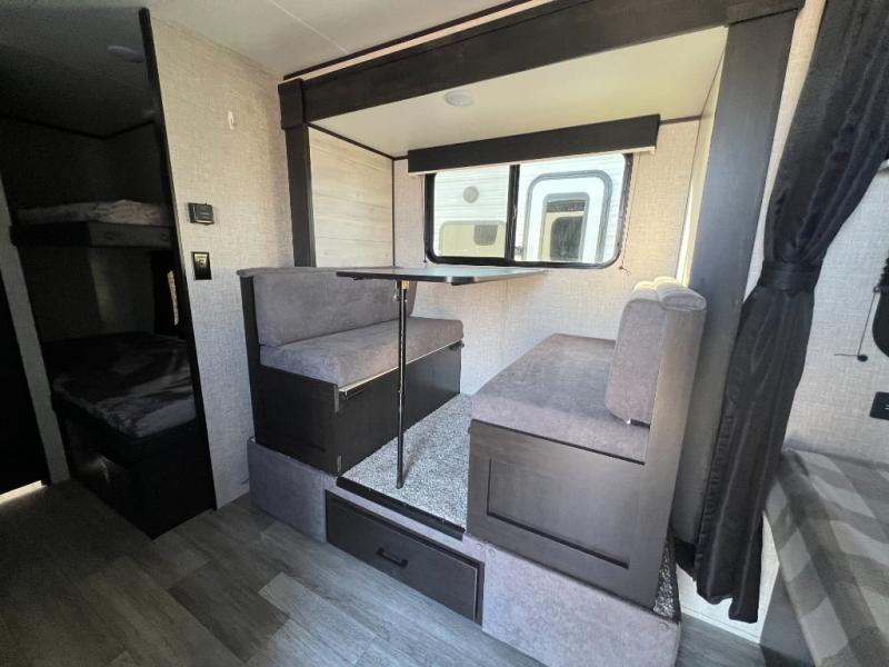 There is room to sleep five people in this Jay Flight SLX travel trailer with the 29" x 75" bunk beds, a booth dinette once converted, and on the RV queen bed. There is also added living space thanks to the single slide, and the private bathroom adds convenience for everyone with its tub/shower and toilet. The kitchen has all of the necessities for you to create delicious meals, like an 8-cubic foot refrigerator, microwave oven, and two-burner range, and you also have overhead cabinets to use for keeping your items organized.