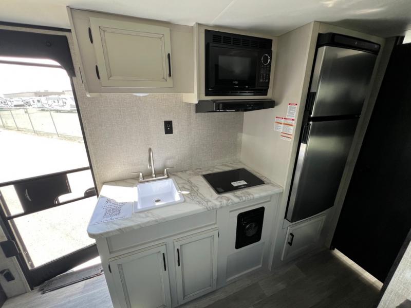 This Jay Flight SLX 7 travel trailer offers you a queen-size bed for sleeping at night, and there is even a privacy curtain that you can draw to separate the bed from the rest of the trailer too. The 29" x 75" bunk beds are another sleeping location, and you can even create a bed for one more person by transforming the booth dinette. Overhead cabinets will help you keep your belongings organized, and the kitchen has a two-burner range, 6-cubic foot refrigerator, residential-style countertops, microwave oven, and a high-rise faucet at the sink to help you prepare meals.