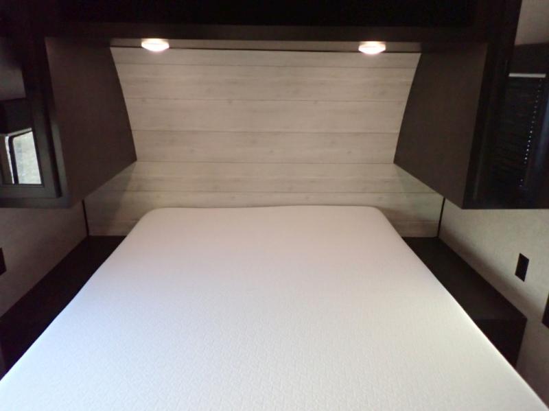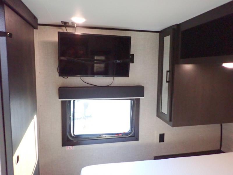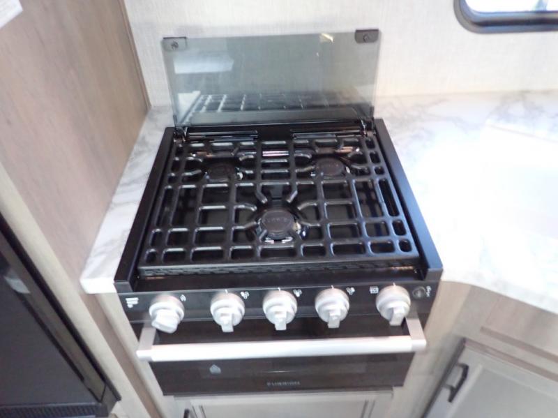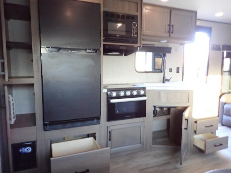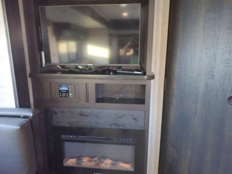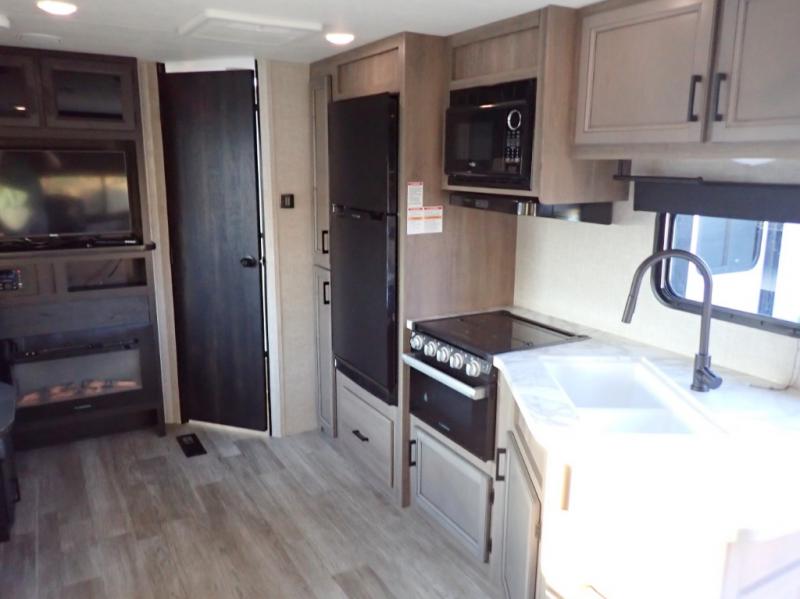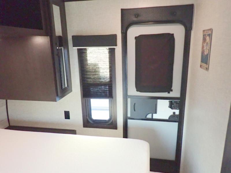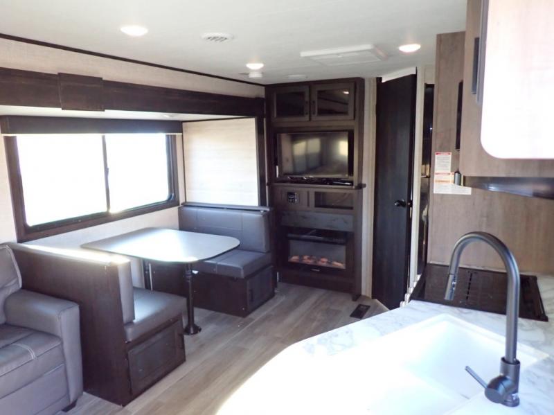 When you want to travel and see new places, this trailer gives you the flexibility to sleep two to four, plus offers a full walk-through bathroom with access from the main area and the front private bedroom. You will also appreciate having a second entry/exit door in the bedroom, a walk-around queen bed, plus dual wardrobes giving you your own side of the bed. The bathroom also has a radius shower and linen storage. The kitchen includes full amenities to make your own meals, and a pantry to keep your dry goods and snacks. You will love the rear swivel rockers with table in between to place your drinks, and the jack-knife sofa plus booth dinette offer more seating, sleeping space, and extra floor space since they are within a slide.