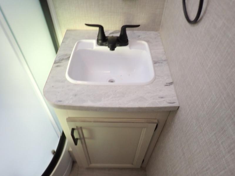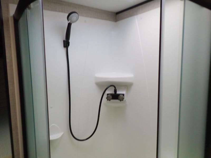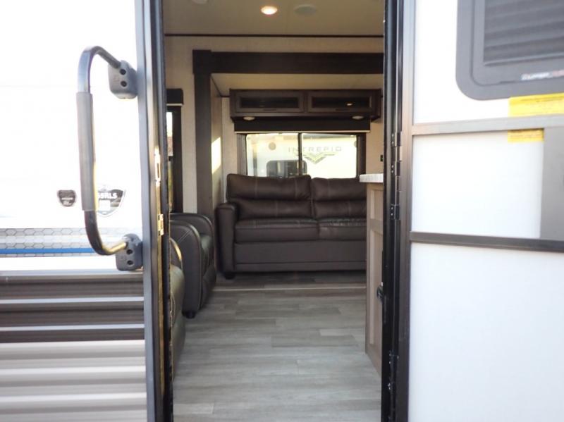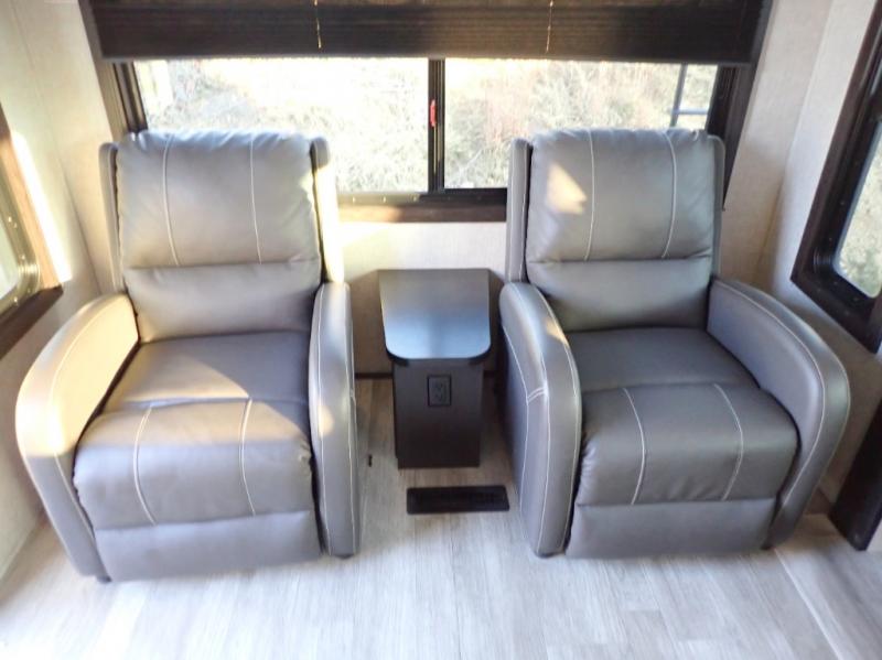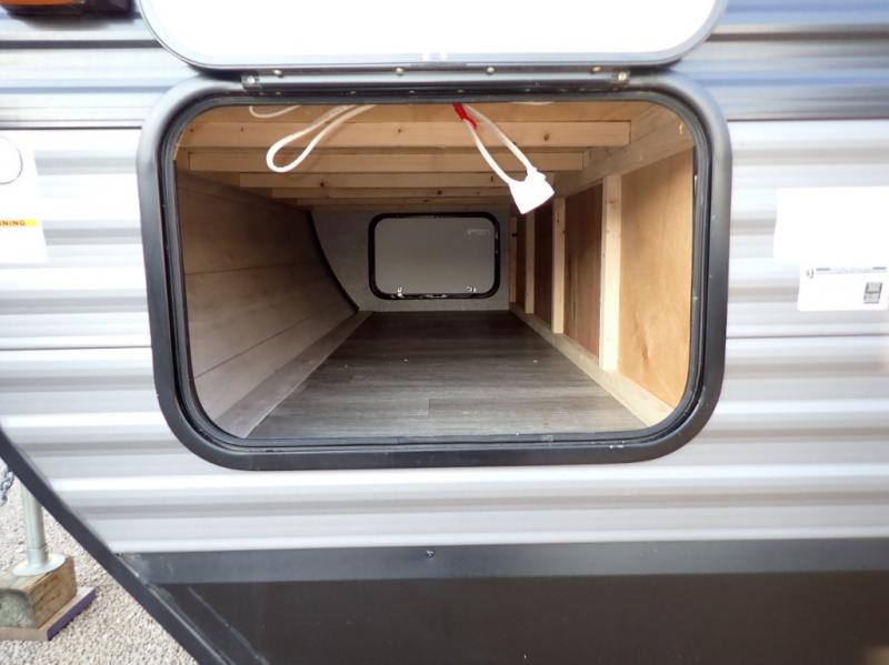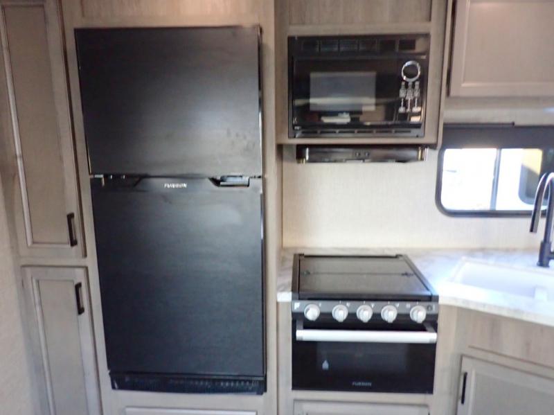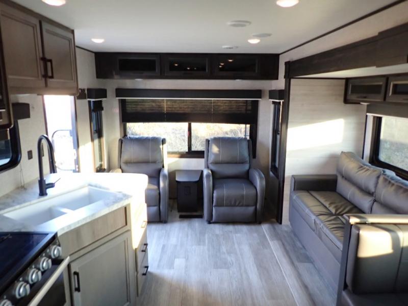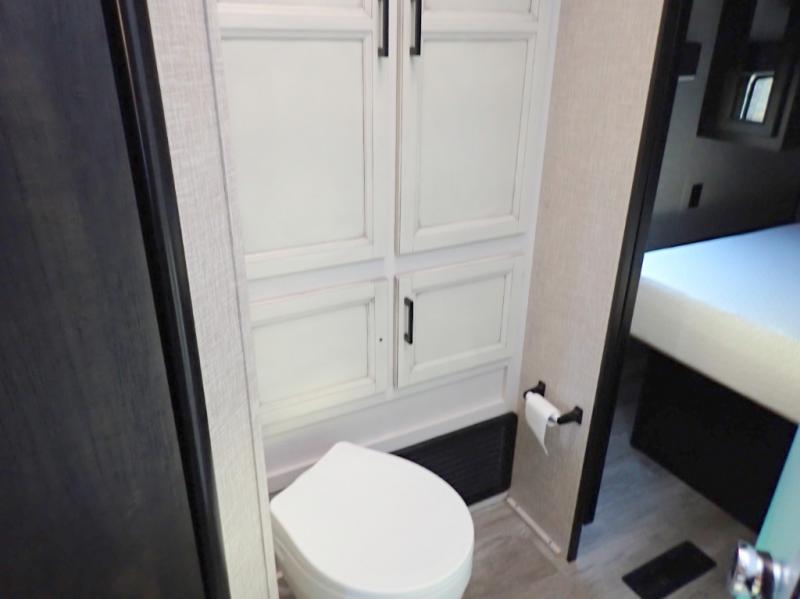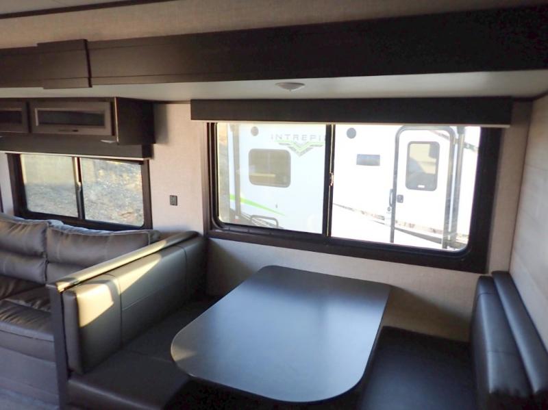 When you want to travel and see new places, this trailer gives you the flexibility to sleep two to four, plus offers a full walk-through bathroom with access from the main area and the front private bedroom. You will also appreciate having a second entry/exit door in the bedroom, a walk-around queen bed, plus dual wardrobes giving you your own side of the bed. The bathroom also has a radius shower and linen storage. The kitchen includes full amenities to make your own meals, and a pantry to keep your dry goods and snacks. You will love the rear swivel rockers with table in between to place your drinks, and the jack-knife sofa plus booth dinette offer more seating, sleeping space, and extra floor space since they are within a slide.
