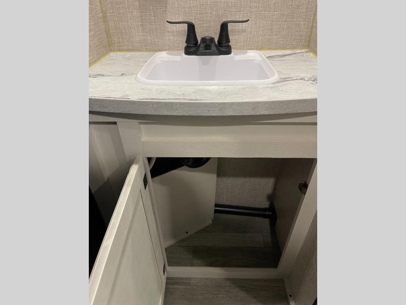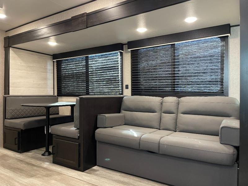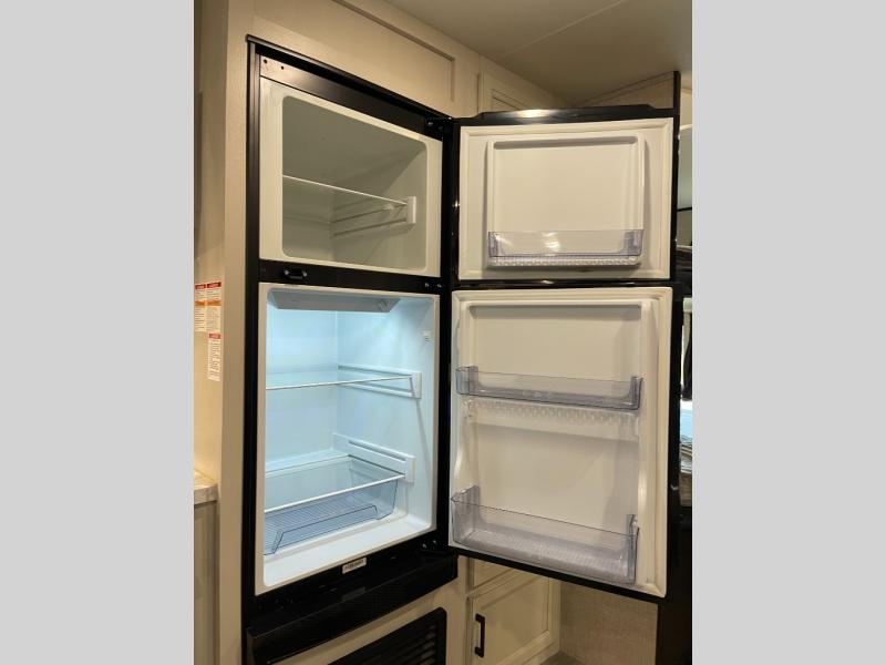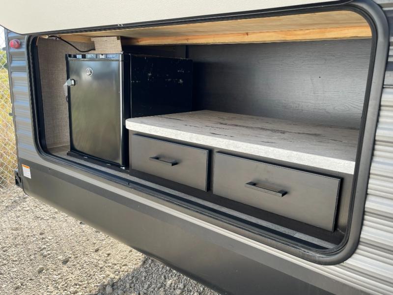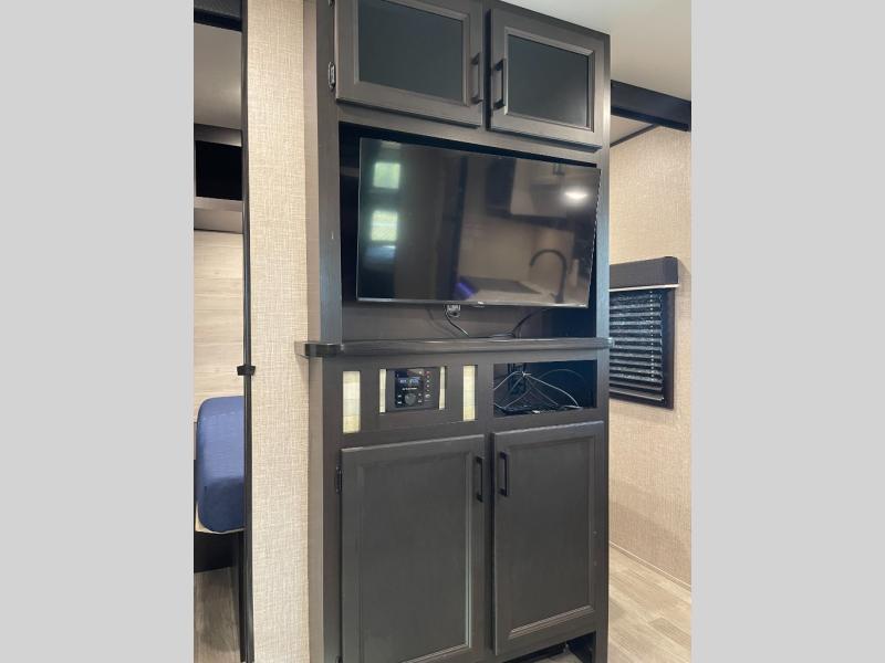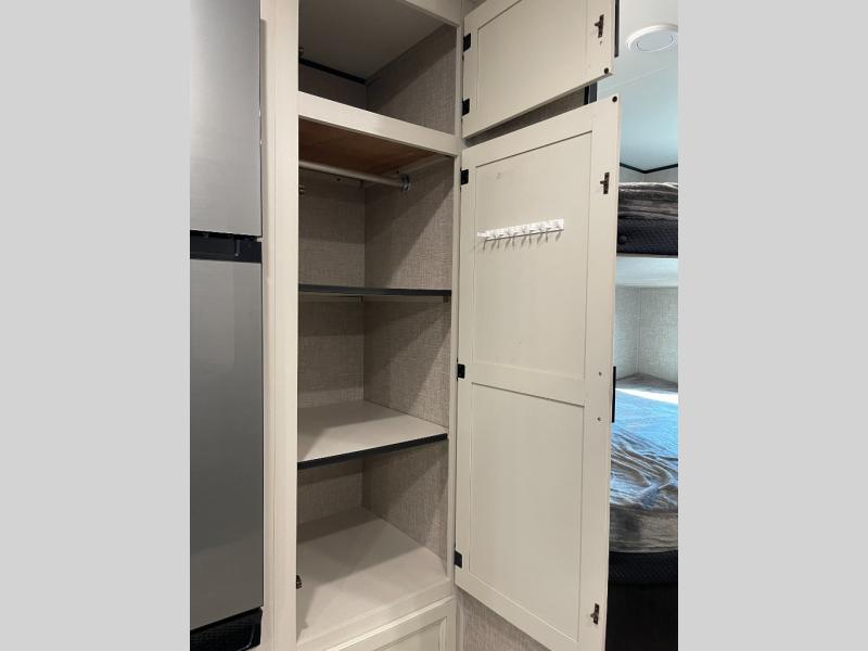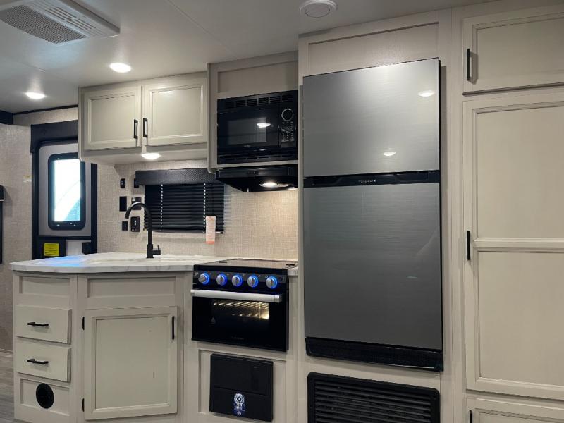 A larger family or group of friends can enjoy camping together in this trailer thanks to the booth dinette and jack-knife sofa slide providing more interior floor space and a place for two or maybe more to sleep at night. And the double size bunks are a fun place to sleep when you need four more spots, plus the privacy curtain will come in handy. The private toilet and tub/shower will keep everyone refreshed and the bathroom sink is just outside the door allowing two people to get ready at one time. The front bedroom offers the owners privacy and there is dual access, two wardrobes and a queen bed to enjoy. The cook will find full amenities indoor, plus there is an outside kitchen to make more meals.