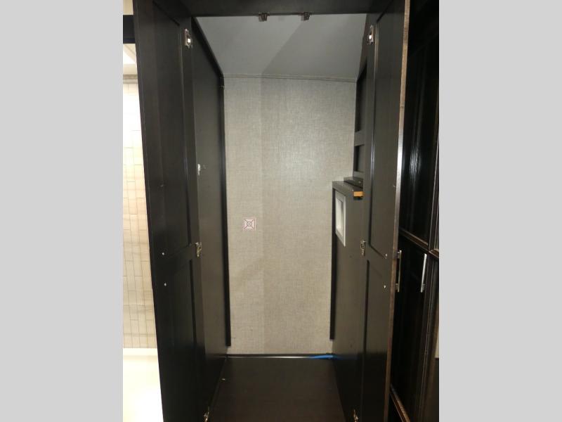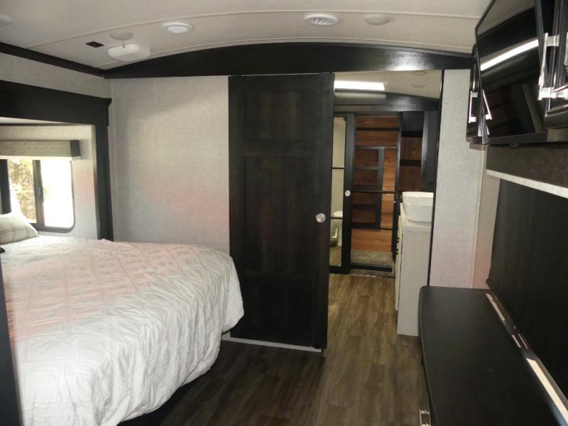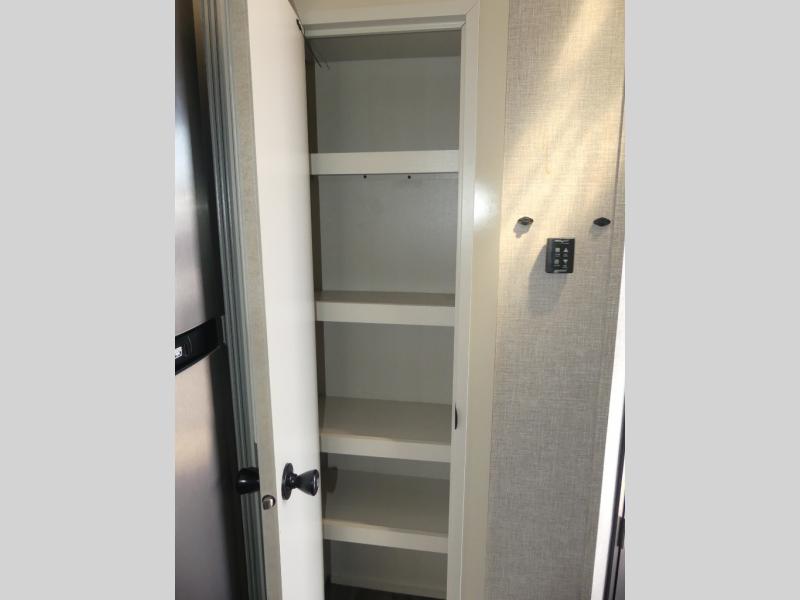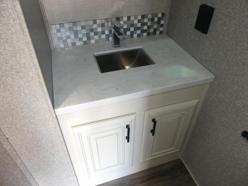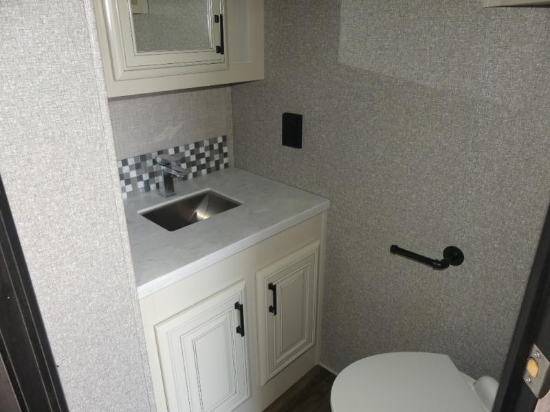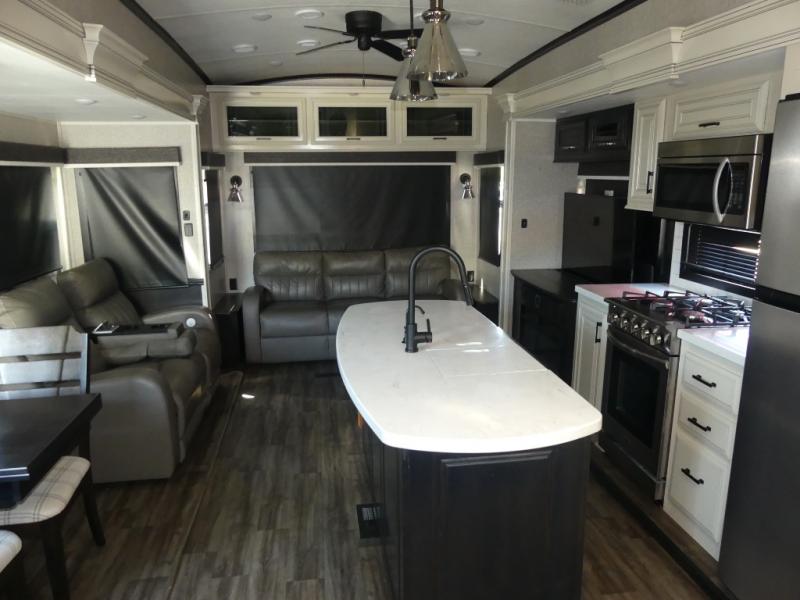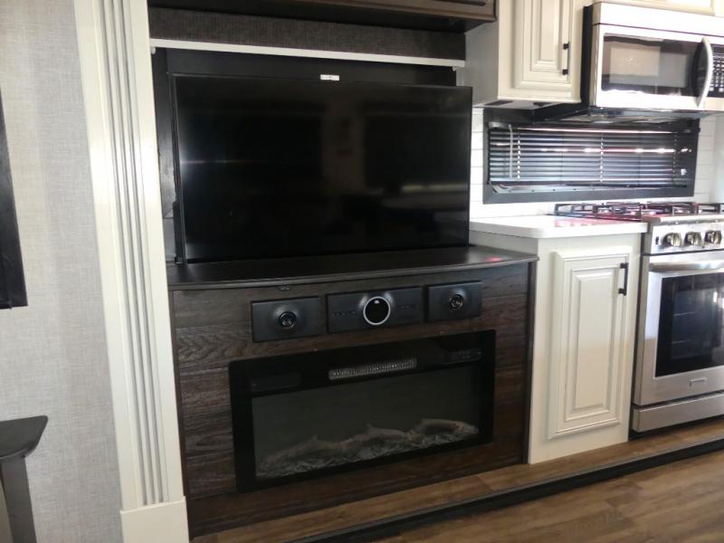 You can't go wrong with this fifth wheel that can sleep four! You will love how much space you have in the main living area thanks to the dual opposing slides, and there is a kitchen island here with a pull-out extension for added prep space. The convenient half bath is right off of the kitchen for quick restroom breaks, and you'll find a shoe garage and a wardrobe just as you enter the unit to keep the RV tidy. Head to the master bedroom for a rest on the queen bed slide out, or you may want to watch a show on the 32" bedroom TV. The front master bath may be your favorite feature of this unit. Here, you'll find dual bath sinks, a walk-in shower with a seat, plus a spacious walk-in closet for your clothes. And don't overlook the exterior with its two power awnings, 32" exterior TV, and a Jayport with LP quick connect for your outdoor grill.