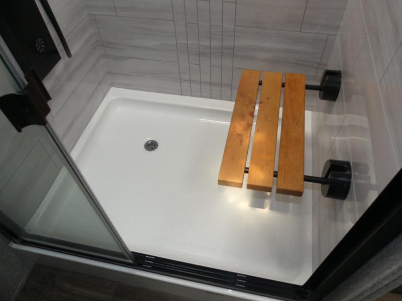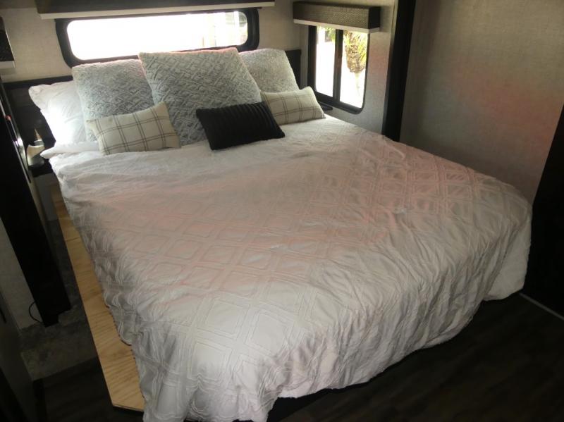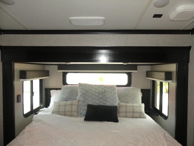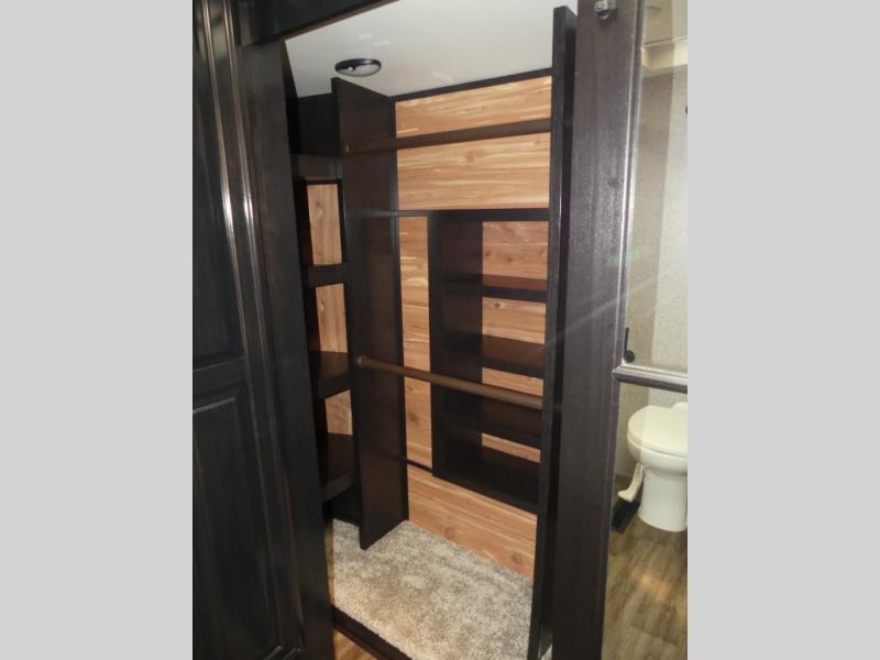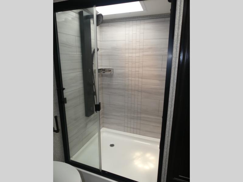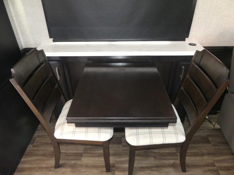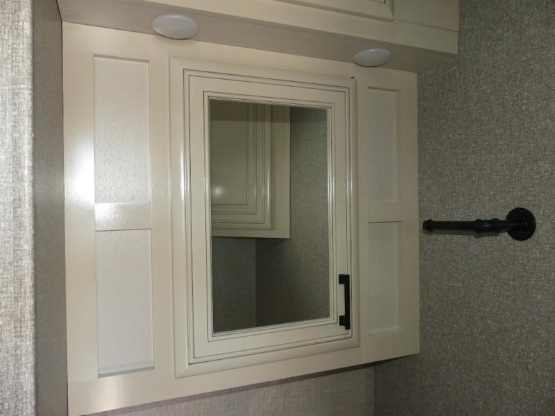 You can't go wrong with this fifth wheel that can sleep four! You will love how much space you have in the main living area thanks to the dual opposing slides, and there is a kitchen island here with a pull-out extension for added prep space. The convenient half bath is right off of the kitchen for quick restroom breaks, and you'll find a shoe garage and a wardrobe just as you enter the unit to keep the RV tidy. Head to the master bedroom for a rest on the queen bed slide out, or you may want to watch a show on the 32" bedroom TV. The front master bath may be your favorite feature of this unit. Here, you'll find dual bath sinks, a walk-in shower with a seat, plus a spacious walk-in closet for your clothes. And don't overlook the exterior with its two power awnings, 32" exterior TV, and a Jayport with LP quick connect for your outdoor grill.