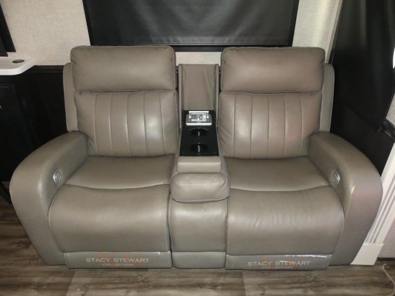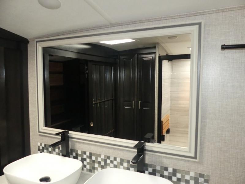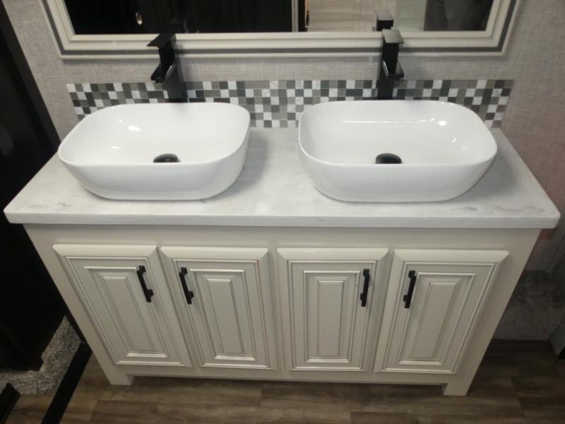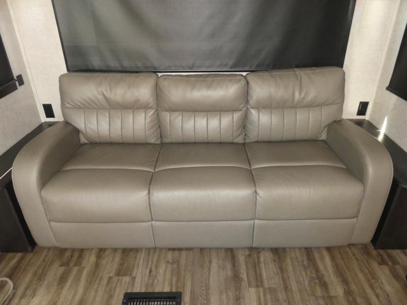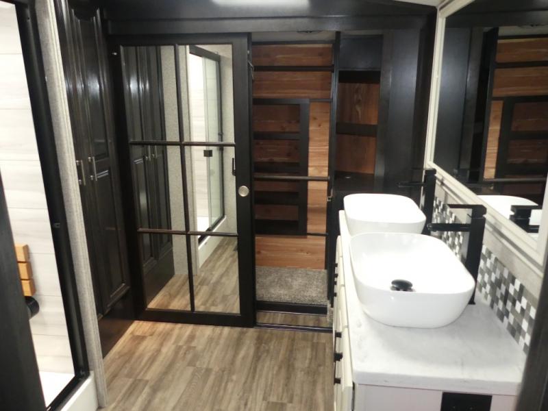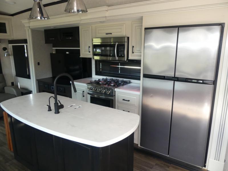 Each Pinnacle fifth wheel features Stronghold VBL lamination for the lightest, yet strongest construction in the RV industry. Add that to the Magnum Truss XL6 roof system and Climate Shield zero-degree tested weather protection and you'll be enjoying your fifth wheel for years to come. Some of the exterior conveniences you will appreciate are the Keyed-Alike lock system, the fully enclosed, universal docking center, and the 6-point hydraulic auto-leveling system for quick and easy set up. The 5 Star Handling Package will make towing a fifth wheel a walk in the park, and the two Whisper Quiet A/C units will keep you comfortable during the hot summer months. Inside, you'll enjoy the farmhouse stainless steel sink, the handcrafted hardwood glazed cabinetry, the vinyl flooring throughout, plus many more comforts. There is even a central vacuum system, a wireless remote control system, USB ports throughout, plus many more conveniences to make each trip enjoyable.