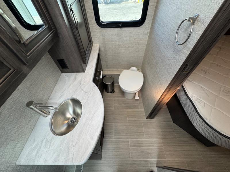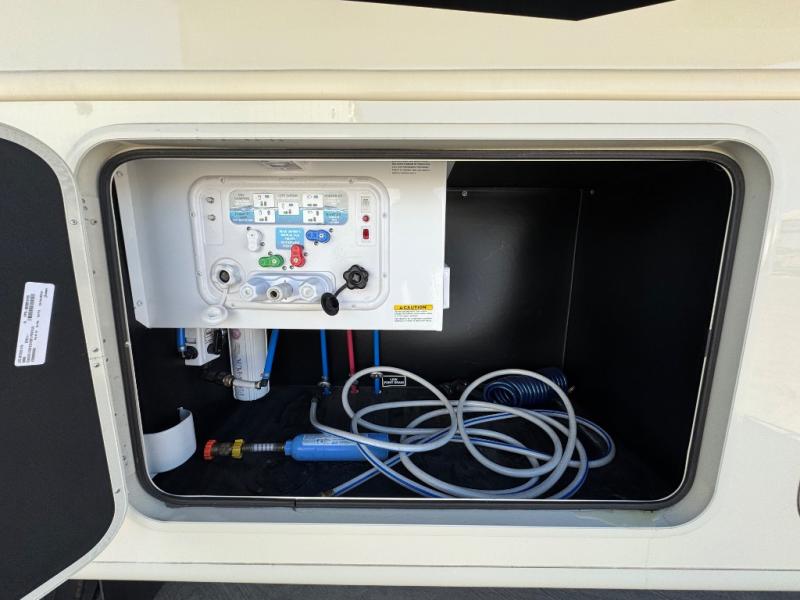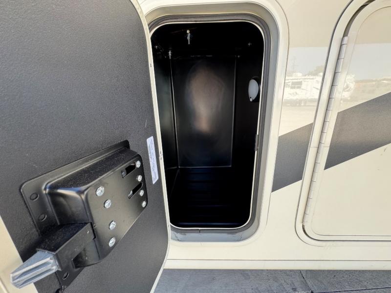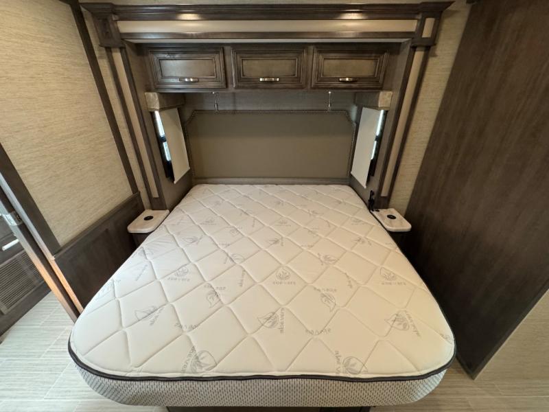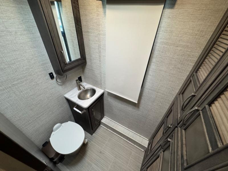Enjoy the privacy of a rear master suite with a king-size bed, wardrobe storage, and an en-suite full bath. A half bath mid-coach is perfect for guests or quick use while traveling.