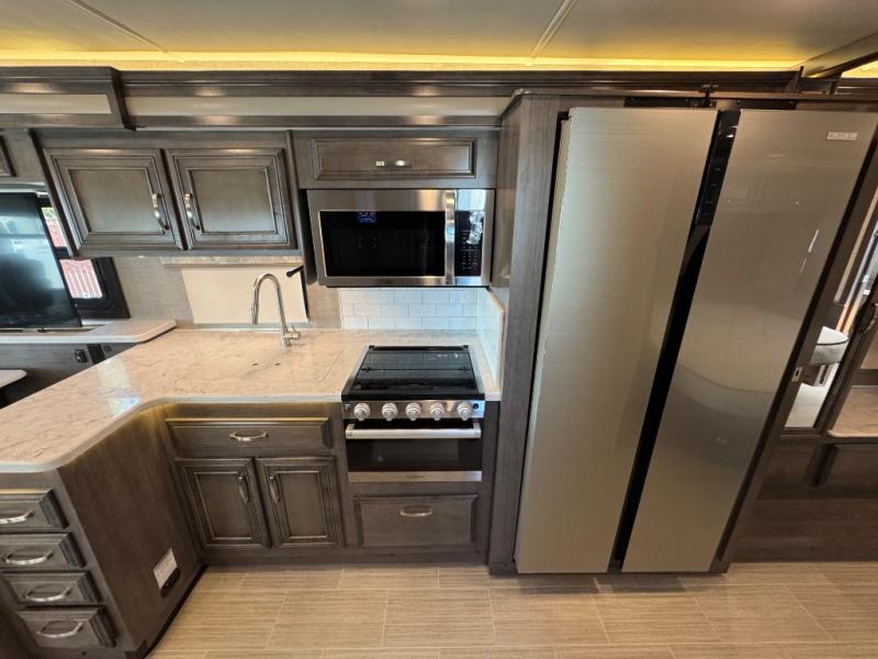 The kitchen includes solid-surface countertops, a residential fridge, convection microwave, and a three-burner range—perfect for preparing meals on the road.