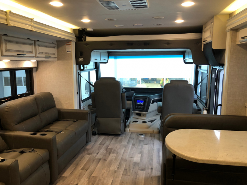 The Jayco Precept Class A gas motorhome comes with some features that you'll only find on a Jayco product, like the JRIDE PLUS which offers you a powerful blend of precise handling and renowned stability on the road and the JAYCOMMAND system powered by Firefly which allows you to control your coach's operations from just about anywhere with your phone. You'll find two-point lap seatbelts in all designated seating locations, and the one-piece, seamless fiberglass front and rear caps resist wear and tear over the years. The Precept also offers you the lightest yet strongest construction in the industry with the Stronghold VBL lamination on the roof, floor, and sidewalls. You'll also be very pleased to find a 120" panoramic windshield (the largest in the industry), automatic hydraulic leveling jacks, an Onan® Marquis Gold Genset 5,500W gas generator with auto-gen start, and a Girard® tankless LP water heater.