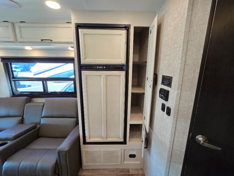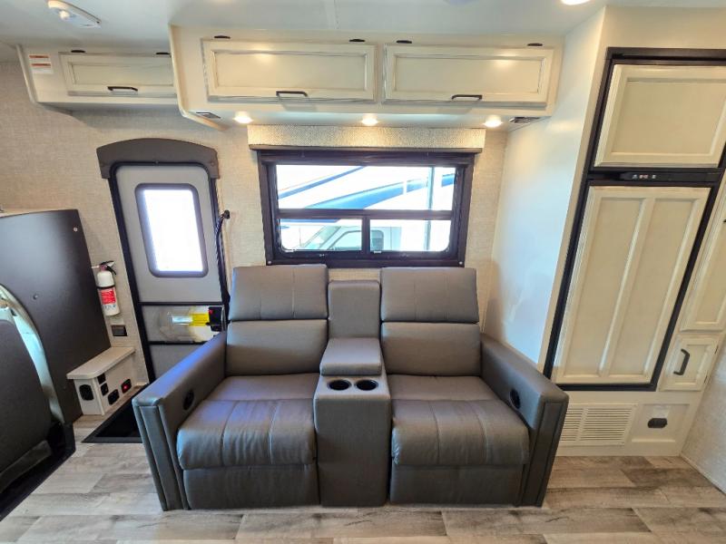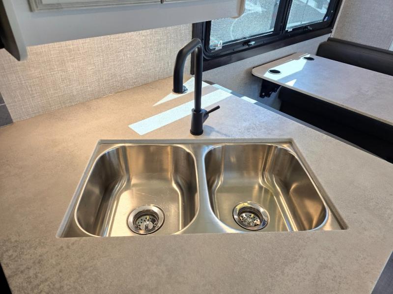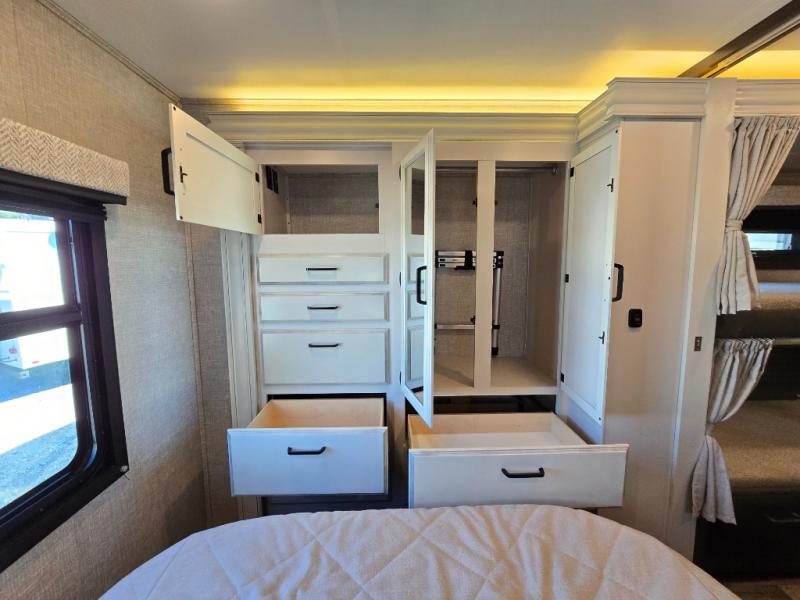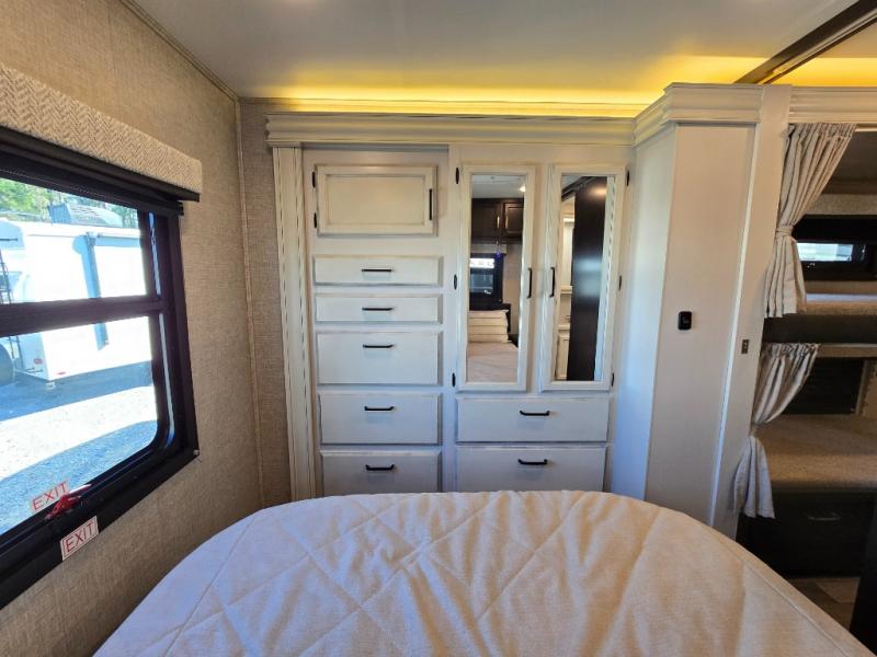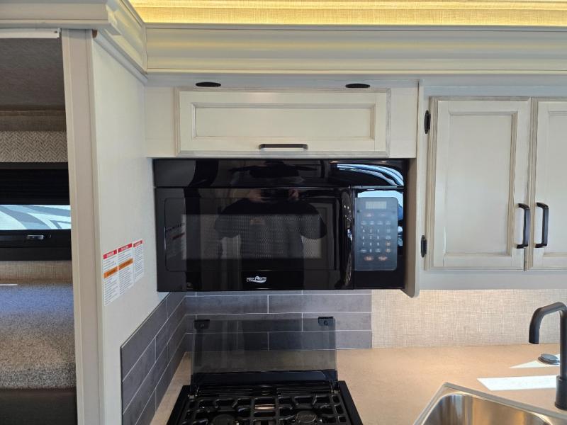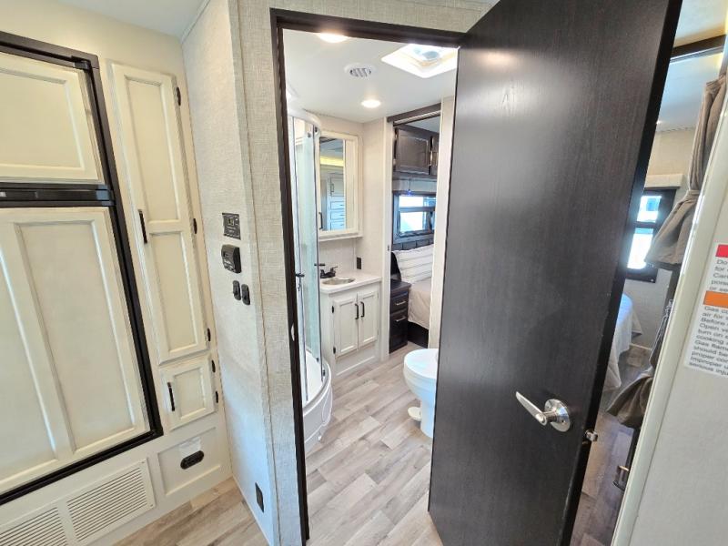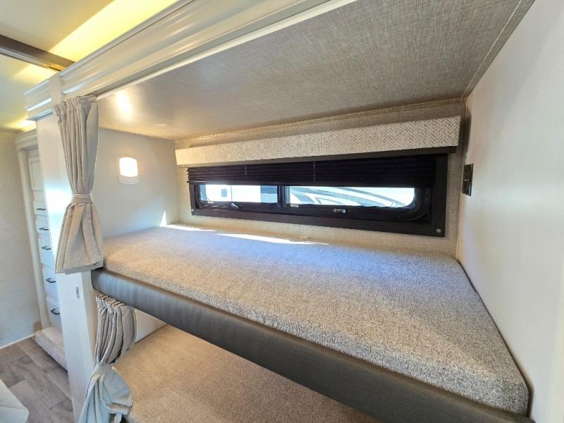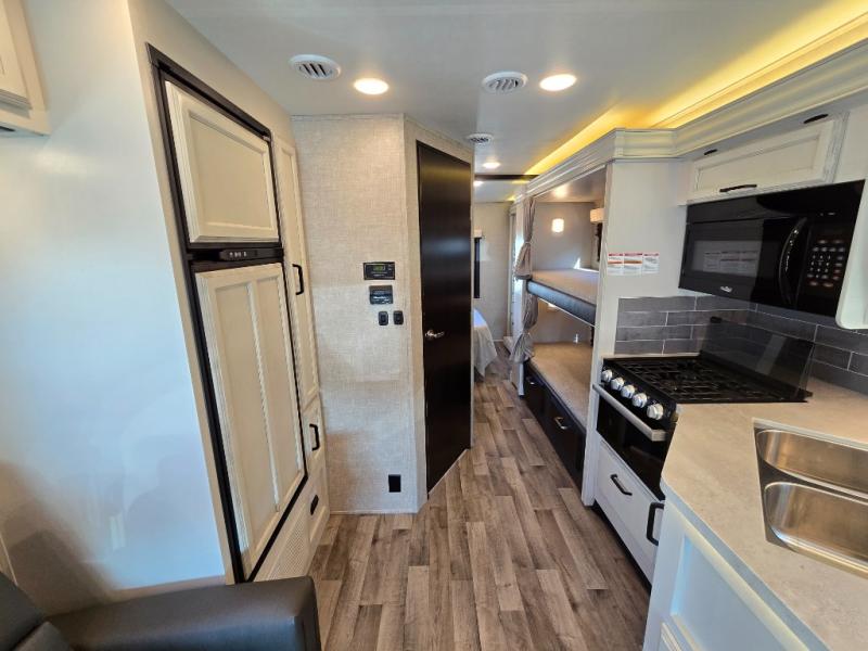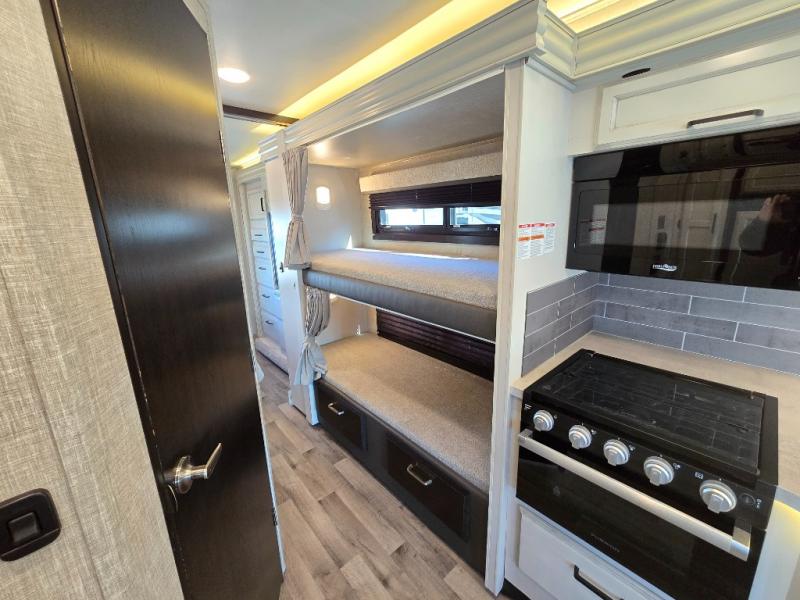 Searching for an RV to travel with family and friends? This coach offers up to seven sleeping spaces when you utilize the queen bed, the bunk beds, the cab over bunk and the furniture. The private master bedroom is in the rear and has access to the double entry bathroom, and the bunk beds are just across from the main entrance which is convenient. The kitchen provides a Furrion all-in-one cooktop and oven, a residential-size microwave and an 8 cu. ft. refrigerator, plus a pantry. You can dine at the Jayco exclusive, easy-operation legless dinette table or while sitting on the sofa. You might like to add the theater seating option in place of the sofa if you prefer that setup. And the cab seats swivel for more seating.