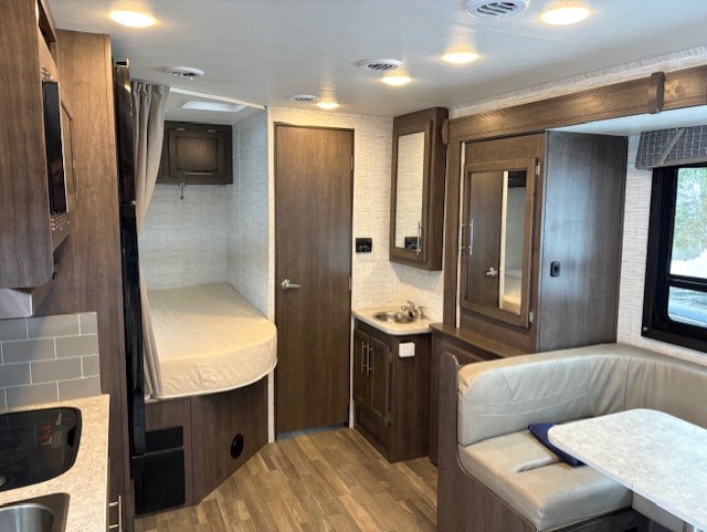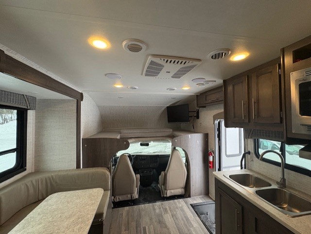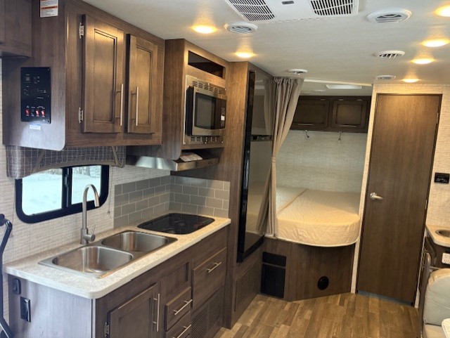 Your small family will love traveling in this motorhome! Everyone will enjoy a good night's rest between the queen bed, the bunk over cab, and even the 42" x 76" U-shaped dinette once converted. The rear corner bathroom has a 24" x 32" shower and toilet together with a vanity sink just outside. You can prepare your best meals with the two burner cooktop, store any leftovers in the 8 cu. ft. refrigerator, and clean up in a breeze with the stainless steel sink, plus there is a convection microwave oven for those nights when you don't feel like cooking!