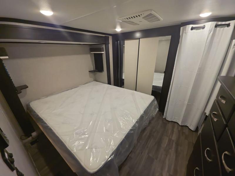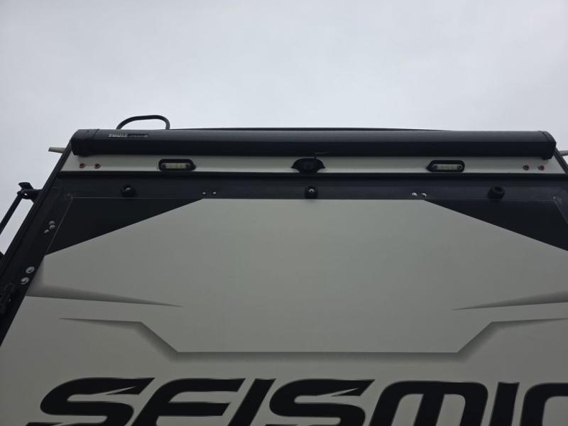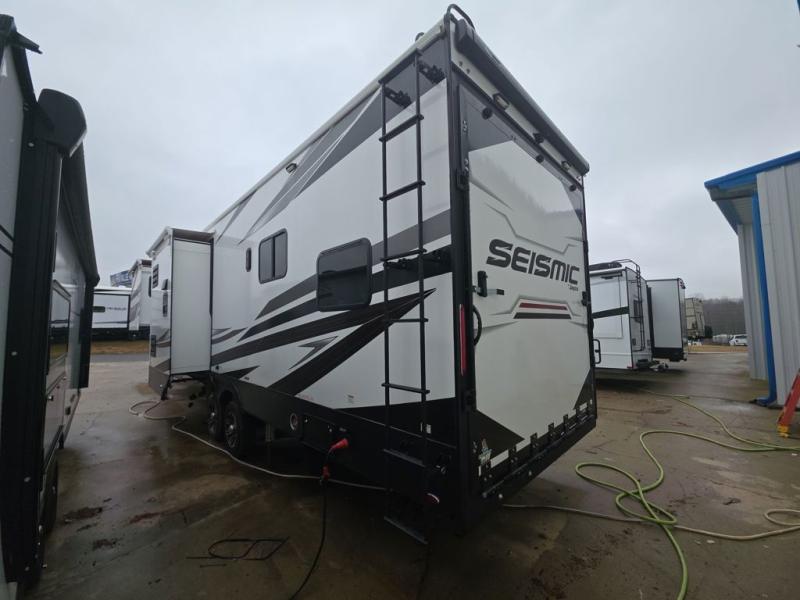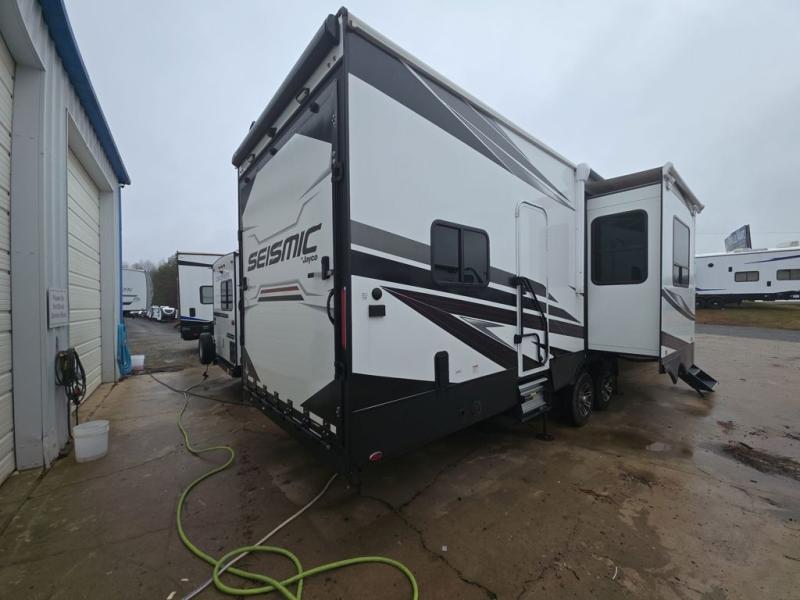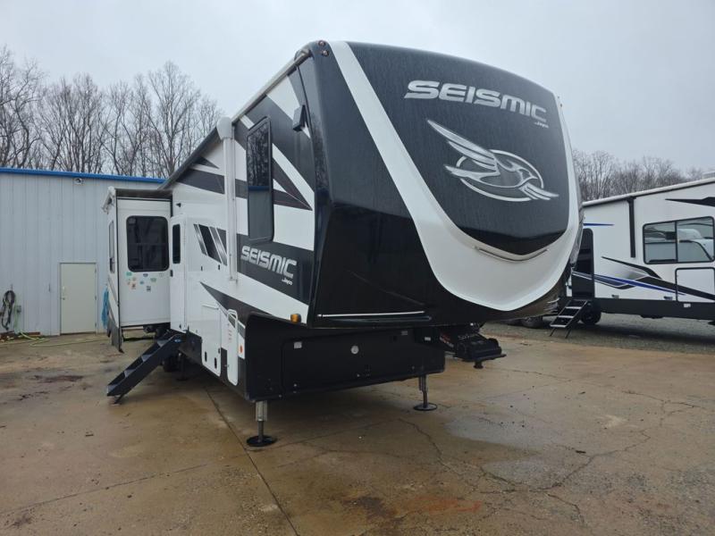 One look at the Seismic toy haulers by Jayco, and you'll never go back! Each model features a custom automotive-grade vinyl exterior graphics package, a painted fiberglass front cap with built-in LED lighting, and 102" wide-body structural steel I-beam construction. You'll find the pass-through storage with Slam-Latch baggage doors will make unpacking easier than ever, and the rear ramp door/patio with anti-slip, non-skid flooring will allow you to unload your toys with no trouble at all. These toy haulers feature a three seasons garage wall/doors, a 30 gallon fuel tank with a timer, and exterior marine-grade speakers to keep the party going. The Climate Shield zero degree tested weather protection includes a 35,000 BTU furnace, PEX plumbing, and a fully enclosed and heated underbelly so you can enjoy your adventures year around. And we haven't even touched on the interior luxuries you'll find, like solid hardwood cabinet doors, drawers, and trim, and a residential king mattress with under-bed storage!