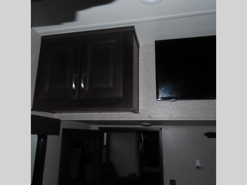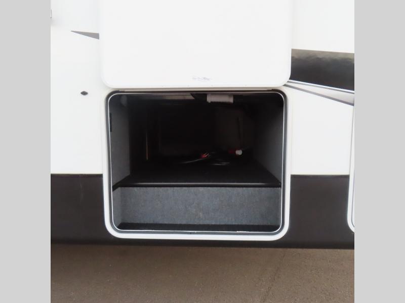 It's time to enjoy your toys and outdoor fun in this toy hauler! This separate garage offers an electric queen bed above rear convertible sofas, a second entry door, a half bath plus a place to add a washer/dryer option if you like. Your friends can have their own space when they join you. And the party deck will be a popular hangout everywhere you go! The separate living and kitchen area offers patio doors to get to the side patio party deck with an exterior TV so you can relax above ground while outdoors. Back inside you will have a SuperSofa with heat, massage, recliners, cupholders and LED lighting to enjoy while watching the Smart LED HDTV with a fireplace below. The chef will have a U-shaped countertop with all the kitchen amenities such as a 30" residential microwave, and the refrigerator is just a few steps away. Everyone can take turns getting cleaned up in the inventive side-aisle bath with a walk-in shower. The front master bedroom has a walk-around king bed for all-around comfort, plus a slide out with a dresser and two wardrobes that stretches into the hallway.