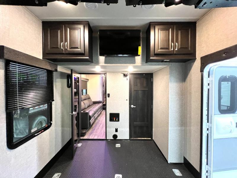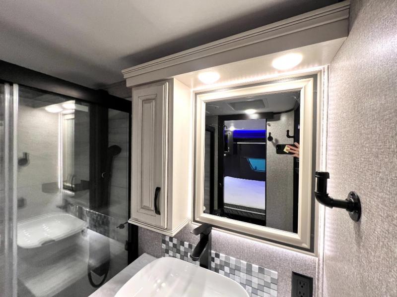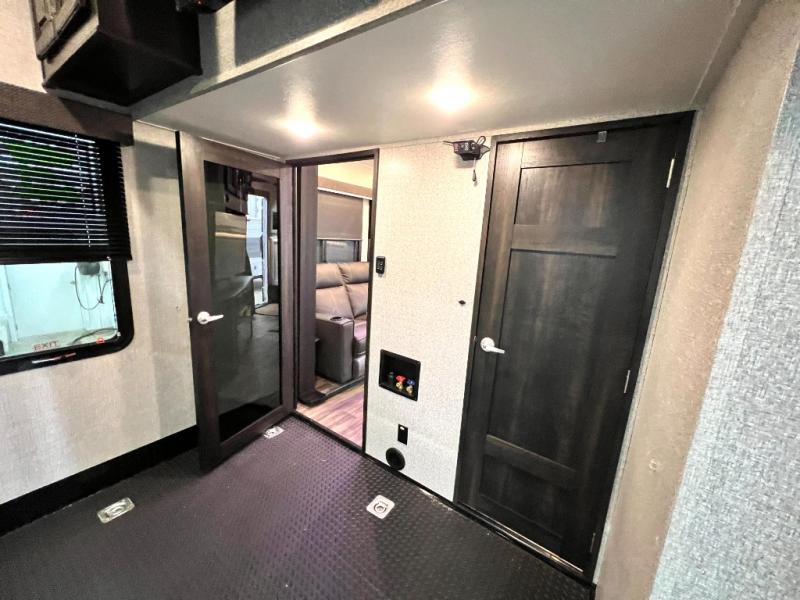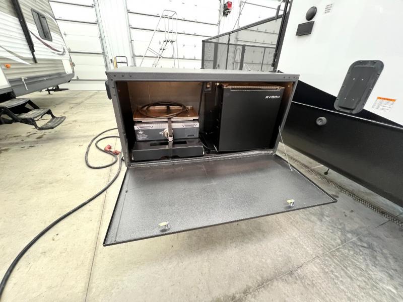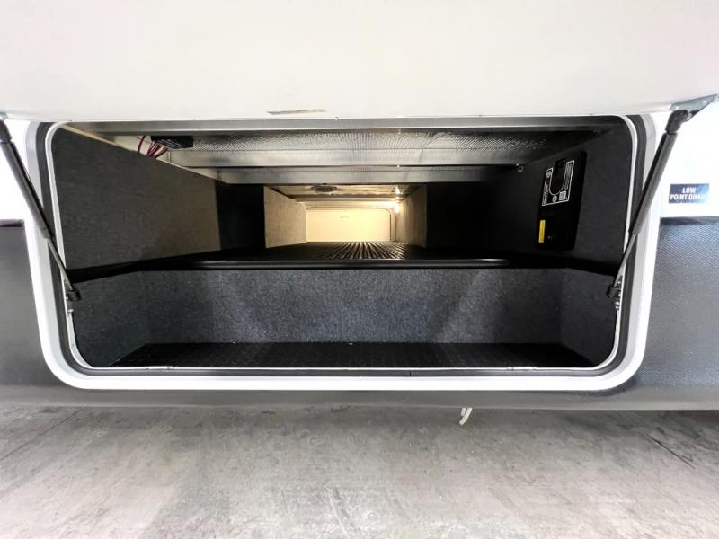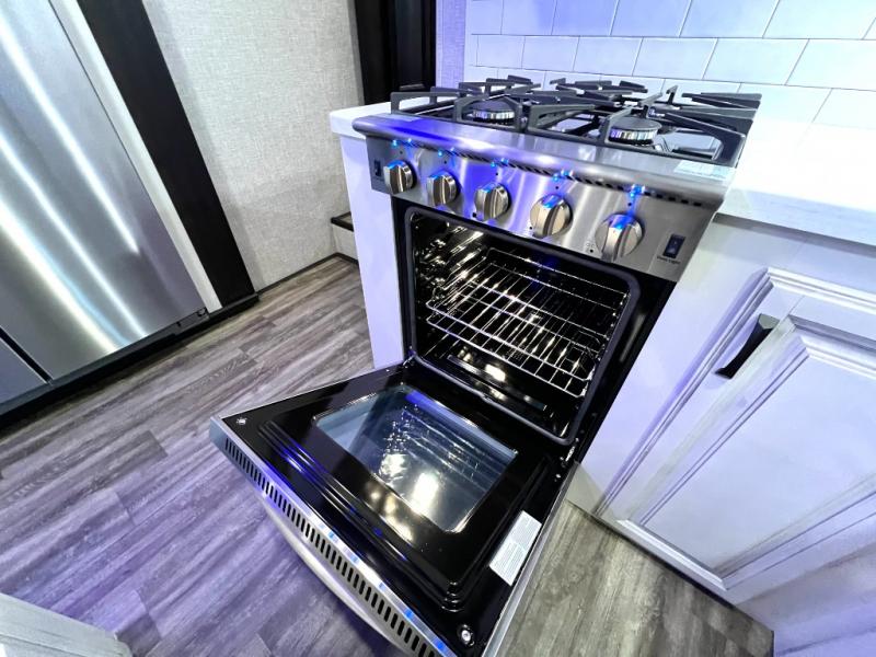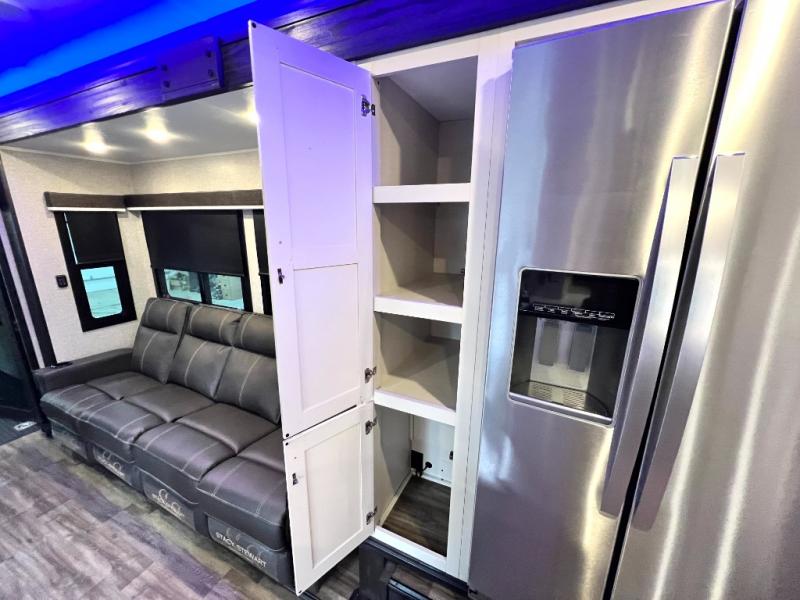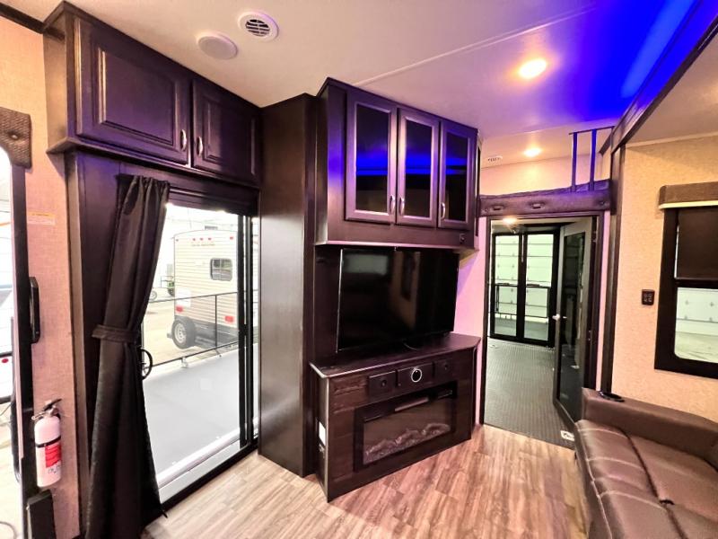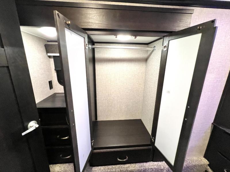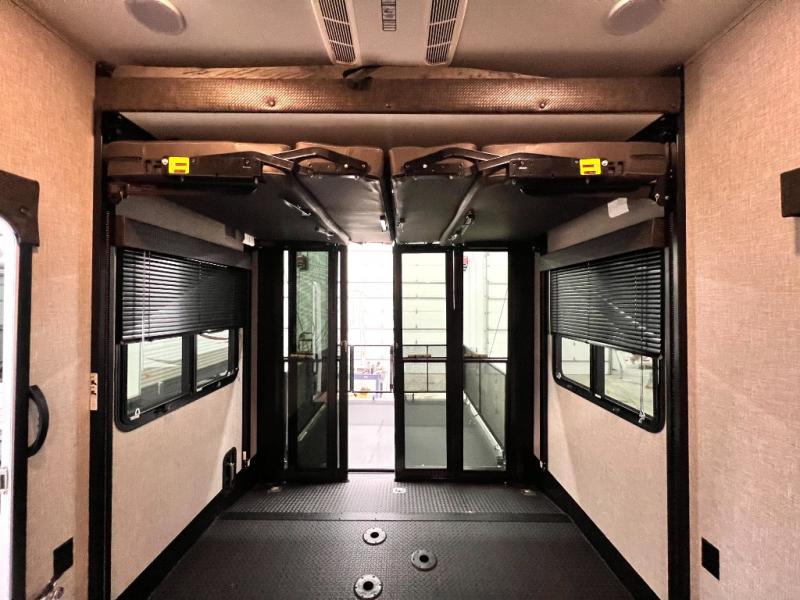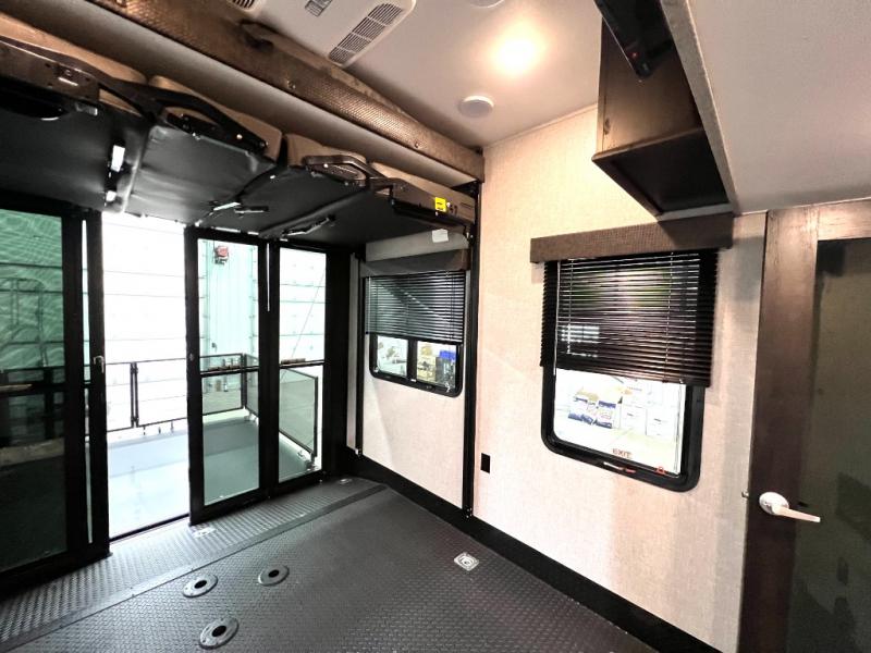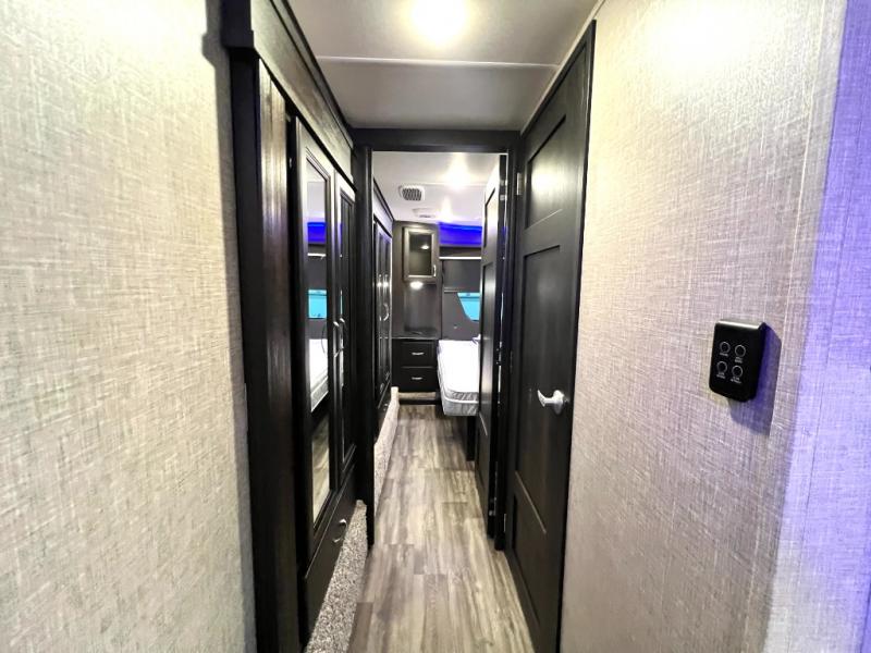 It's time to enjoy your toys and outdoor fun in this toy hauler! This separate garage offers an electric queen bed above rear convertible sofas, a second entry door, a half bath plus a place to add a washer/dryer option if you like. Your friends can have their own space when they join you. And the party deck will be a popular hangout everywhere you go! The separate living and kitchen area offers patio doors to get to the side patio party deck with an exterior TV so you can relax above ground while outdoors. Back inside you will have a SuperSofa with heat, massage, recliners, cupholders and LED lighting to enjoy while watching the Smart LED HDTV with a fireplace below. The chef will have a U-shaped countertop with all the kitchen amenities such as a 30" residential microwave, and the refrigerator is just a few steps away. Everyone can take turns getting cleaned up in the inventive side-aisle bath with a walk-in shower. The front master bedroom has a walk-around king bed for all-around comfort, plus a slide out with a dresser and two wardrobes that stretches into the hallway.