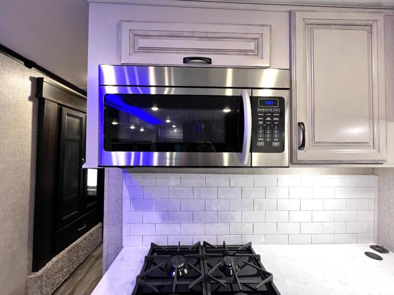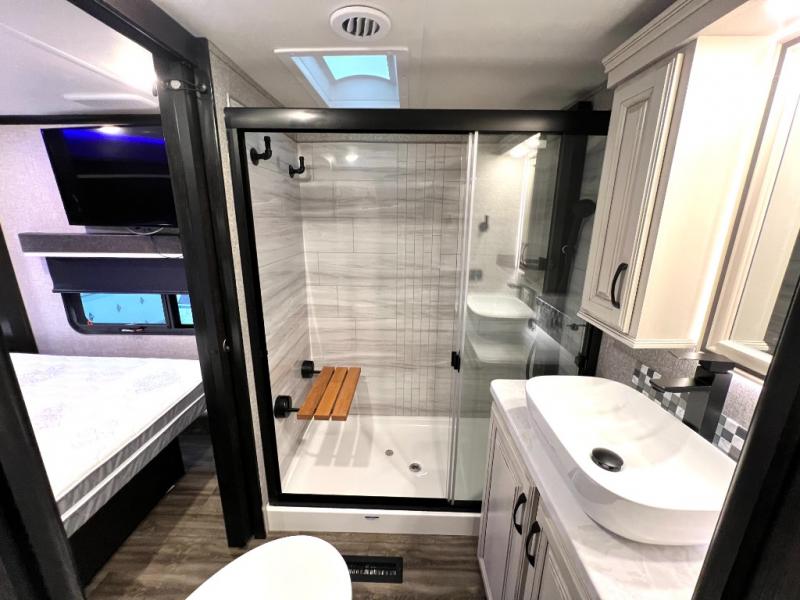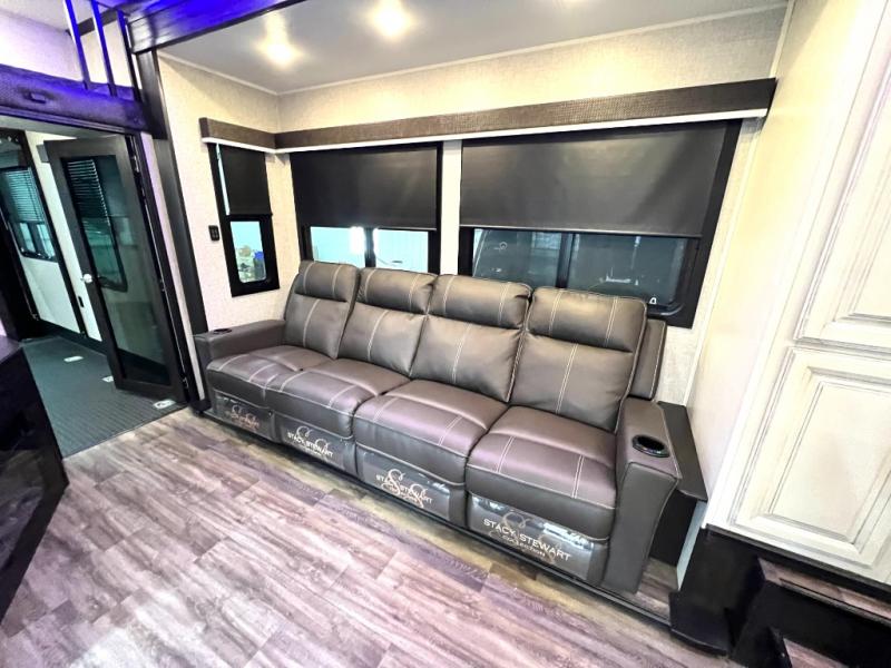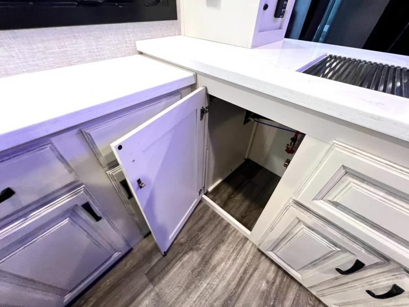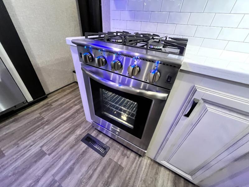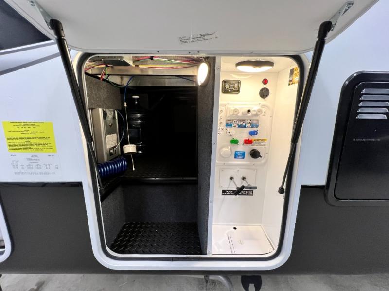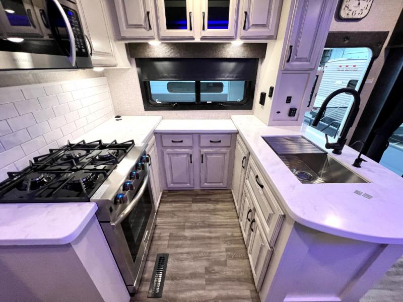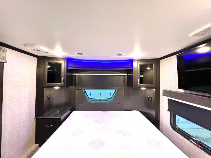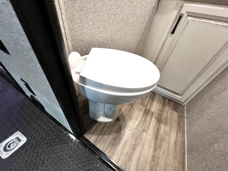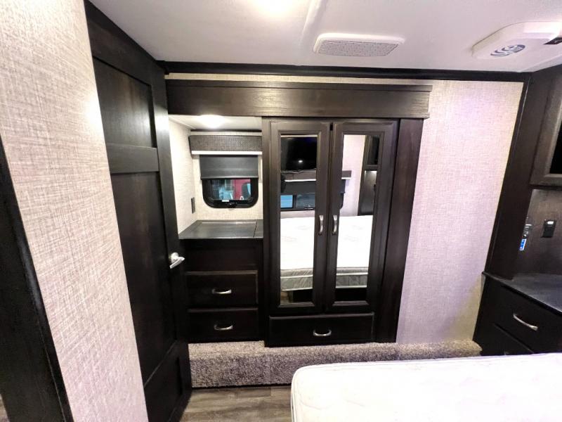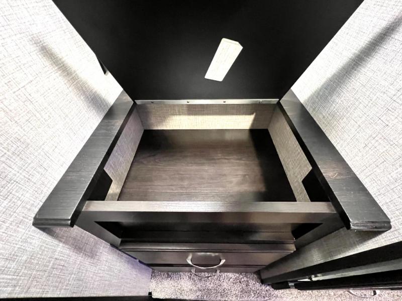 It's time to enjoy your toys and outdoor fun in this toy hauler! This separate garage offers an electric queen bed above rear convertible sofas, a second entry door, a half bath plus a place to add a washer/dryer option if you like. Your friends can have their own space when they join you. And the party deck will be a popular hangout everywhere you go! The separate living and kitchen area offers patio doors to get to the side patio party deck with an exterior TV so you can relax above ground while outdoors. Back inside you will have a SuperSofa with heat, massage, recliners, cupholders and LED lighting to enjoy while watching the Smart LED HDTV with a fireplace below. The chef will have a U-shaped countertop with all the kitchen amenities such as a 30" residential microwave, and the refrigerator is just a few steps away. Everyone can take turns getting cleaned up in the inventive side-aisle bath with a walk-in shower. The front master bedroom has a walk-around king bed for all-around comfort, plus a slide out with a dresser and two wardrobes that stretches into the hallway.