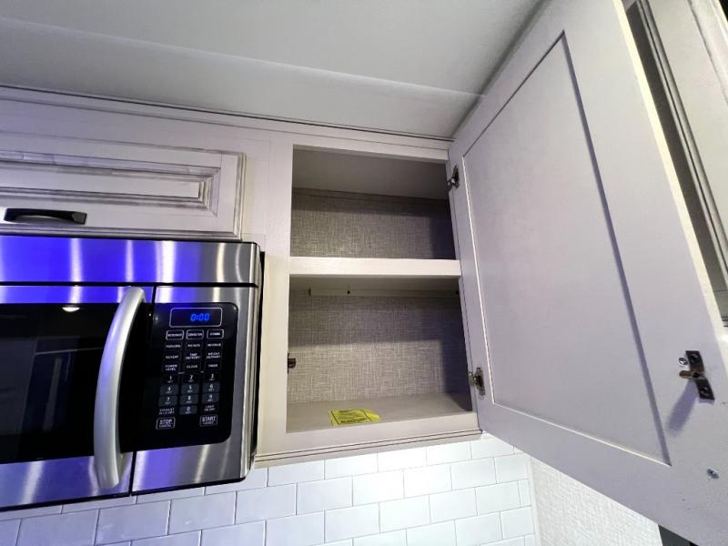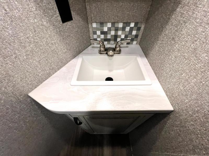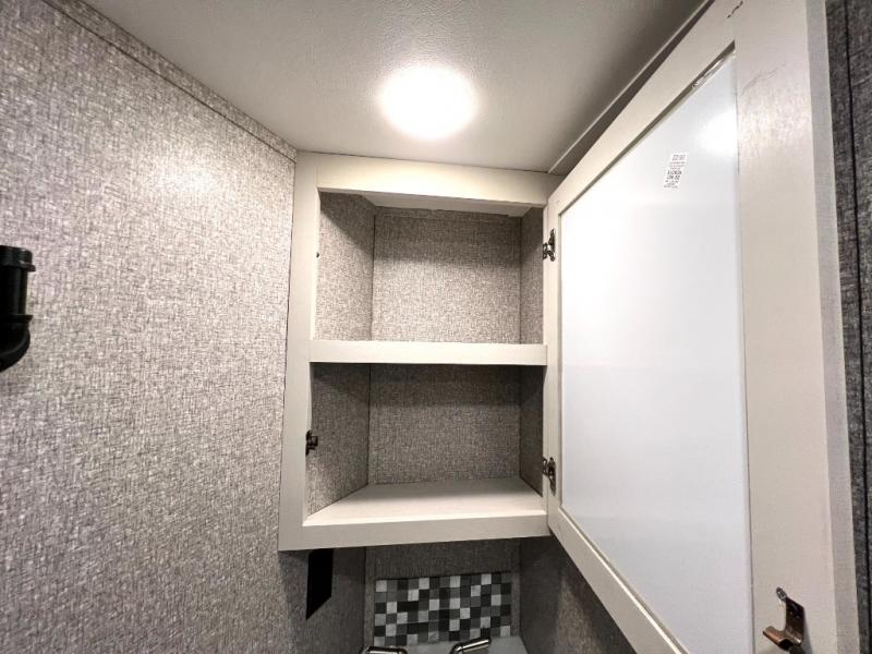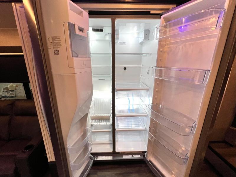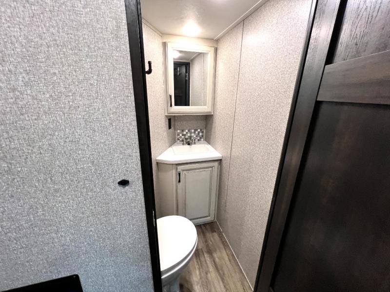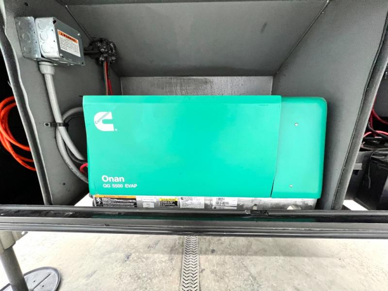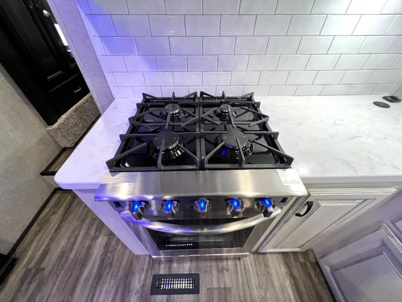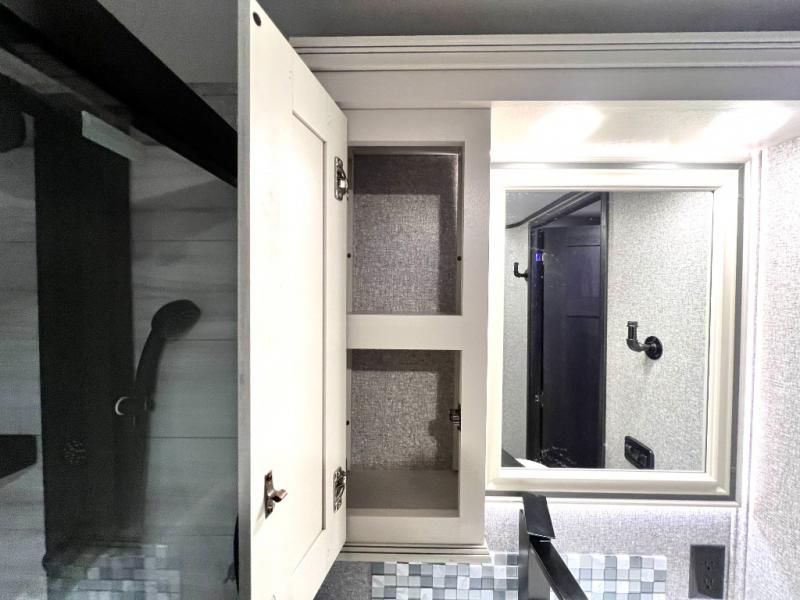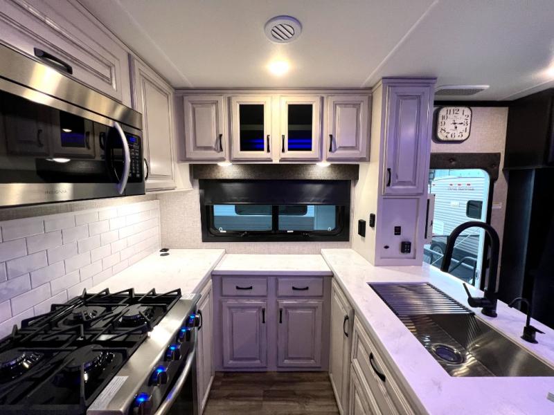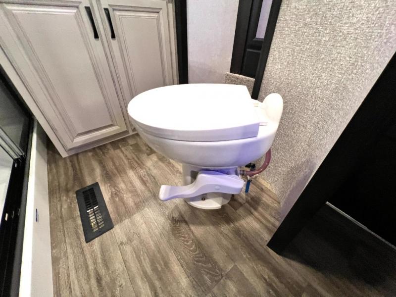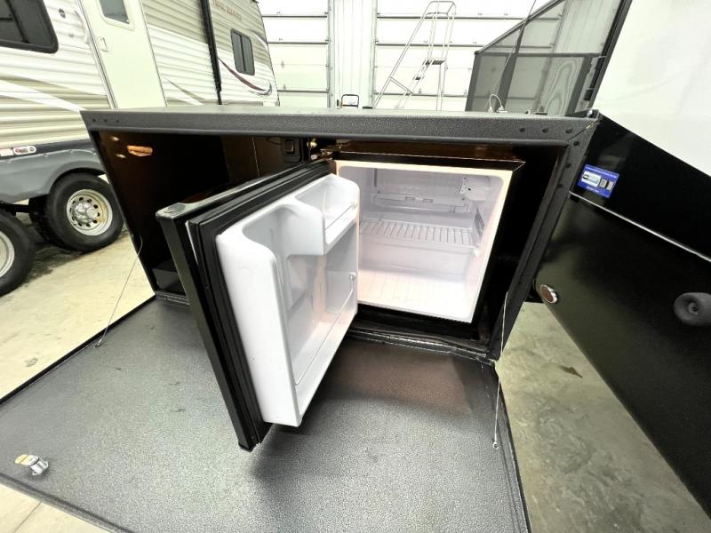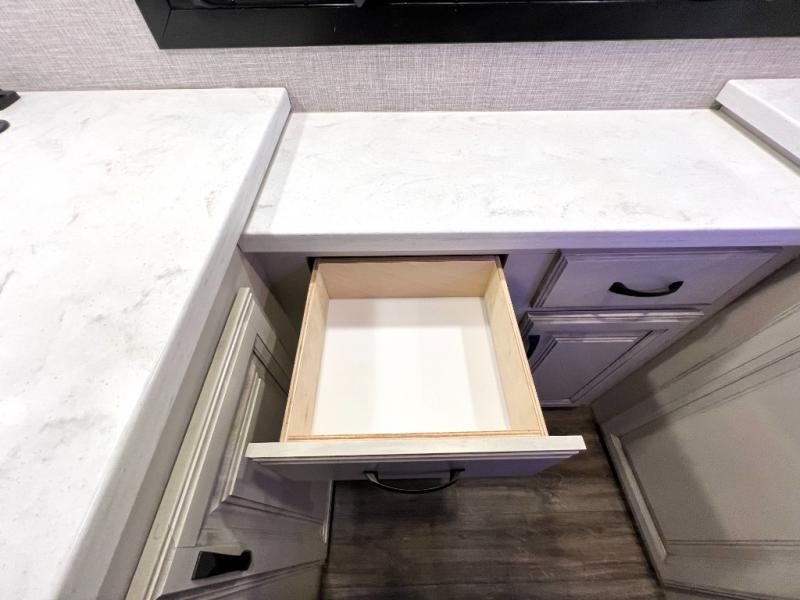 It's time to enjoy your toys and outdoor fun in this toy hauler! This separate garage offers an electric queen bed above rear convertible sofas, a second entry door, a half bath plus a place to add a washer/dryer option if you like. Your friends can have their own space when they join you. And the party deck will be a popular hangout everywhere you go! The separate living and kitchen area offers patio doors to get to the side patio party deck with an exterior TV so you can relax above ground while outdoors. Back inside you will have a SuperSofa with heat, massage, recliners, cupholders and LED lighting to enjoy while watching the Smart LED HDTV with a fireplace below. The chef will have a U-shaped countertop with all the kitchen amenities such as a 30" residential microwave, and the refrigerator is just a few steps away. Everyone can take turns getting cleaned up in the inventive side-aisle bath with a walk-in shower. The front master bedroom has a walk-around king bed for all-around comfort, plus a slide out with a dresser and two wardrobes that stretches into the hallway.