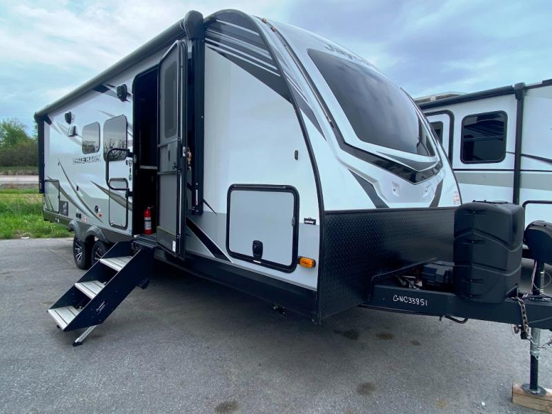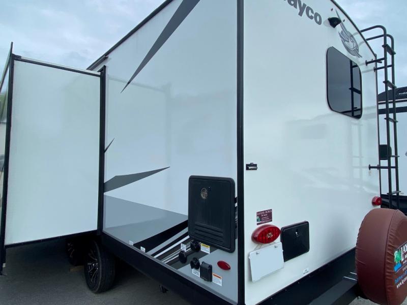 The lightweight White Hawk travel trailers by Jayco will blow you away with their roomy interiors, luxurious amenities, and durable construction. The Magnum Truss Roof System can withstand 50% more weight than the competition, and the Stronghold VBL lamination is the lightest, yet strongest in the industry. Each model includes the JAYCOMMAND "Smart RV" system with a tire pressure monitor system, plus American-made Goodyear tires for maximum durability and carrying capacity. You will love the sleek look of the front molded fiberglass cap with an automotive windshield and blue LED accent lighting, along with the frameless windows and automotive-style aluminum rims. The White Hawk travel trailers also include an arched interior ceiling, a kitchen skylight with a shade, residential vinyl flooring with cold crack resistance, and an electric fireplace.